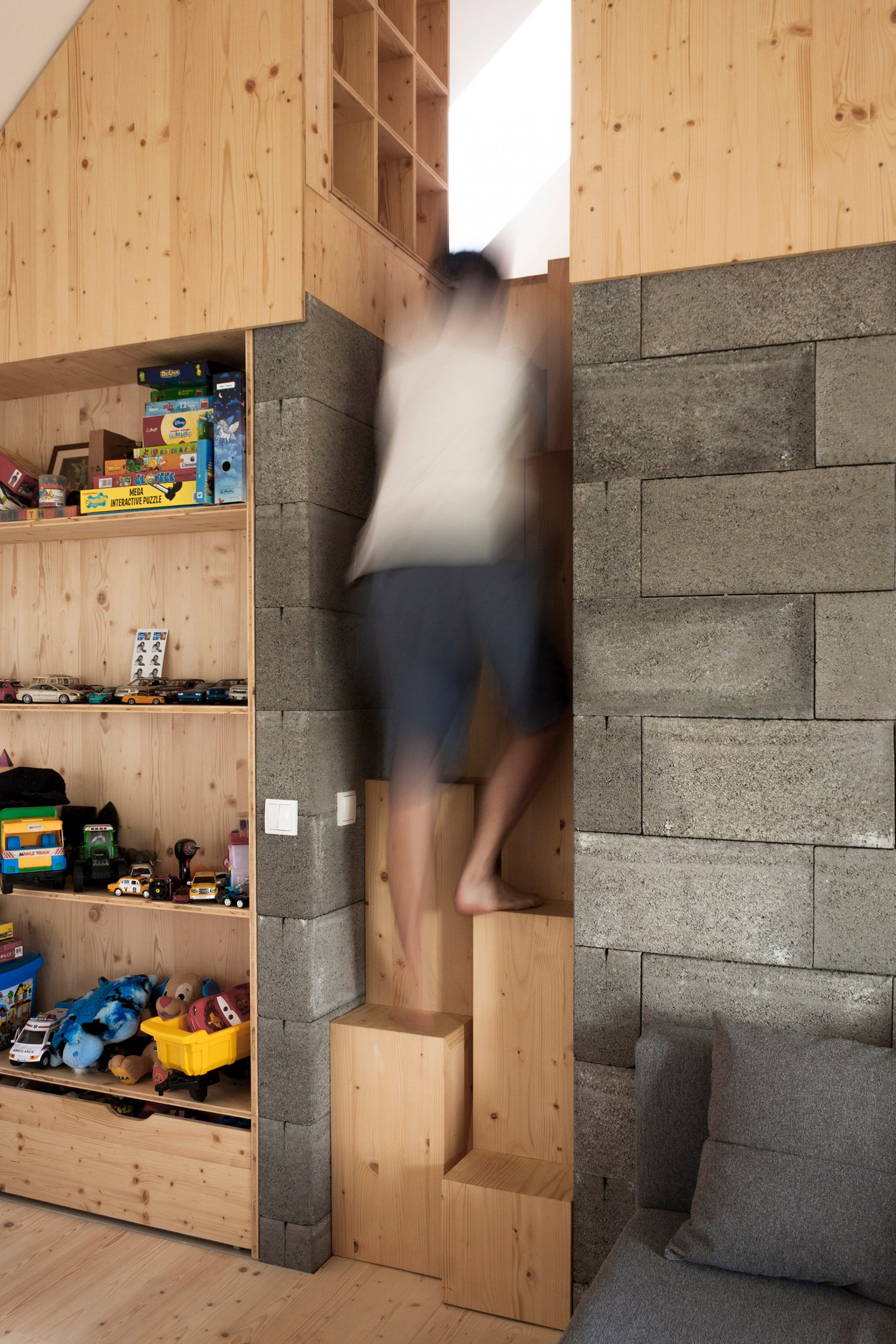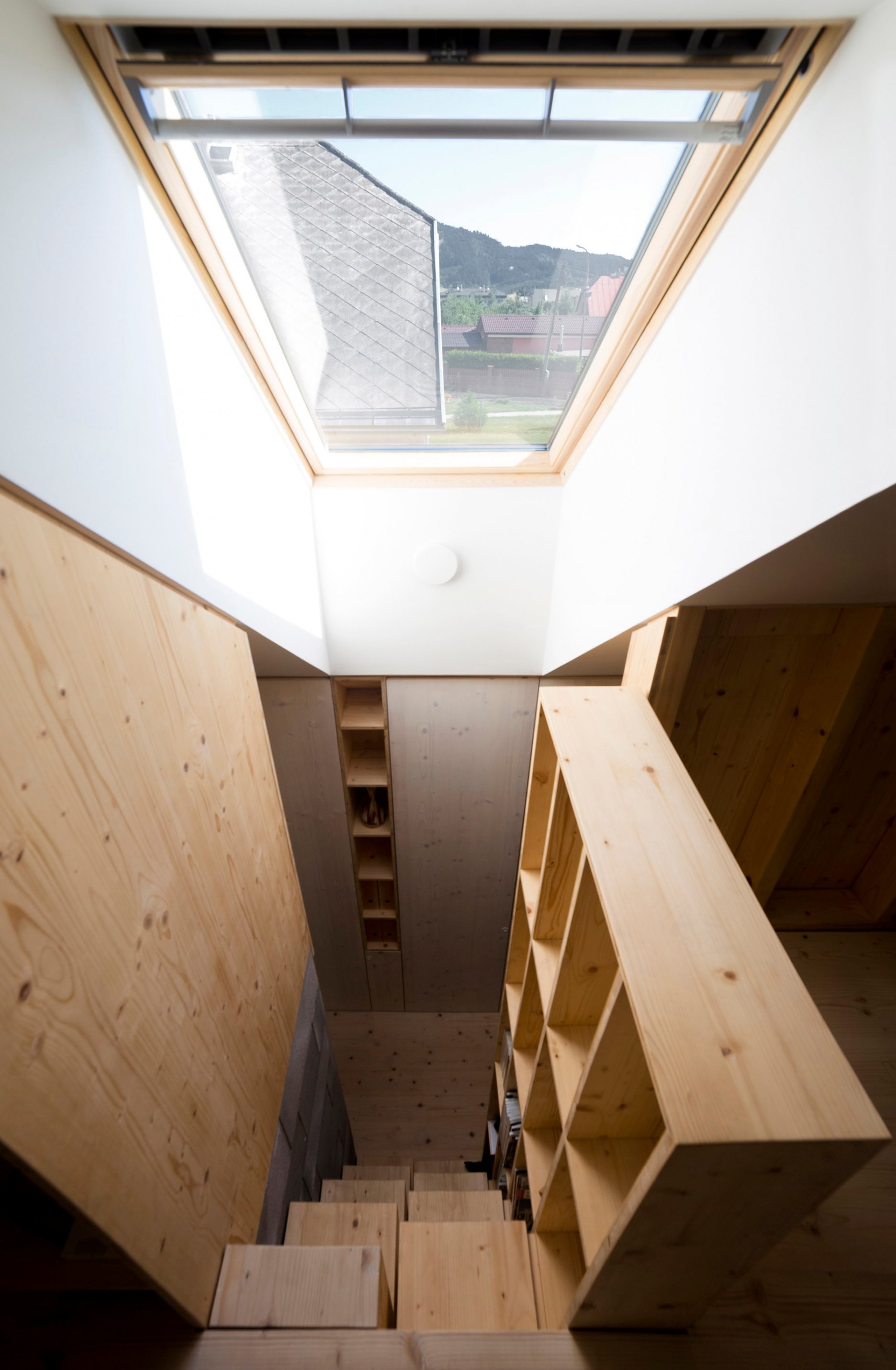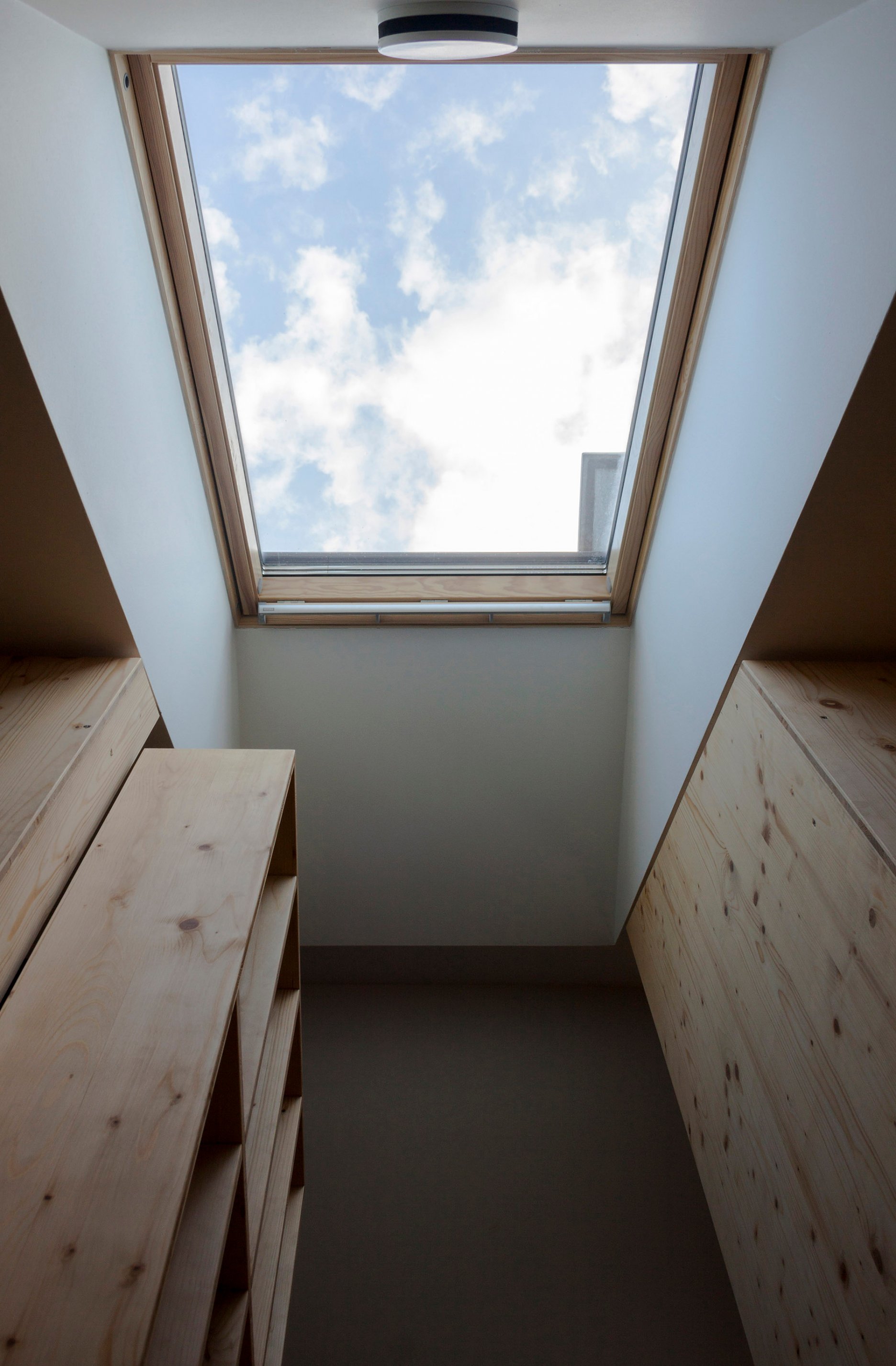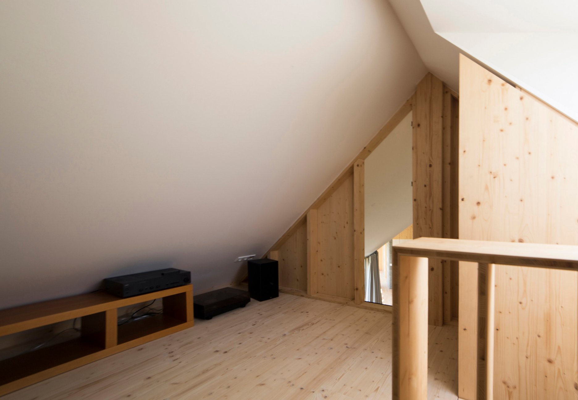Dva doplnkové priestory pod strechou ponúkajú útek od extrovertných priestorov v spodnej časti domu do súkromia. Detská izba je tak rozšírená o priestor na hranie, ktorý ponúka maximálnu slobodu v definovaní hier. Izba bližšie k rodičovskej, je využívaná ako relaxačný priestor, alternatívna pracovňa a hosťovská izba zároveň. Oba izby sú presvetlené strešnými oknami a tiež majú otvor do centrálneho priestoru domu. Strešné okno v detskej izbe je orientované smerom na historickú ikonu mesta, Hrad Ľubovňa a ponúka tak jeden z najvyhľadávanejších pohľadov v meste.