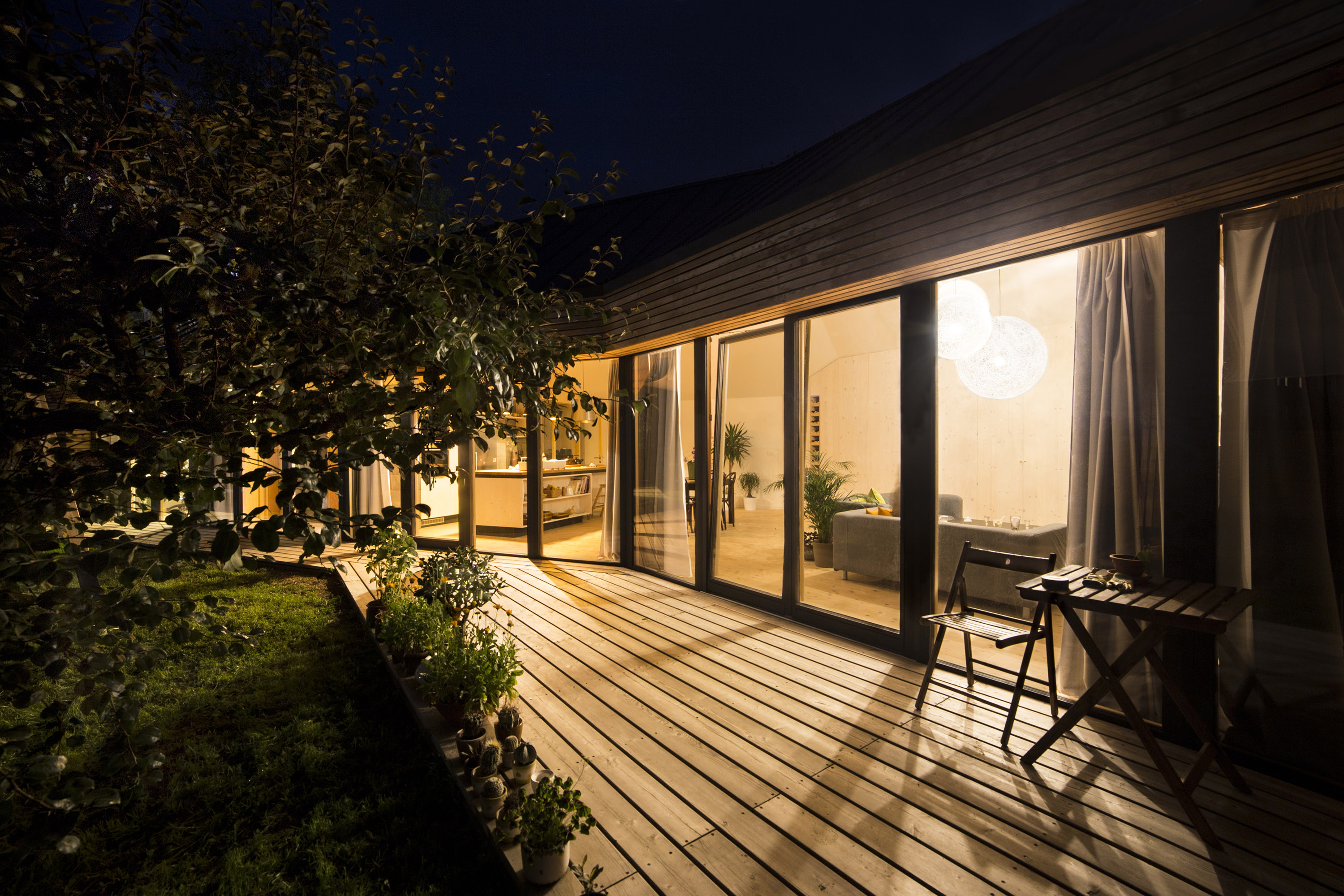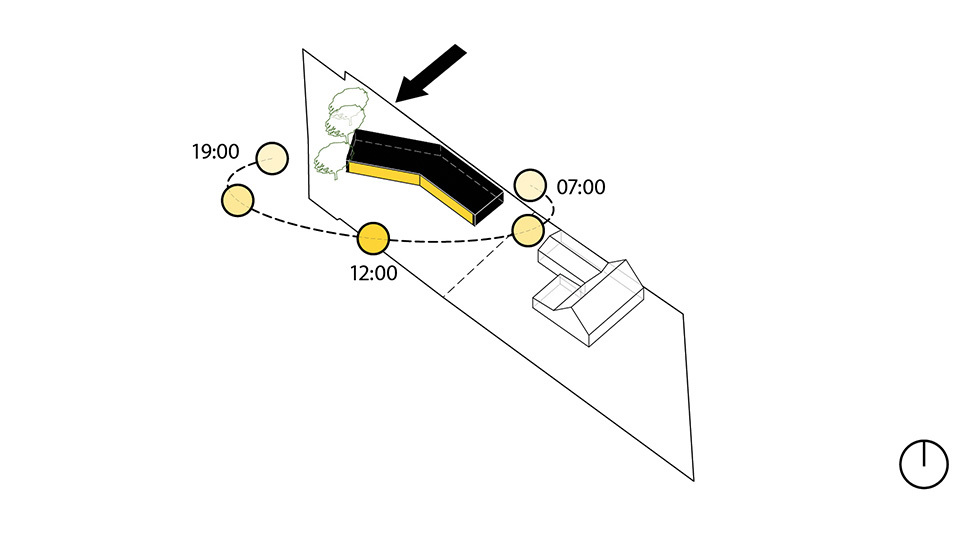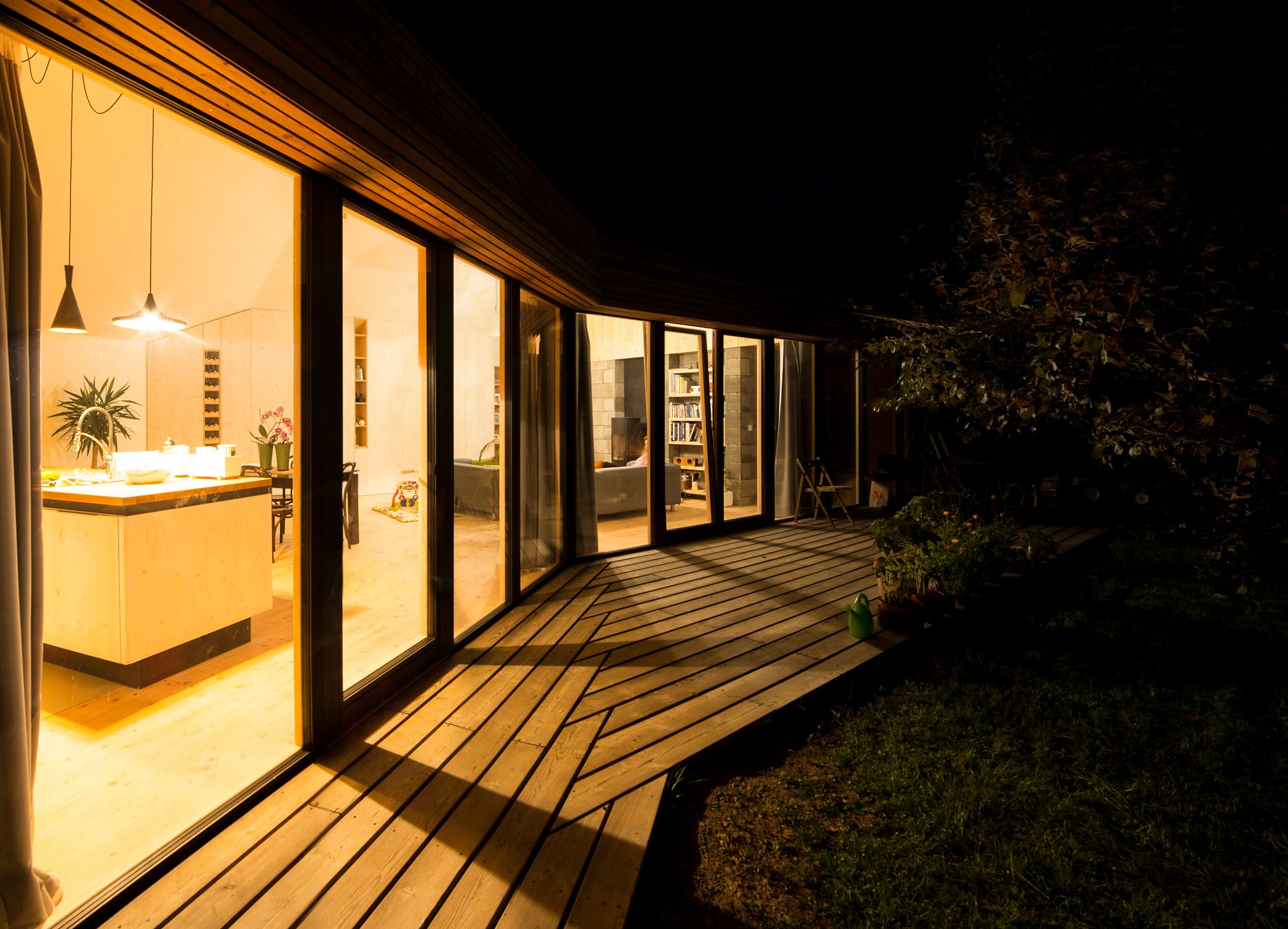 Veľkorysý, južne orientované otvor pomáha prirodzenému nahrievaniu priestoru a tak je energetická potreba na vykurovanie v zime minimalizovaná. Steny z betónových tvárnic, popri nosnej funkcii, slúžia ako akumulačné bloky na uskladnenie tepelných ziskov zo slnečného žiarenia. Drevená prevetrávaná fasáda, dvojitá prevetrávaná strecha, existujúce stromy a doplnkové tienenie pomáhajú proti prehrievaniu domu v lete. V prípade extrémne horúcich dní je možnosť dom vyvetrať prievanom cez strešné okná.