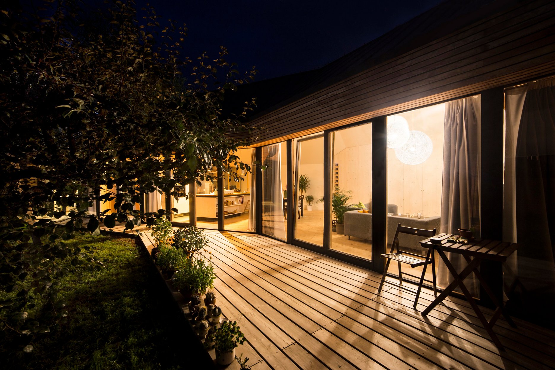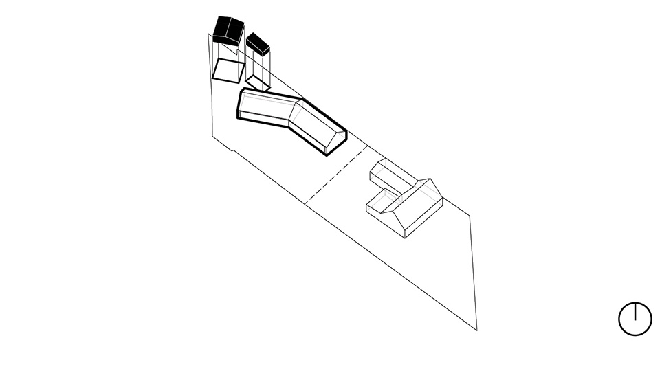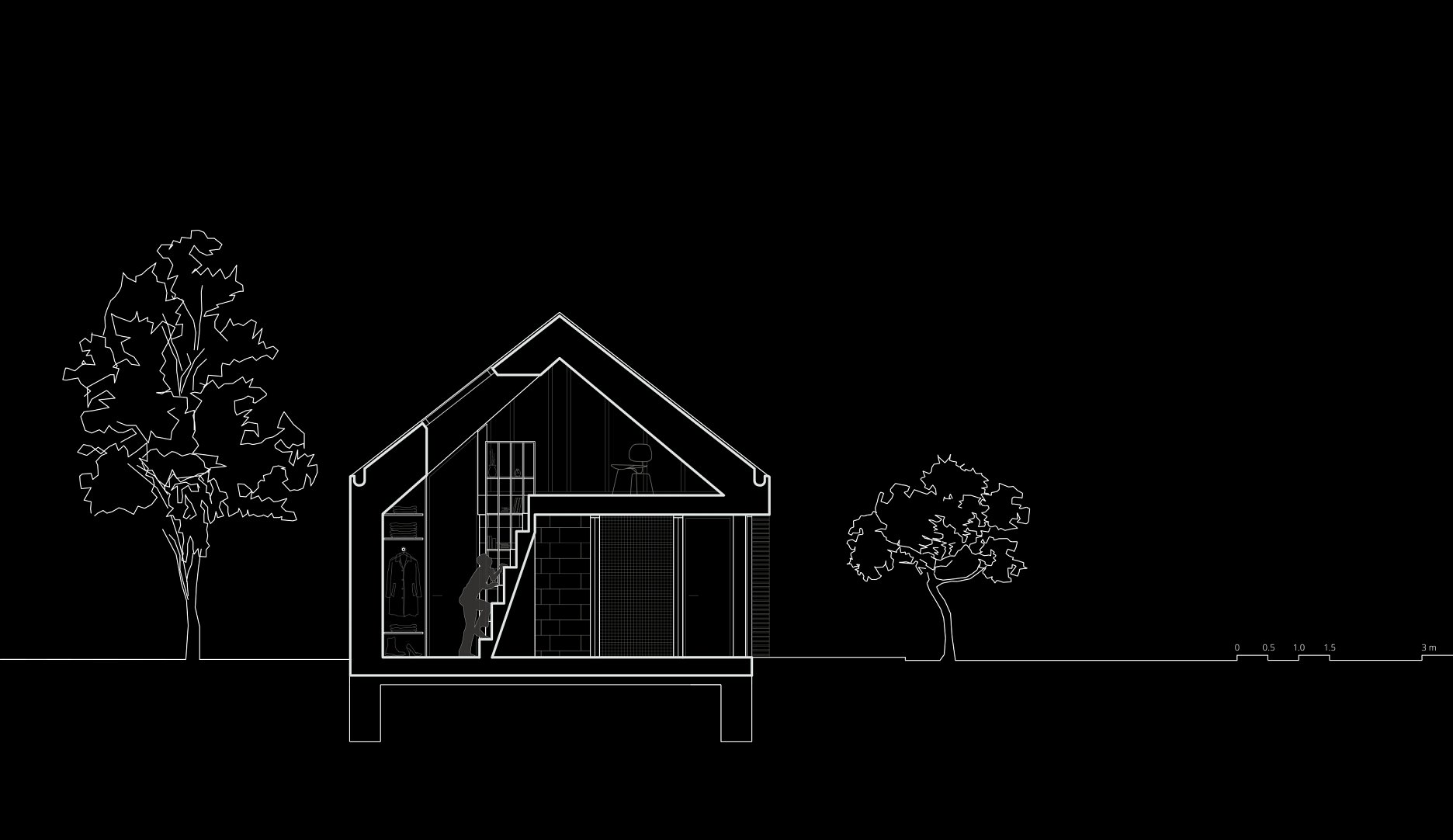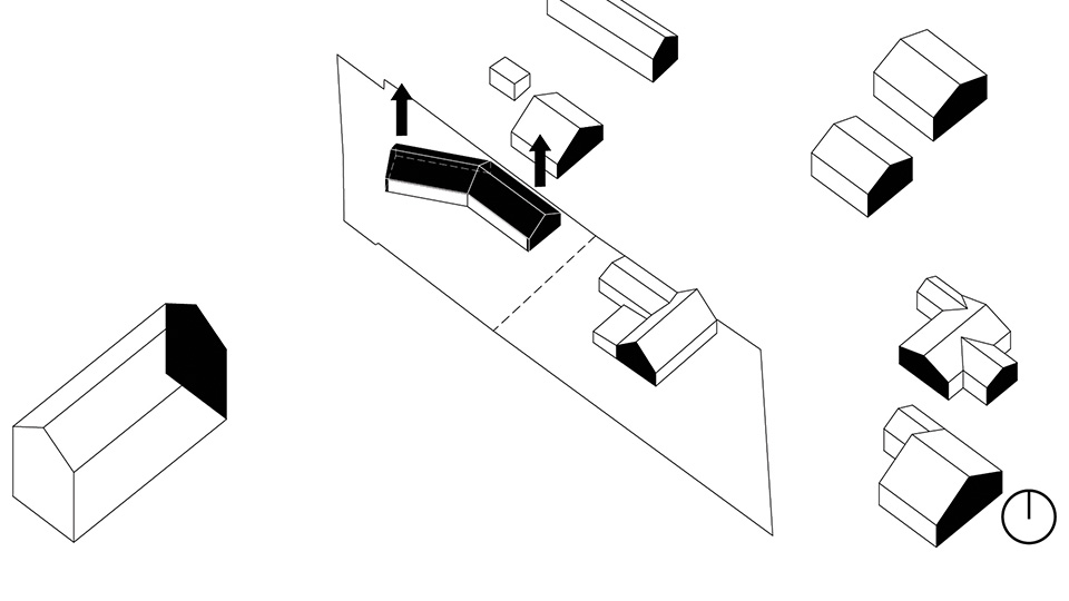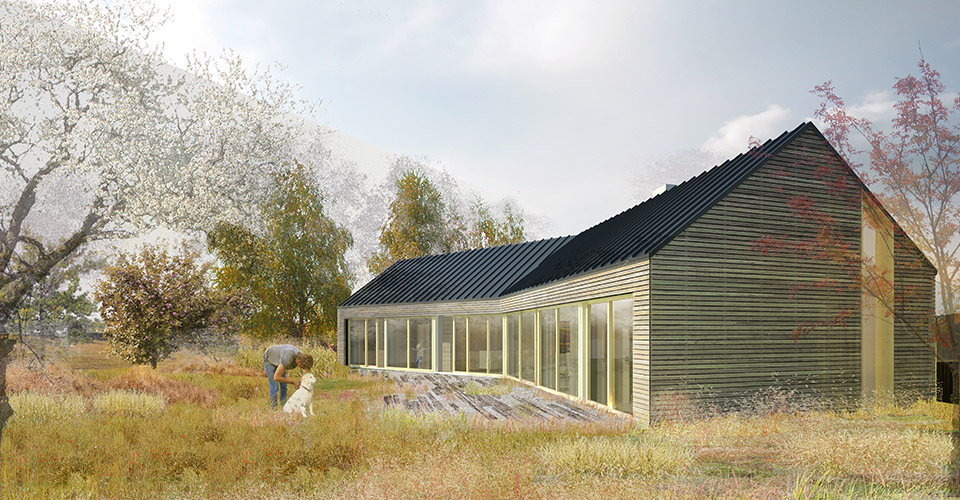 Figuratívna forma stodoly a domu je natiahnutá pozdĺž severného okraja pozemku, a kvôli zvýšeniu pasívnych solárnych ziskov zalomená v strede. Sklenená fasáda pozdĺž južnej časti domu, ponúka maximálne spojenie so záhradou a tvorí minimálnu bariéru medzi interiérom a exteriérom. Jedným zo zachovaných ovocných stromov v záhrade je stará hruška, ktorá popri úrode, slúži ako prirodzené tienenie pre terasu. Terasa je kontinuálnym pokračovaním vnútornej podlahy do záhrady.