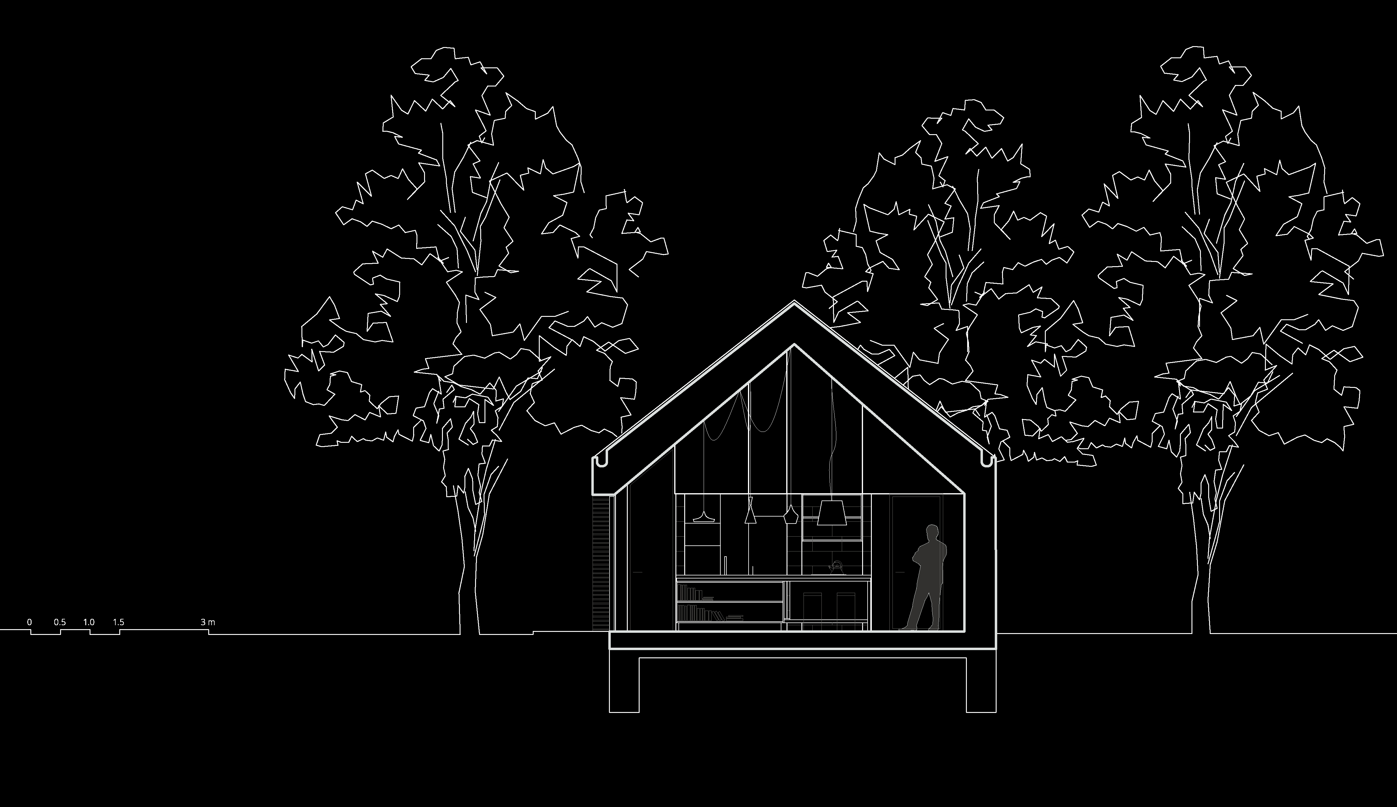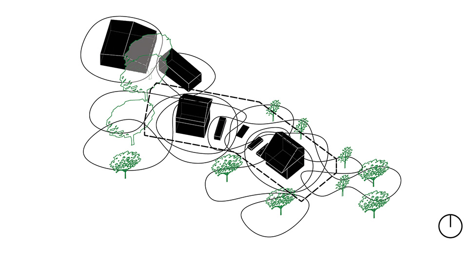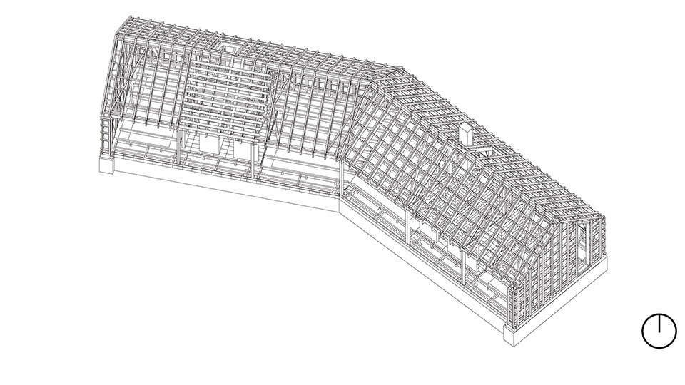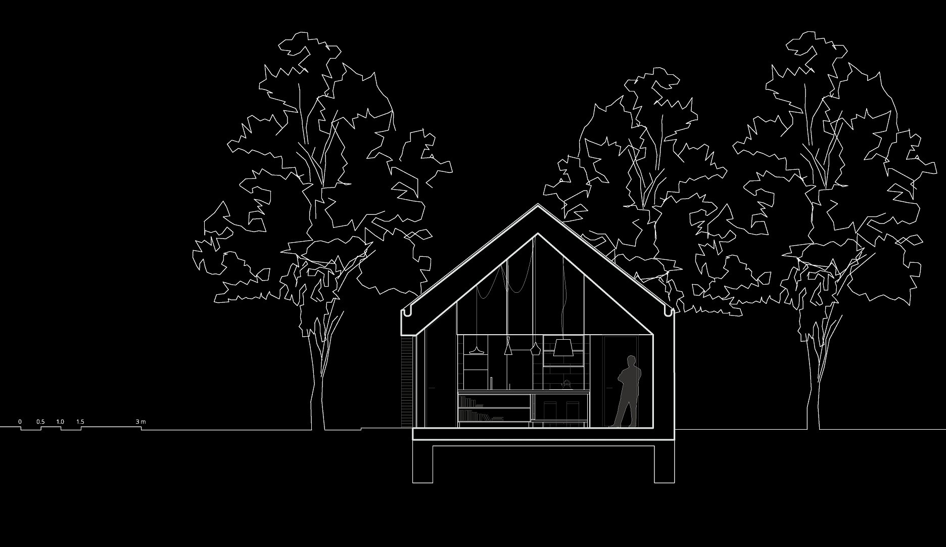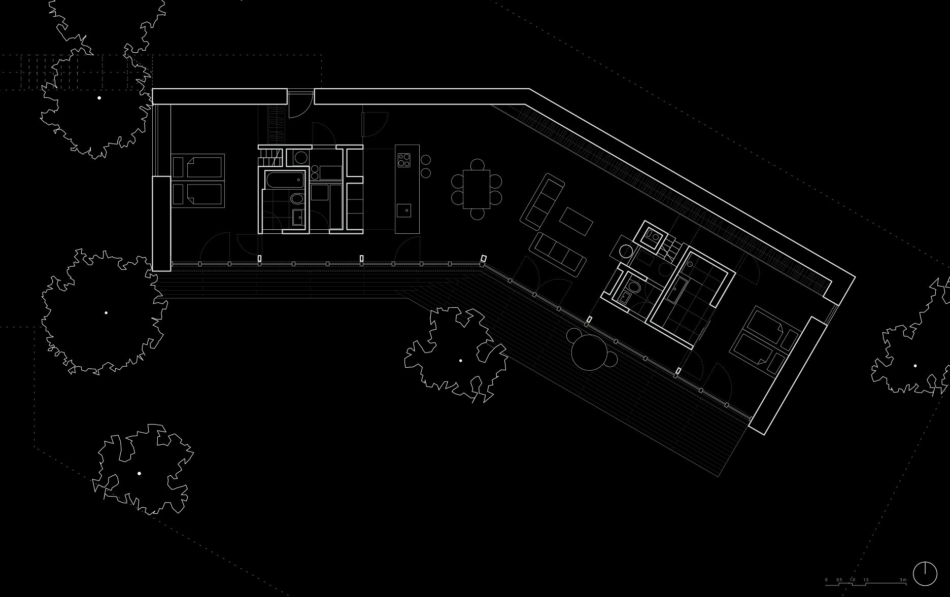 Figuratívna forma stodoly a domu je natiahnutá pozdĺž severného okraja pozemku, a kvôli zvýšeniu pasívnych solárnych ziskov zalomená v strede. Sklenená fasáda pozdĺž južnej časti domu, ponúka maximálne spojenie so záhradou a tvorí minimálnu bariéru medzi interiérom a exteriérom. Jedným zo zachovaných ovocných stromov v záhrade je stará hruška, ktorá popri úrode, slúži ako prirodzené tienenie pre terasu. Terasa je kontinuálnym pokračovaním vnútornej podlahy do záhrady.
