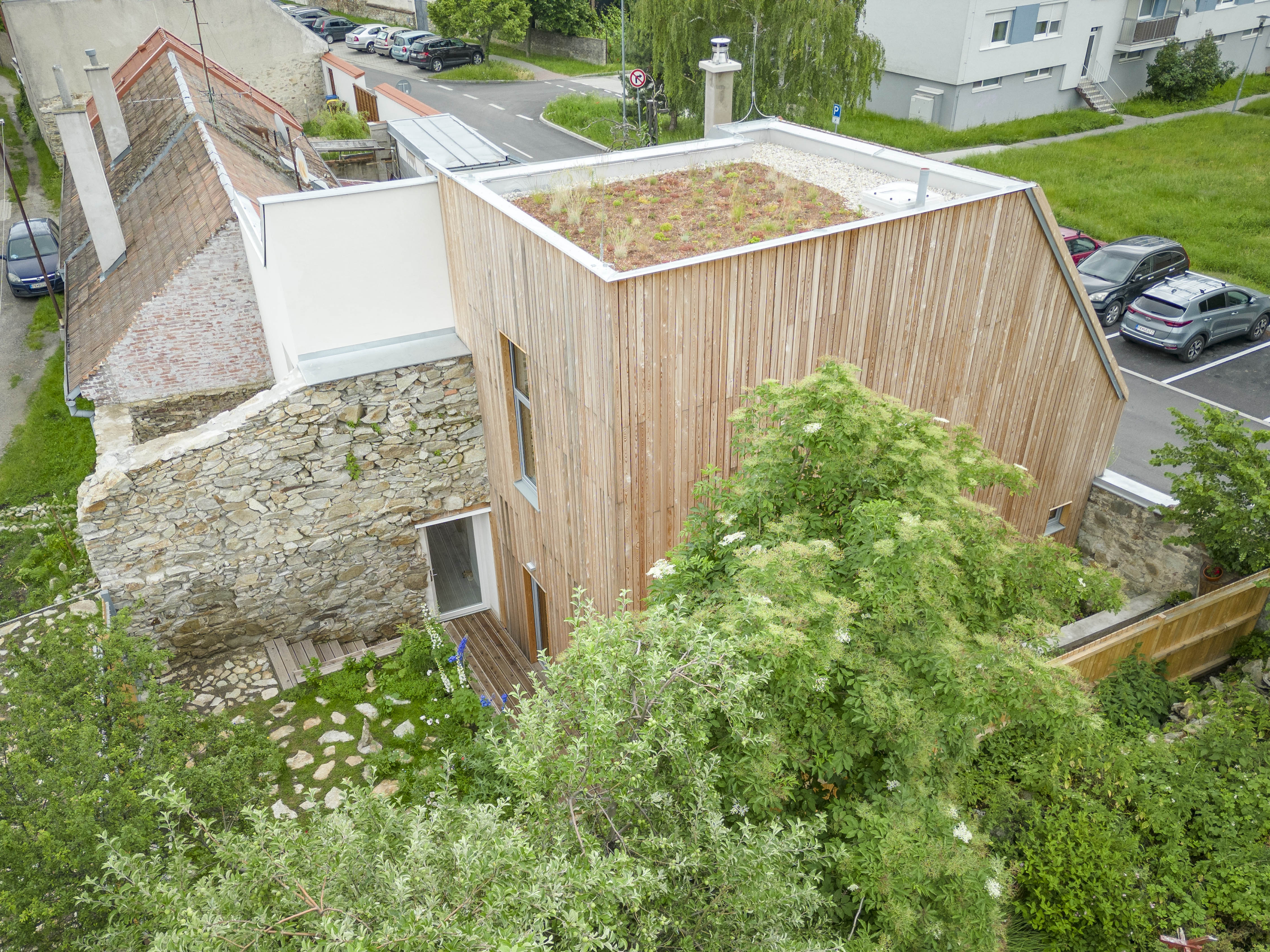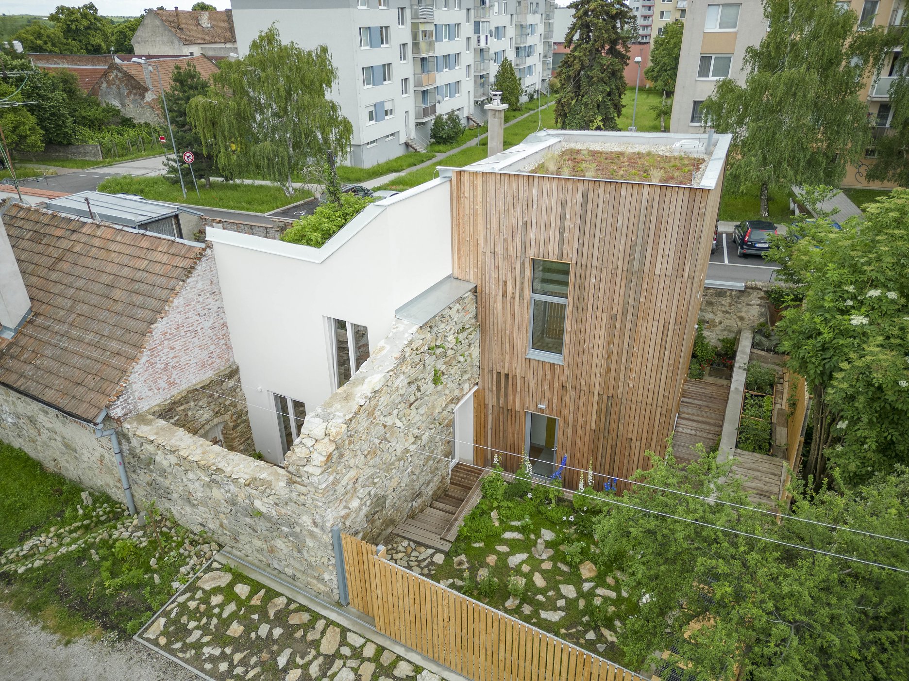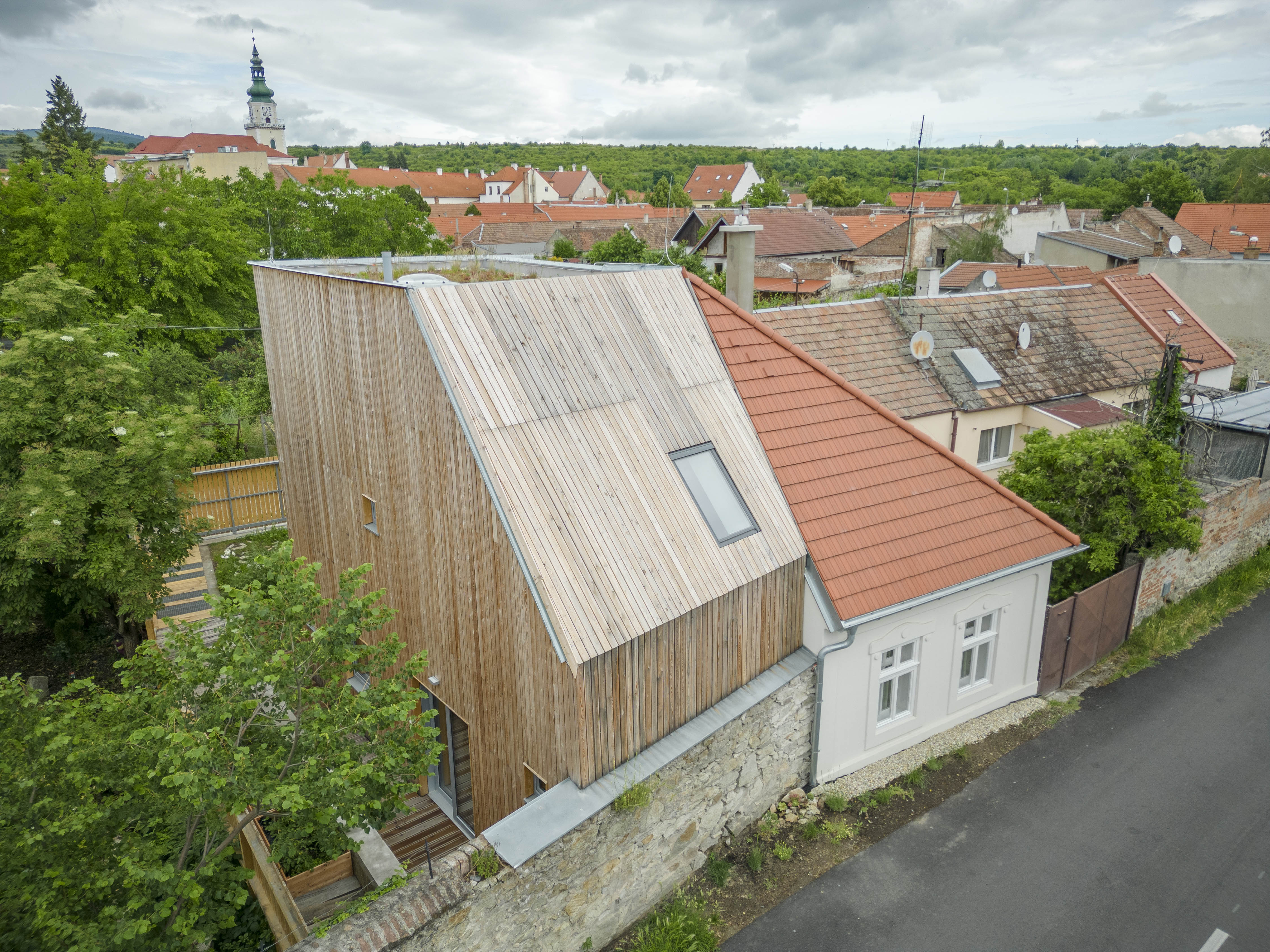 Dvojgeneračné bývanie. Dva výrazne odlišné objekty. Dva rozdielne "svety", ktoré dokážu fungovať ako prepojený celok. Dom z 19. storočia, ktorý sa napriek narušenej statike podarilo zachrániť, doplnil novotvar v dotyku so zachovaným fragmentom mestských hradieb.