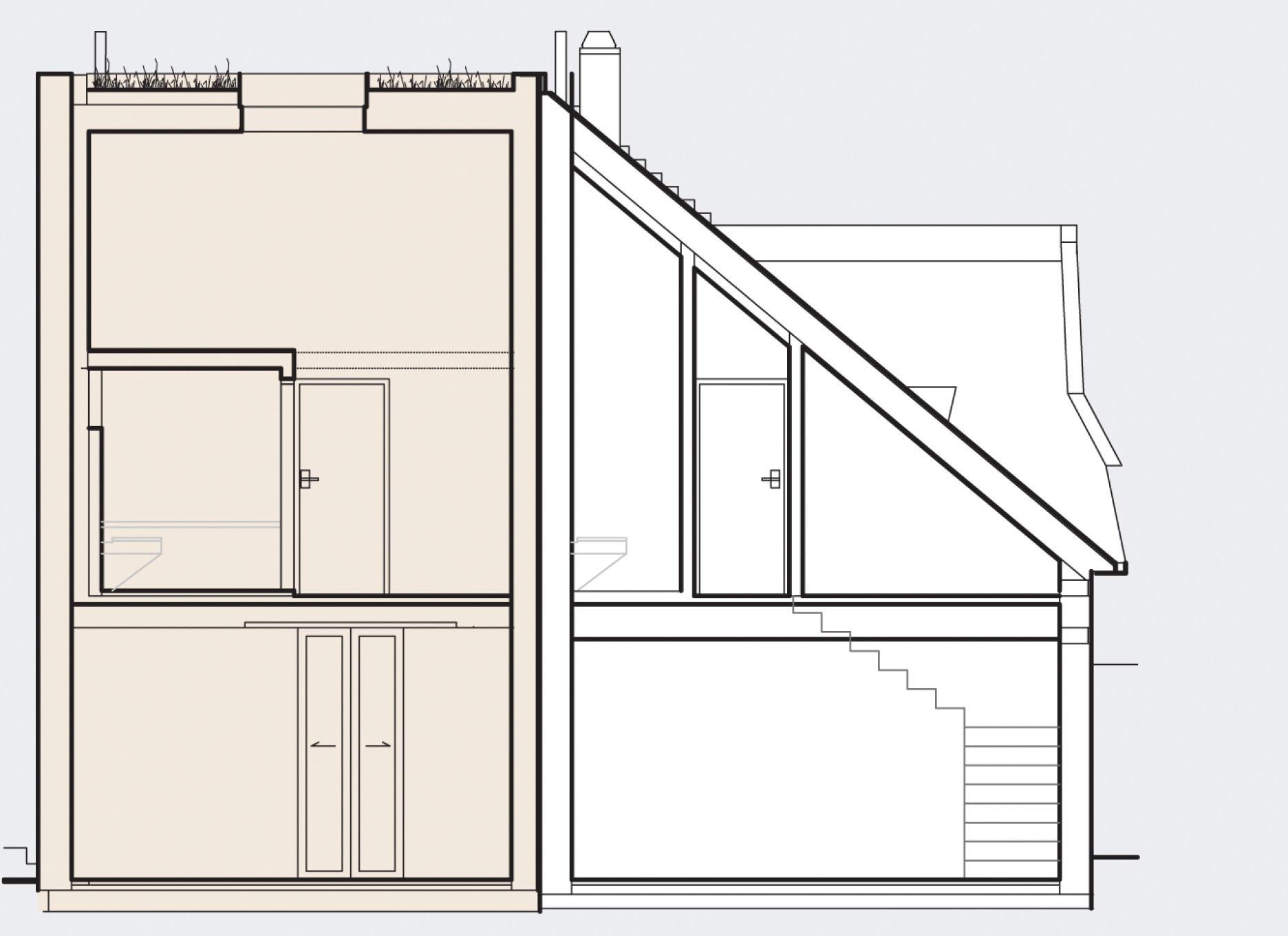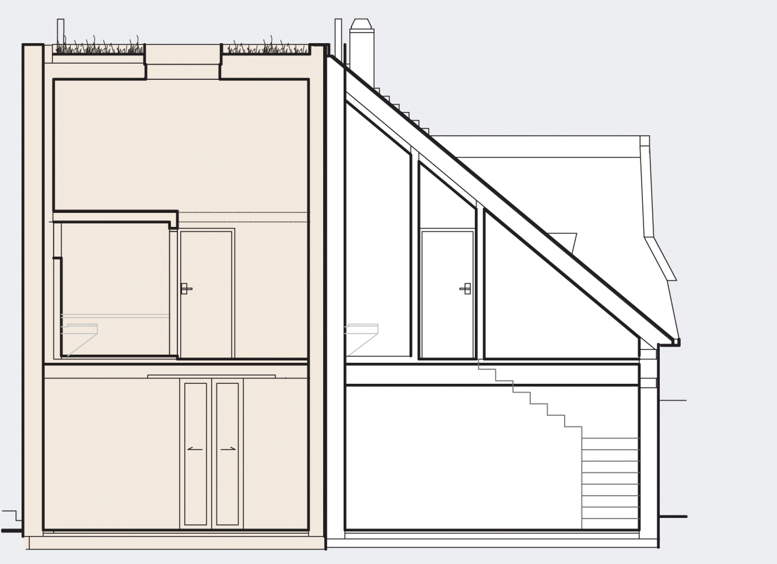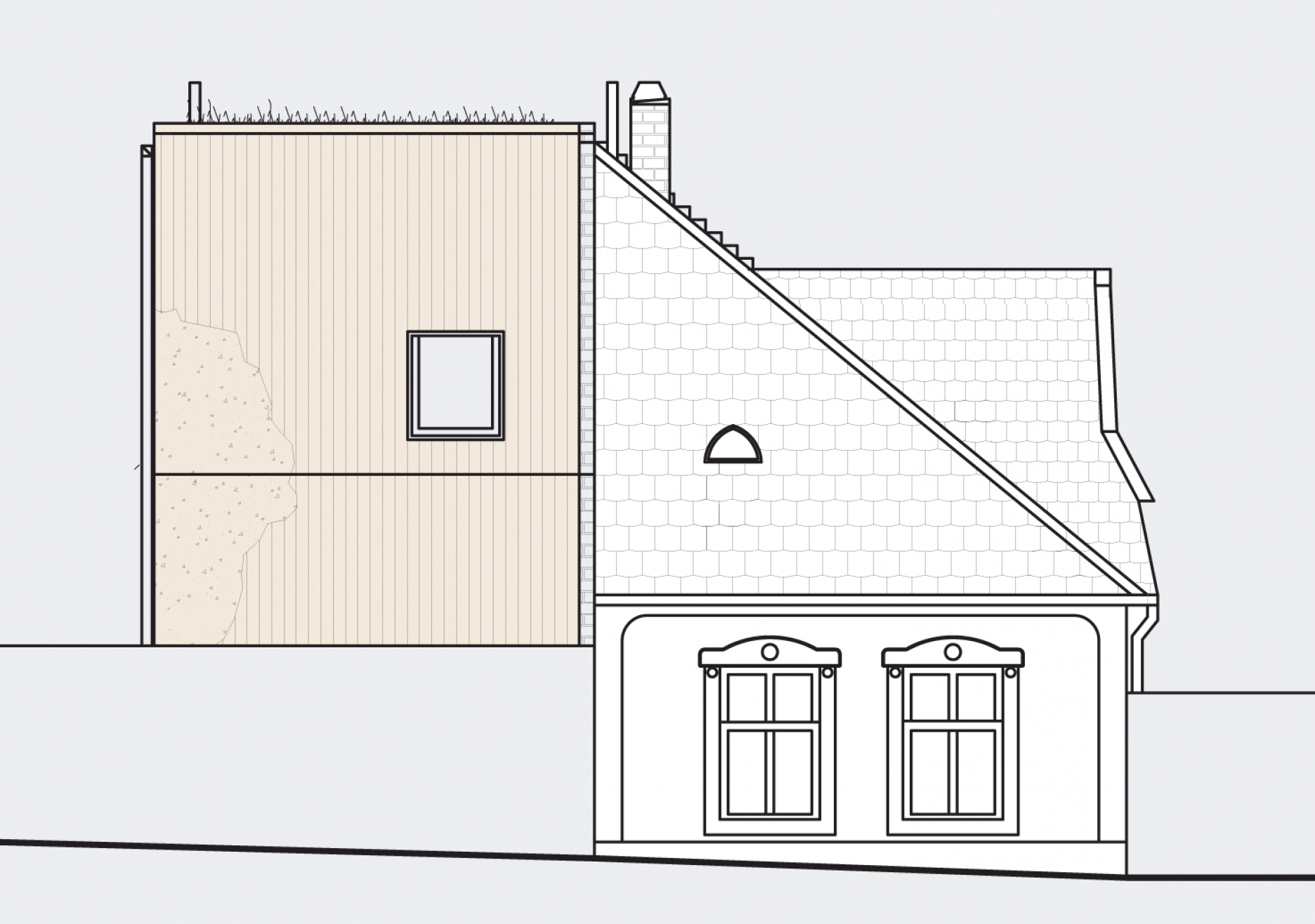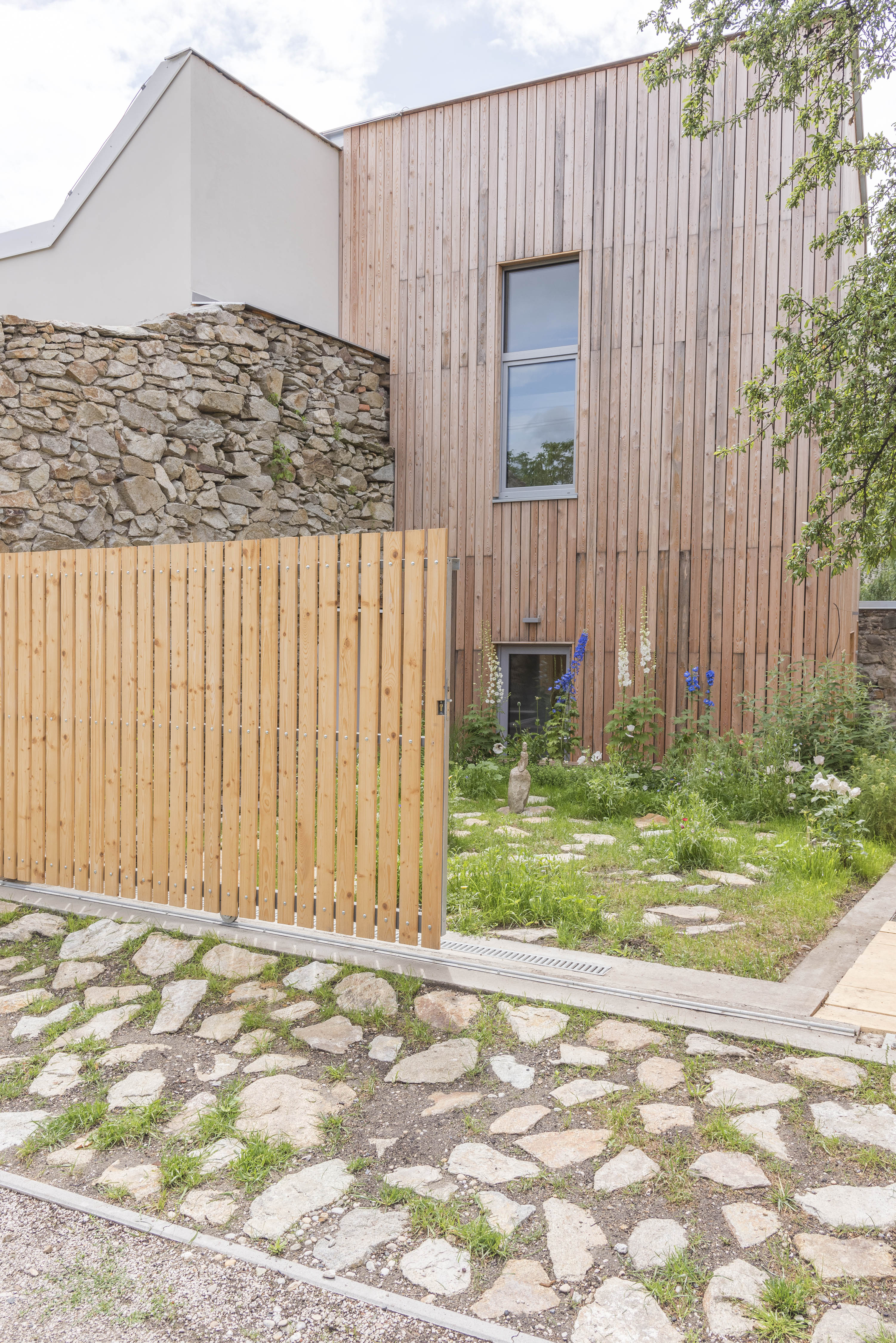 Dvojgeneračné bývanie. Dva výrazne odlišné objekty. Dva rozdielne "svety", ktoré dokážu fungovať ako prepojený celok. Dom z 19. storočia, ktorý sa napriek narušenej statike podarilo zachrániť, doplnil novotvar v dotyku so zachovaným fragmentom mestských hradieb.