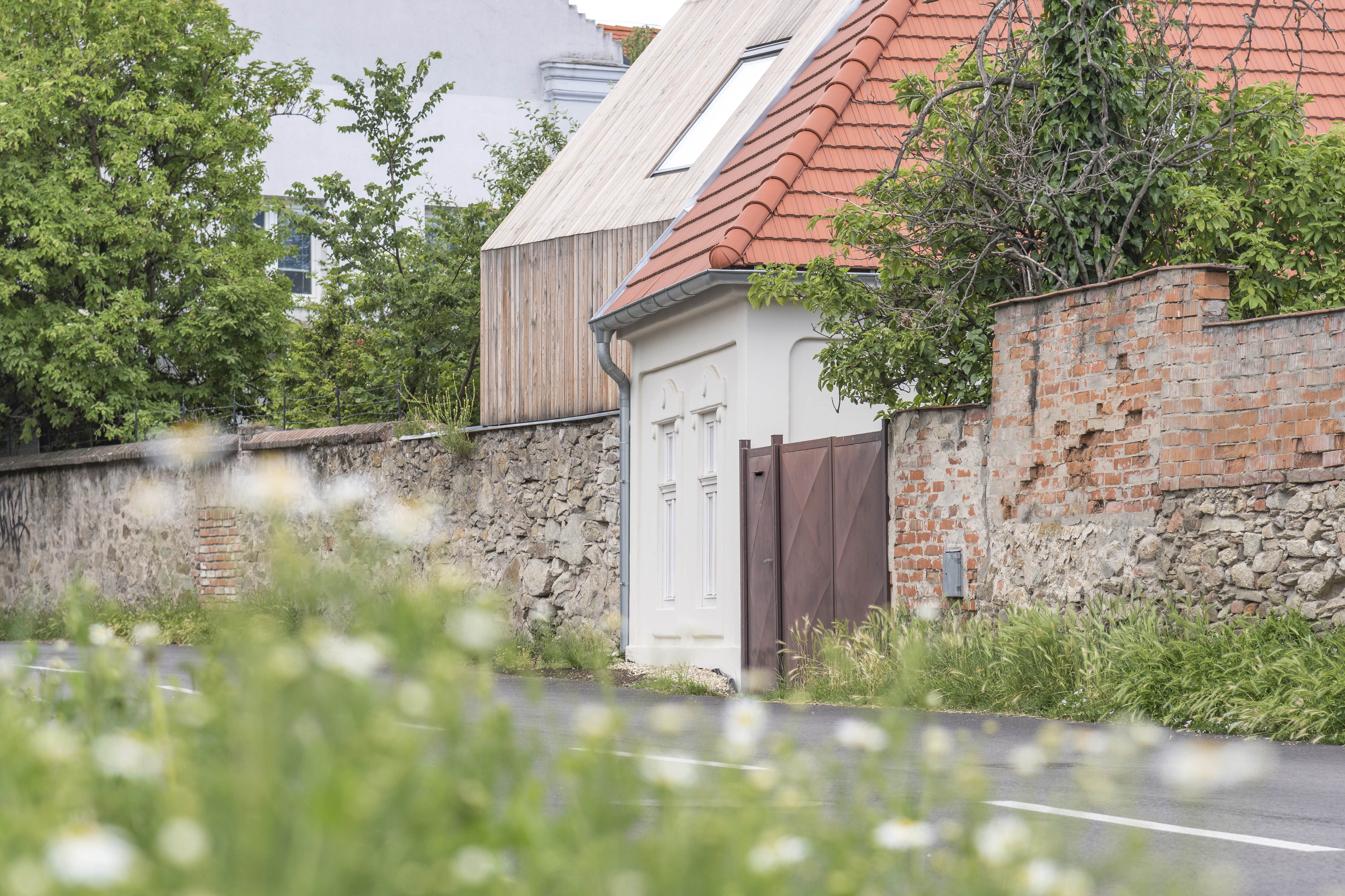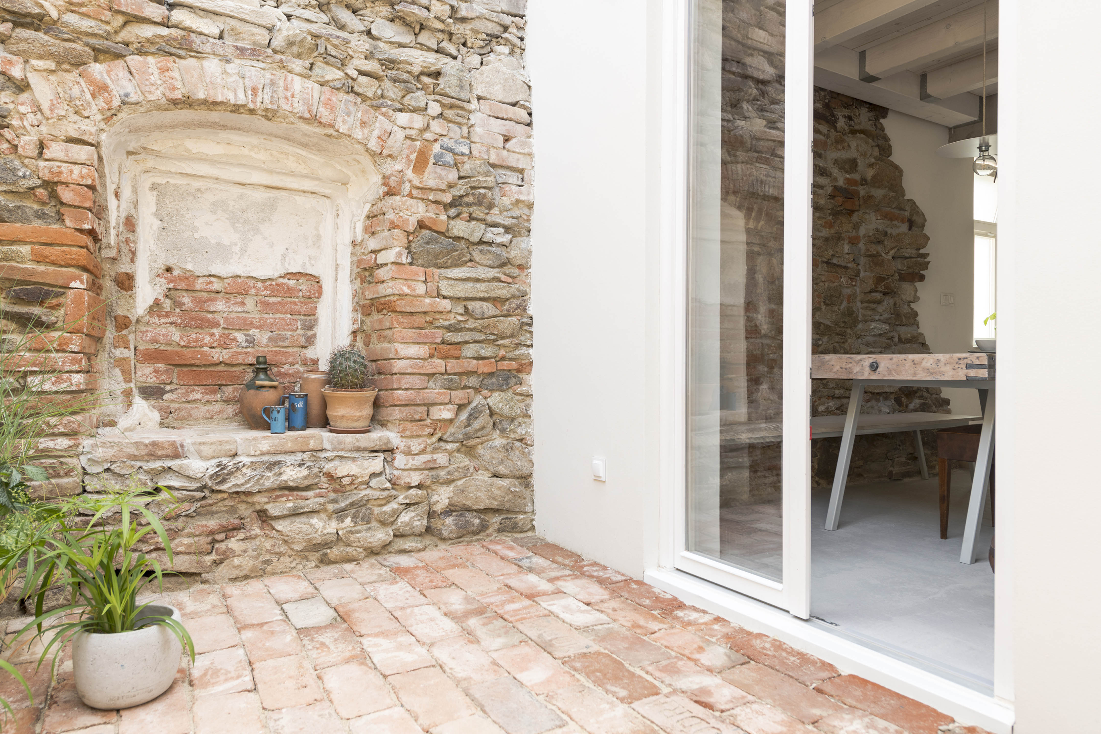 JK: Rekonštrukcia starého domu sa mala držať v pôvodnom duchu. Okrem predpísaného archeologického prieskumu sme absolvovali aj prieskum, ktorý zadefinoval obnovu odkrytých pôvodných tehál na štítových stenách, špárovaciu techniku pri obnove hradby, zakonzervovanie odkrytých výklenkov s pôvodnými vrstvami malovky a mnoho ďalších vecí. Boli použité predpísané materiály - tehla, drevo a odkryté torzá pôvodných kamenných častí stien v interiéri. Väčšina konštrukcií pôvodného domu musela byť žiaľ kvôli ich stavu odstránená a nahradená. Všetky zachované tehly, kamene, aj kamene z výkopov a drevo z pôvodného krovu sme využili pri rekonštrukcii.