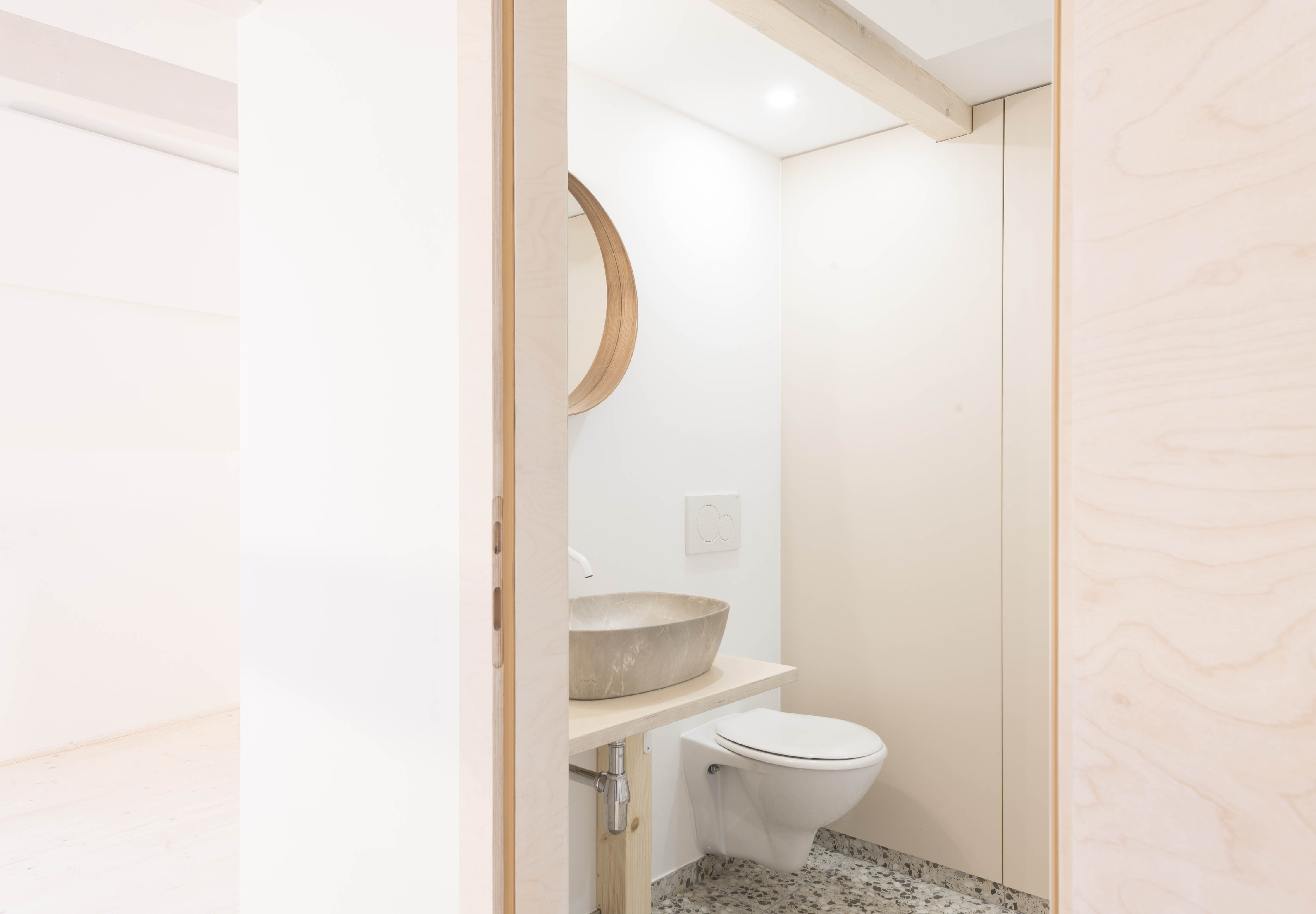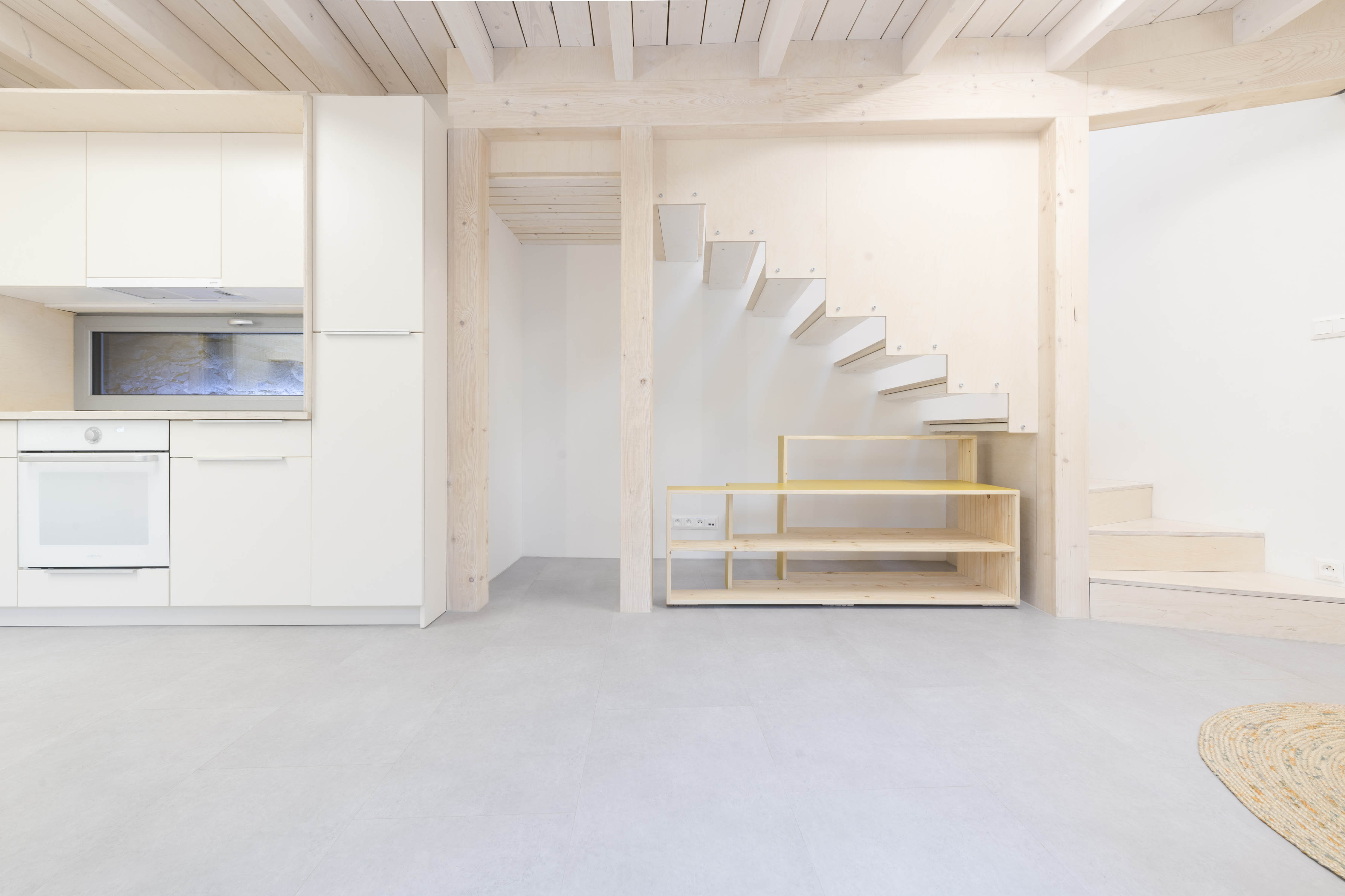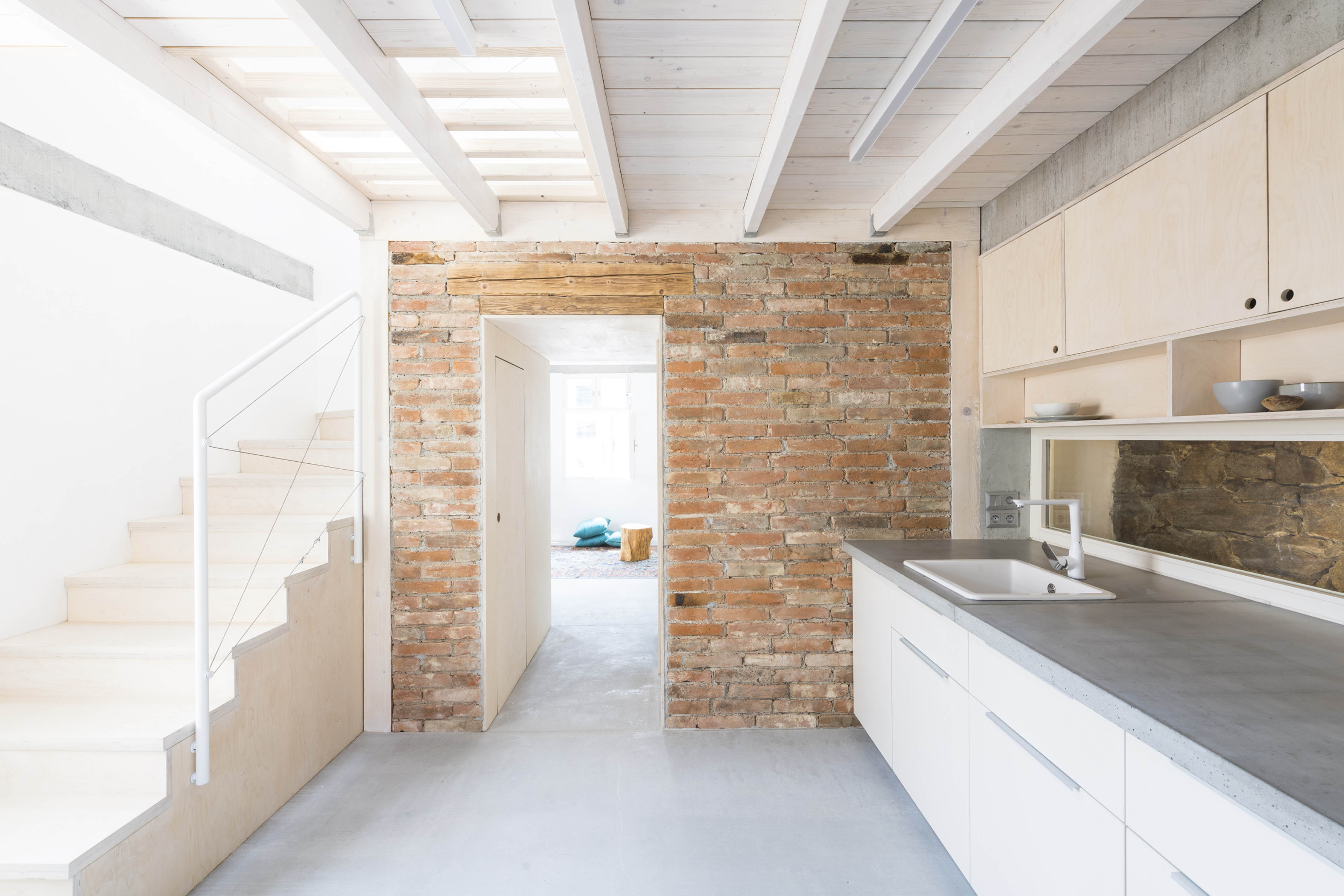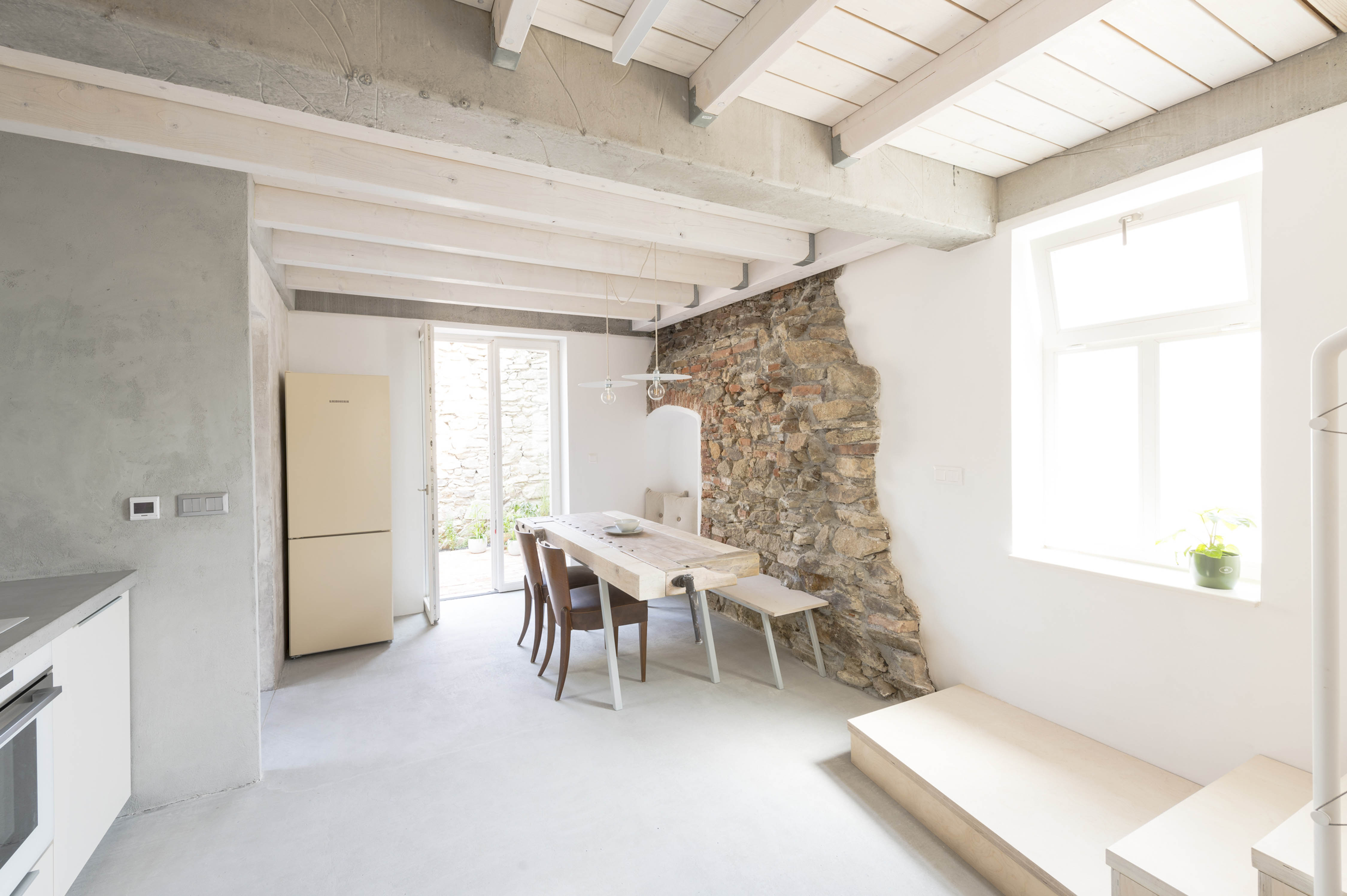 JK: Bývanie v zrekonštruovanom dome odkrýva všetky viditeľné aj neviditeľné artefakty minulosti, ktoré sa dali zachovať, alebo obnoviť. Je to súbor jednoduchých priestorov v klasickej dispozícii. Atmosféru vytvára práve možnosť priameho kontaktu s pôvodnými kusmi hmoty v rôznych časových horizontoch. Účelnosť stavebných objektov na bývanie už dávno "presluhuje". Preto, čo nám dom dovolil, to sme si dovolili my.