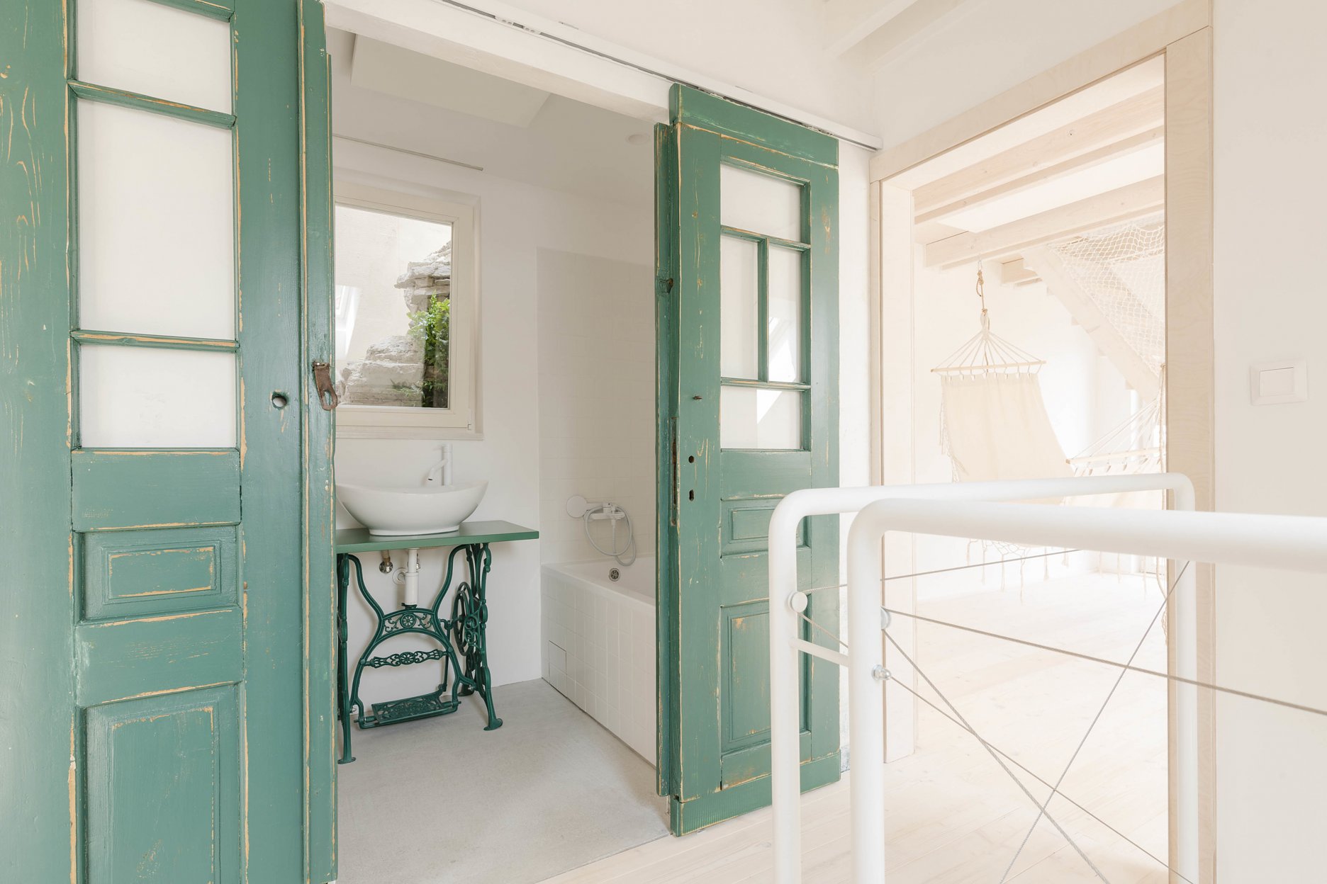 JK: Počas realizácie sa na stavbe zastavila pani, ktorá s manželom v dome kedysi bývala niekoľko rokov. Povedala nám, že úplne pôvodný dom patril vychýrenej modranskej krajčírke, ktorá bola hluchá. Napadlo jej to, keď sa zahľadela na stolík zo starej singerky, navrhnutý v hornej kúpeľni rekonštruovaného domu. Na pozemku, v pôvodnom vlastníctve židovskej obce, stál podľa písomných zmienok obradný objekt mikve, ktorý neskôr slúžil ako sklad.