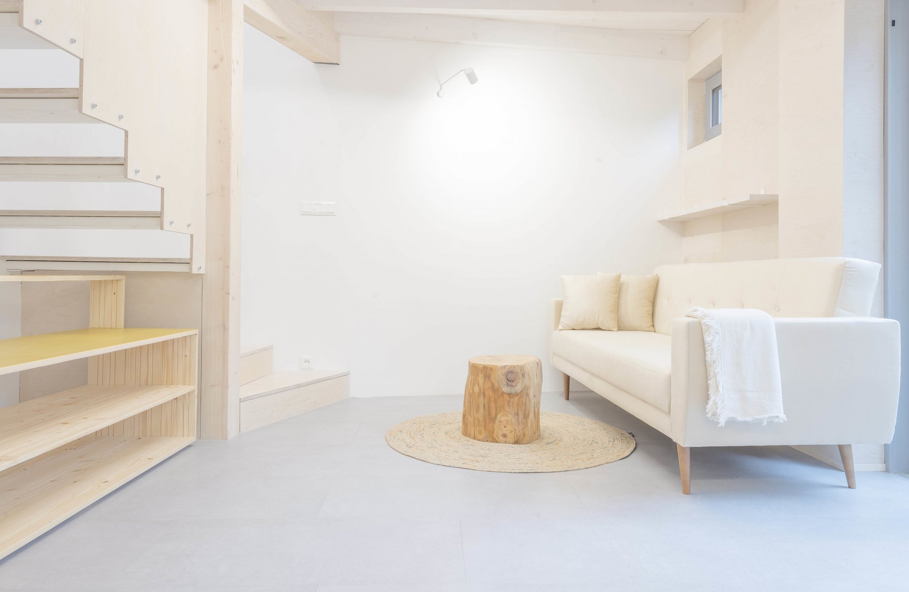 JK: V objekte drevodomu sme priehľady na hradobný múr tiež riešili prostredníctvom okien. Či už pri kuchynskej linke alebo v spálni. Pri schádzaní dole schodiskom možno vnímať kulisu panelového sídliska, ktorá natrvalo zmenila pôvodný charakter mesta. Drevený podhľad na úrovni prízemia vniesol do priestoru taktiež niečo pôvodné. Pamätám si, ako náš kolega k záveru odovzdávania interiéru vymyslel atypickú policu pod schody.