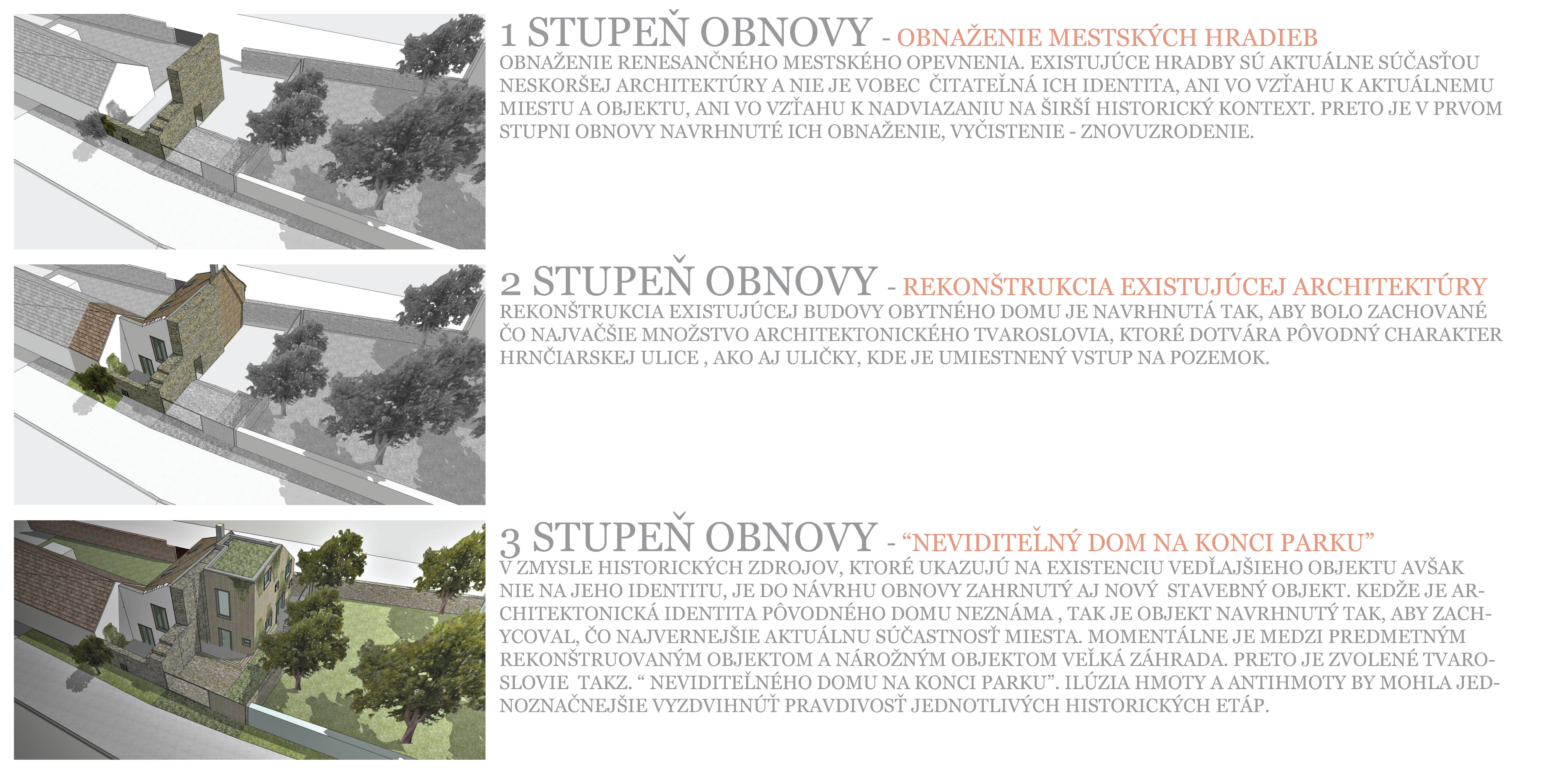 JK: Nová pôdorysná stopa objektu "neviditeľného domu" vznikla z rozuzlenia vzťahov medzi architektonicko - koncepčnými a pamiatkovými limitmi, obmedzeniami vyplývajúcimi z ochranného pásma odnože miestneho potoka a lokalizácie jediného možného povoleného vstupného otvoru cez mestskú hradbu.