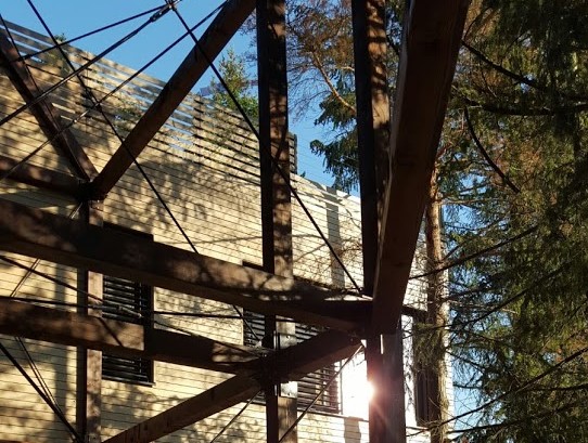 Mohutná drevená konštrukcia, postavená bez žeriavu, nesie exteriérové schodisko, tvorí rastúcu zelenú stenu ako bariéru od susedného domu, slúži na uchytenie hojdačiek a hlavne dotvára architektúru domu. Svojím vzhľadom umocňuje materialitu a návrat k prírode.