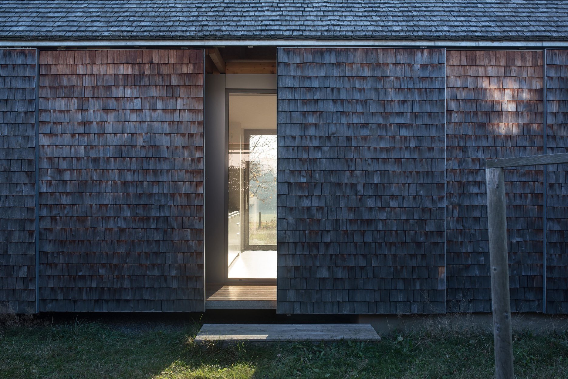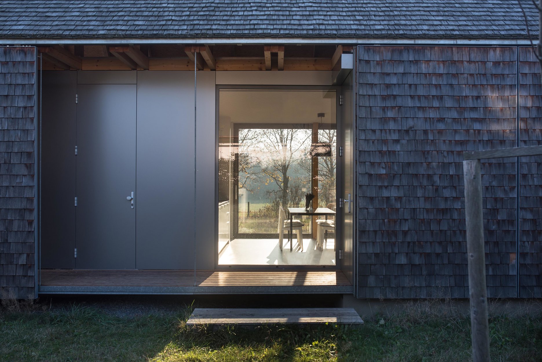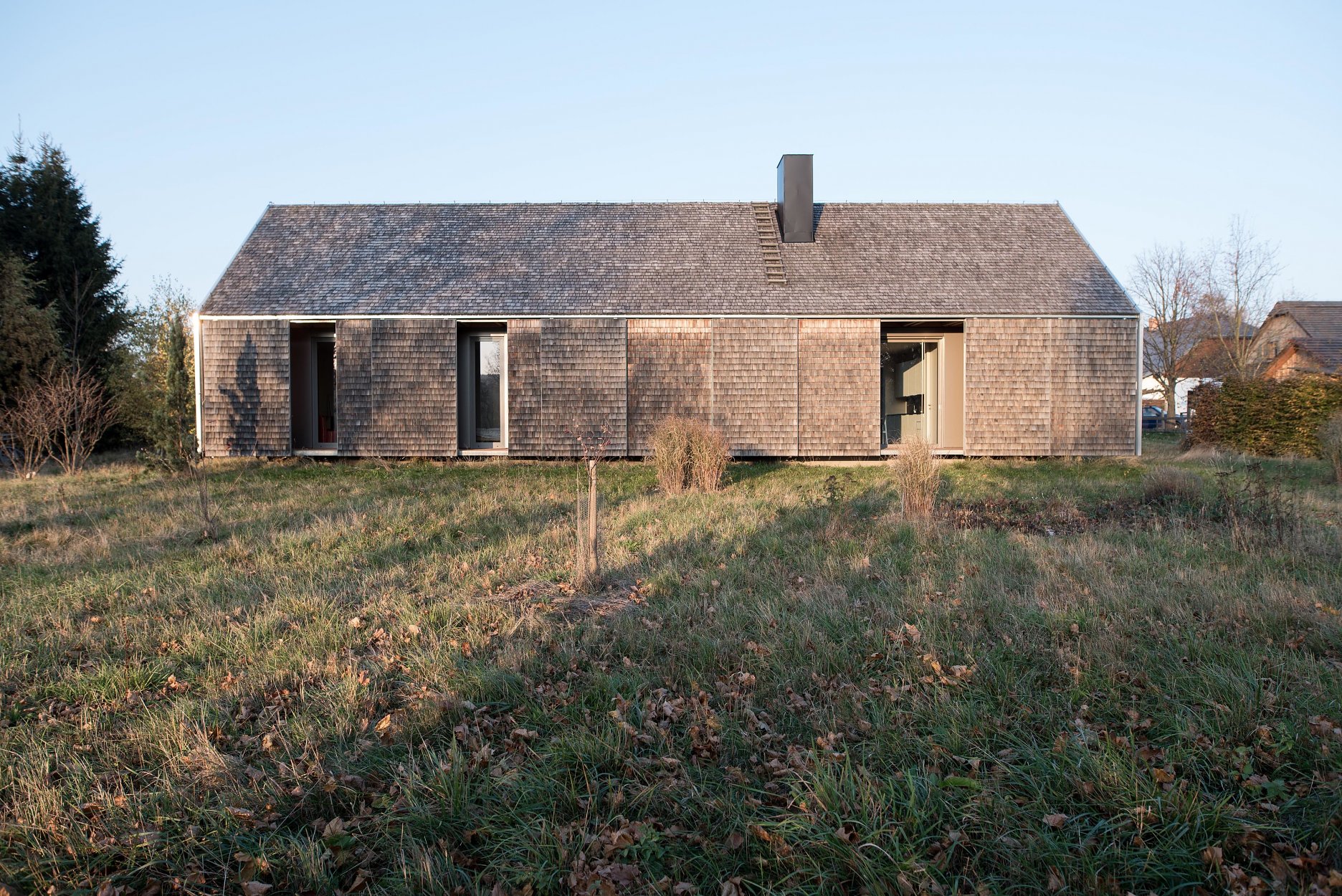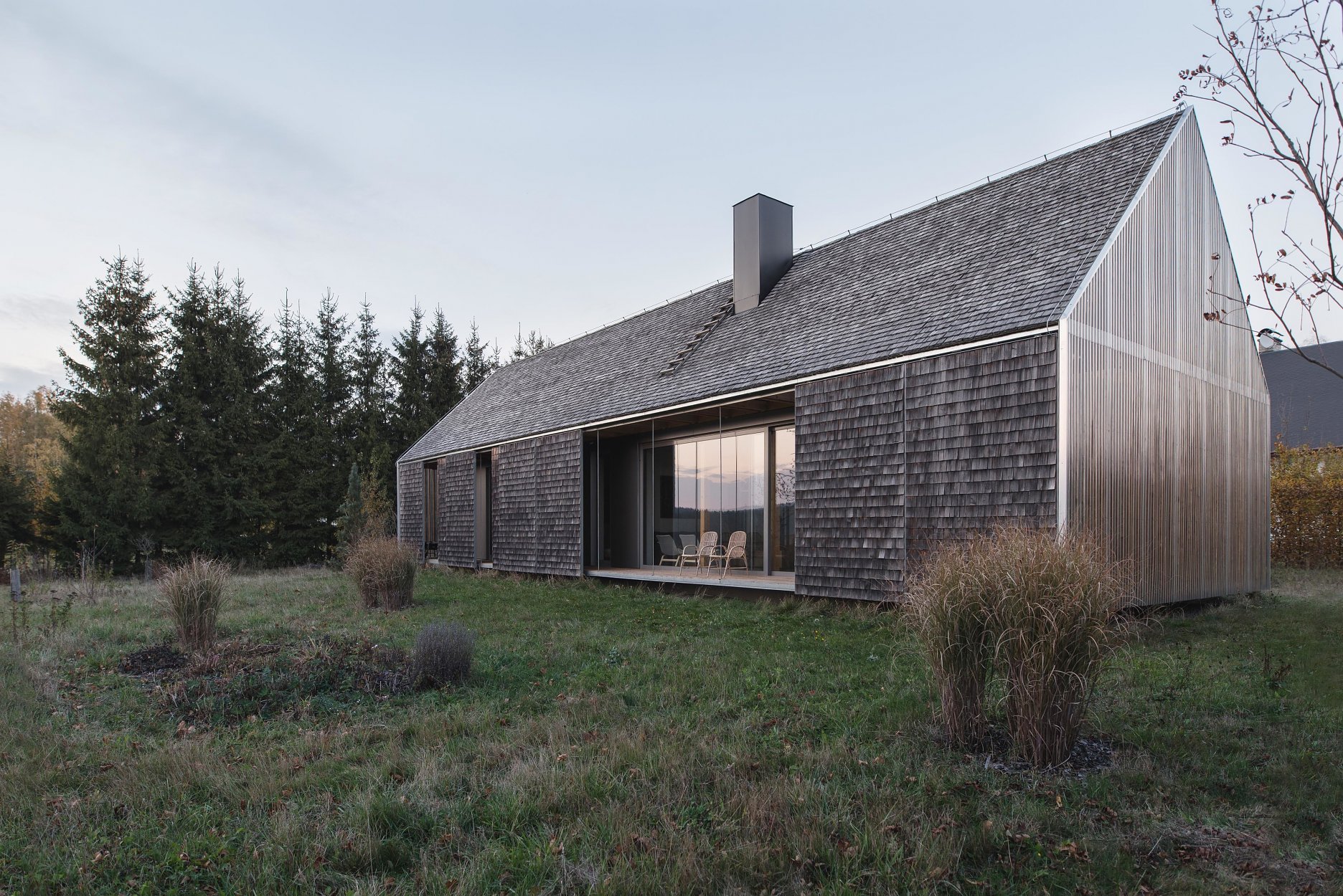 “Koncept domu vychází ze základních archetypů místního lidového stavení, především celkovou proporcí, půdorysem tvaru protáhlého obdélníku a typem a sklonem sedlové střechy,” vysvetľujú architekti. Dobrým príkladom je priedomie, navrhnuté po obvode domu, vymedzené posuvnými okenicami. V prípade neprítomnosti majiteľov, či nepriaznivého počasia možno objekt úplne uzavrieť.