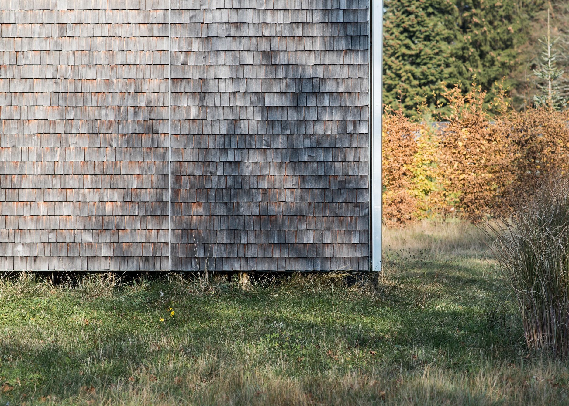 Nosná konštrukcia domu je z dreva. Na priedomí aj v interiéri sú priznané časti drevených krokiev, väzníc a stropných trámov. Obvodová stena domu za okenicami je obložená plechovými panelmi. Okná sú hliníkové. Pohľadovú vrstvu zo strany exteriéru tvorí štiepaný šindeľ. Tradičný materiál nájdeme na fasáde, posuvných okeniciach a na streche. Bočné štítové steny prekrýva priehľadný vlnitý akrylát, kotvený na drevených latách.