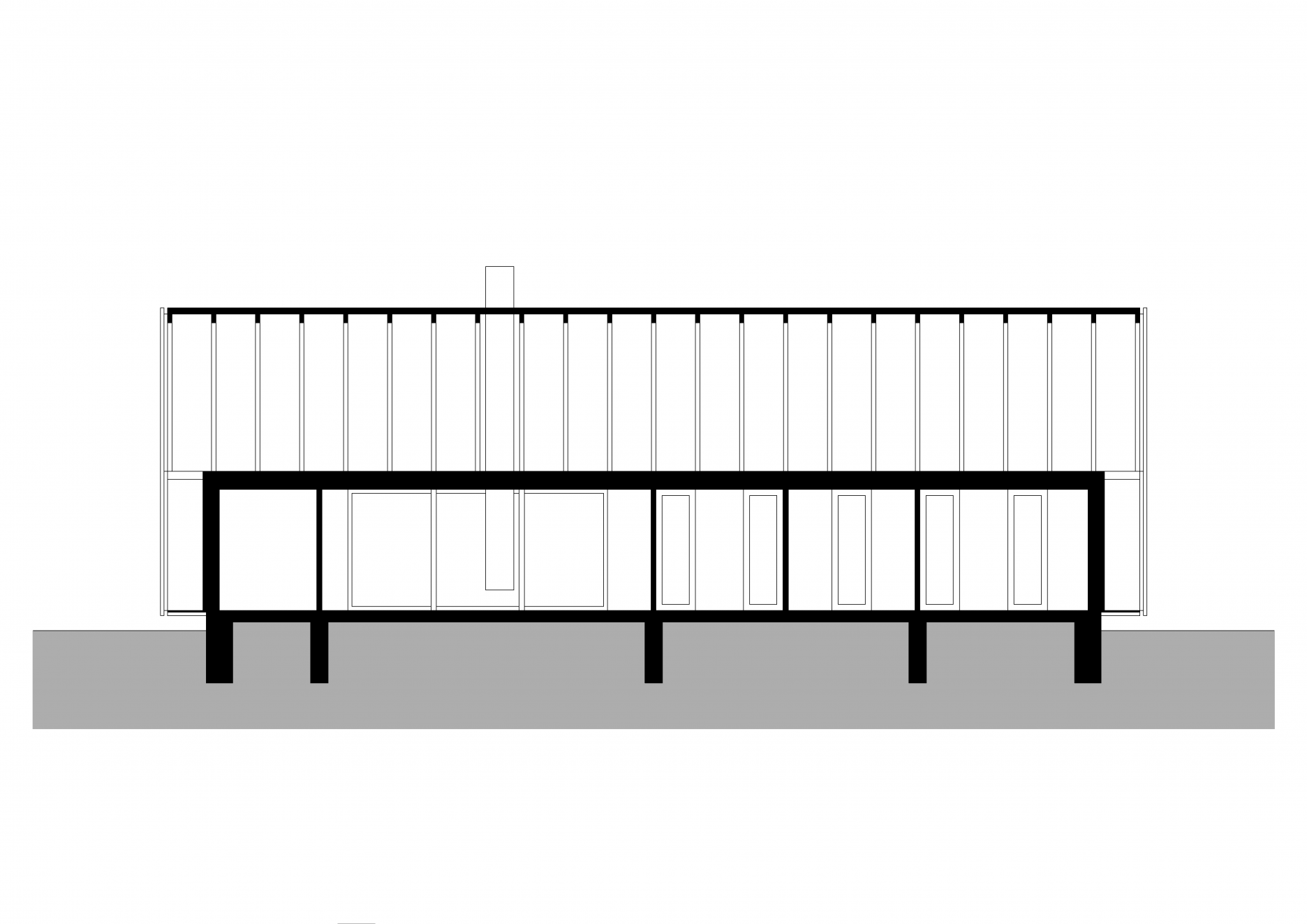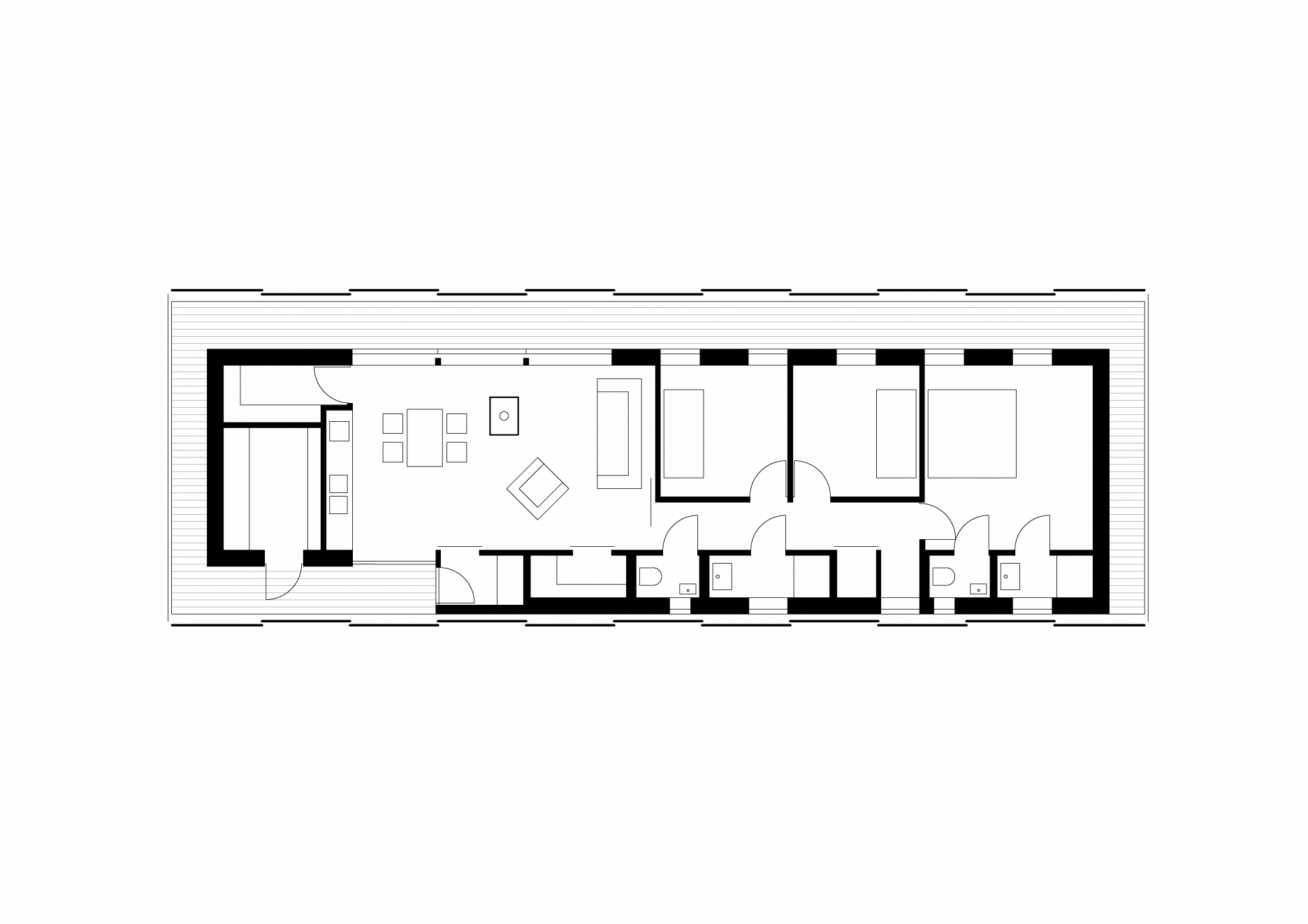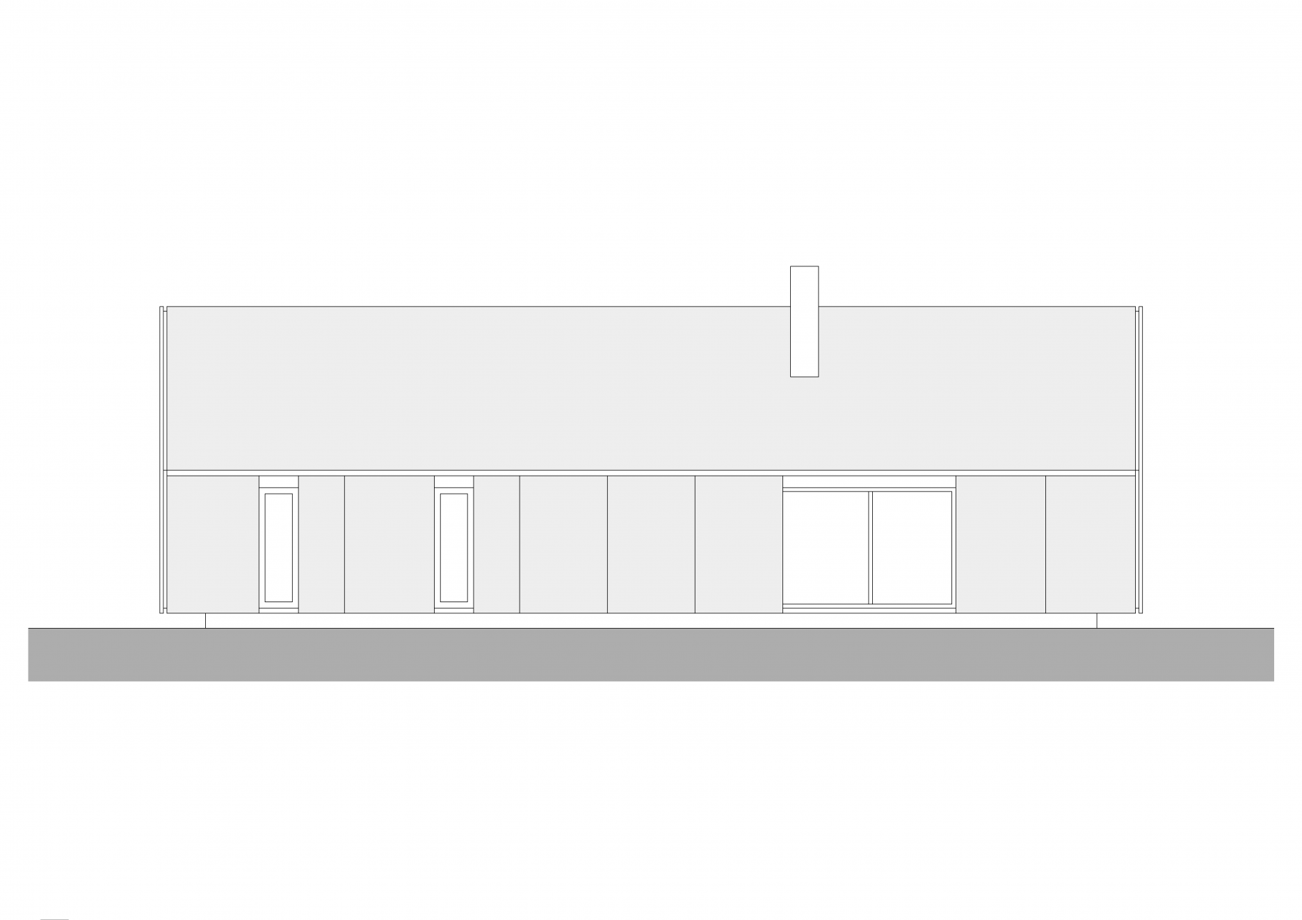 Obdĺžnikový pôdorys pojal jednu obytnú miestnosť s kuchyňou a tri spálne. Všetky izby sú orientované do záhrady. Kúpeľne, zázemie a vstup sú umiestnené pozdĺž severovýchodnej fasády.