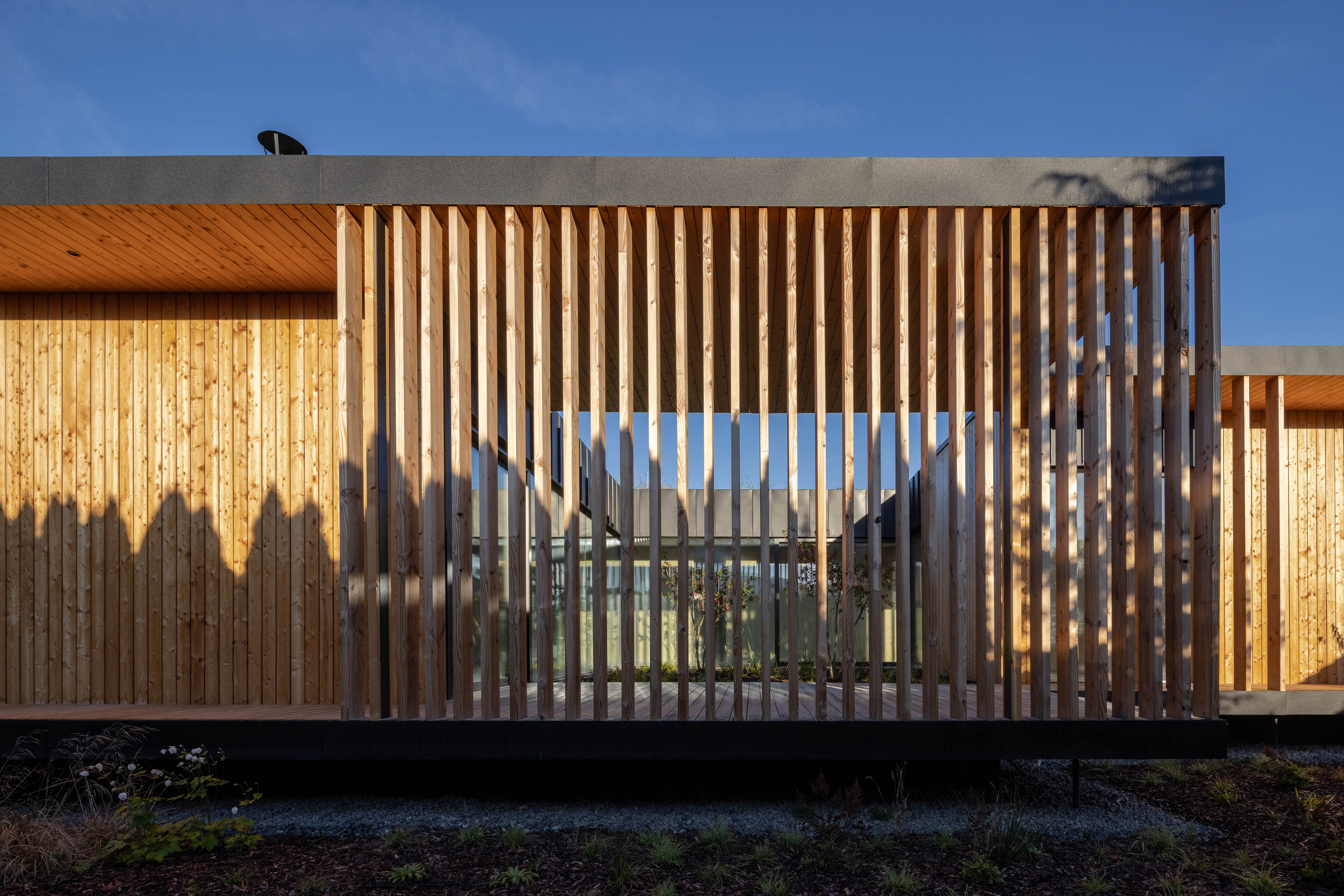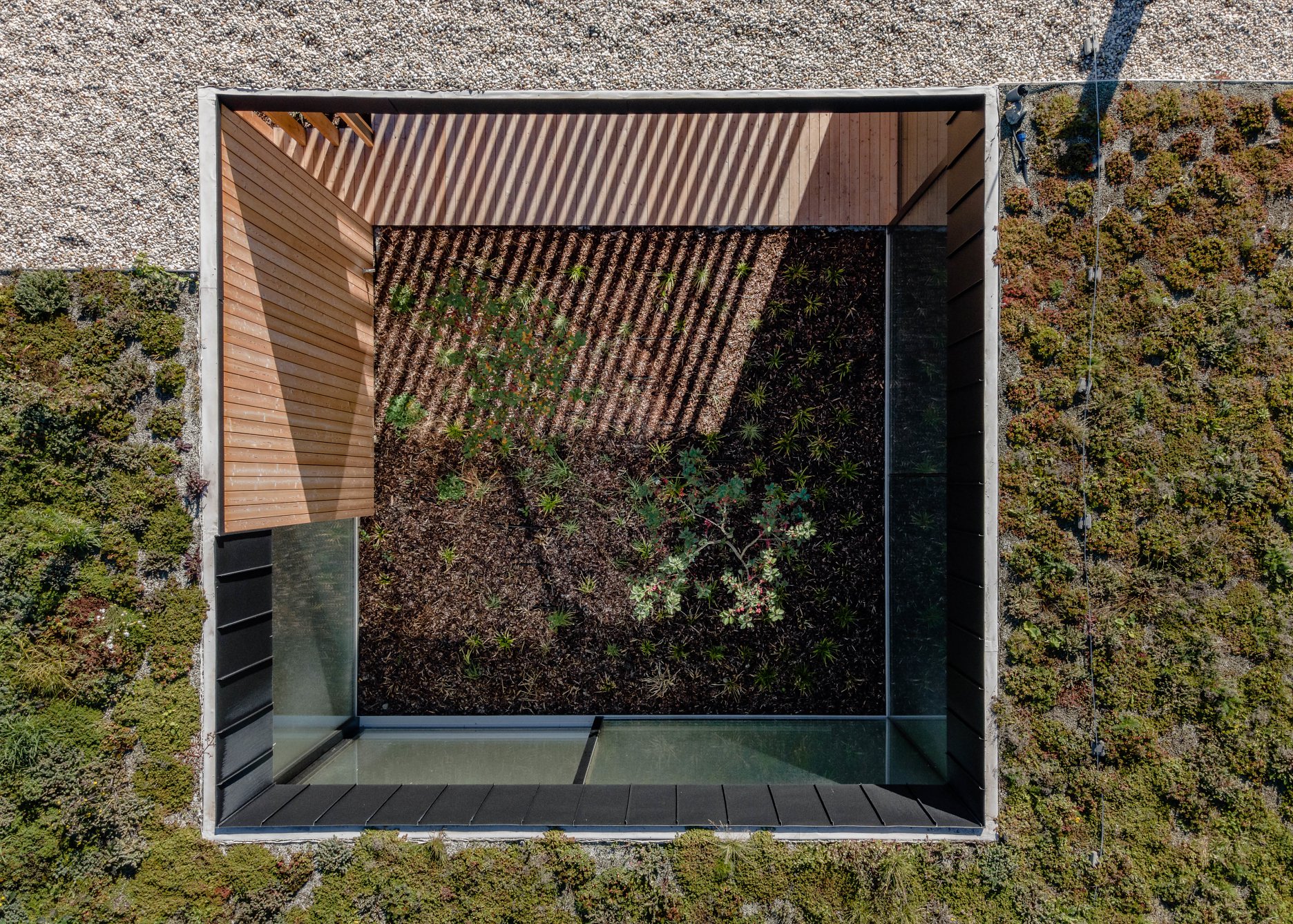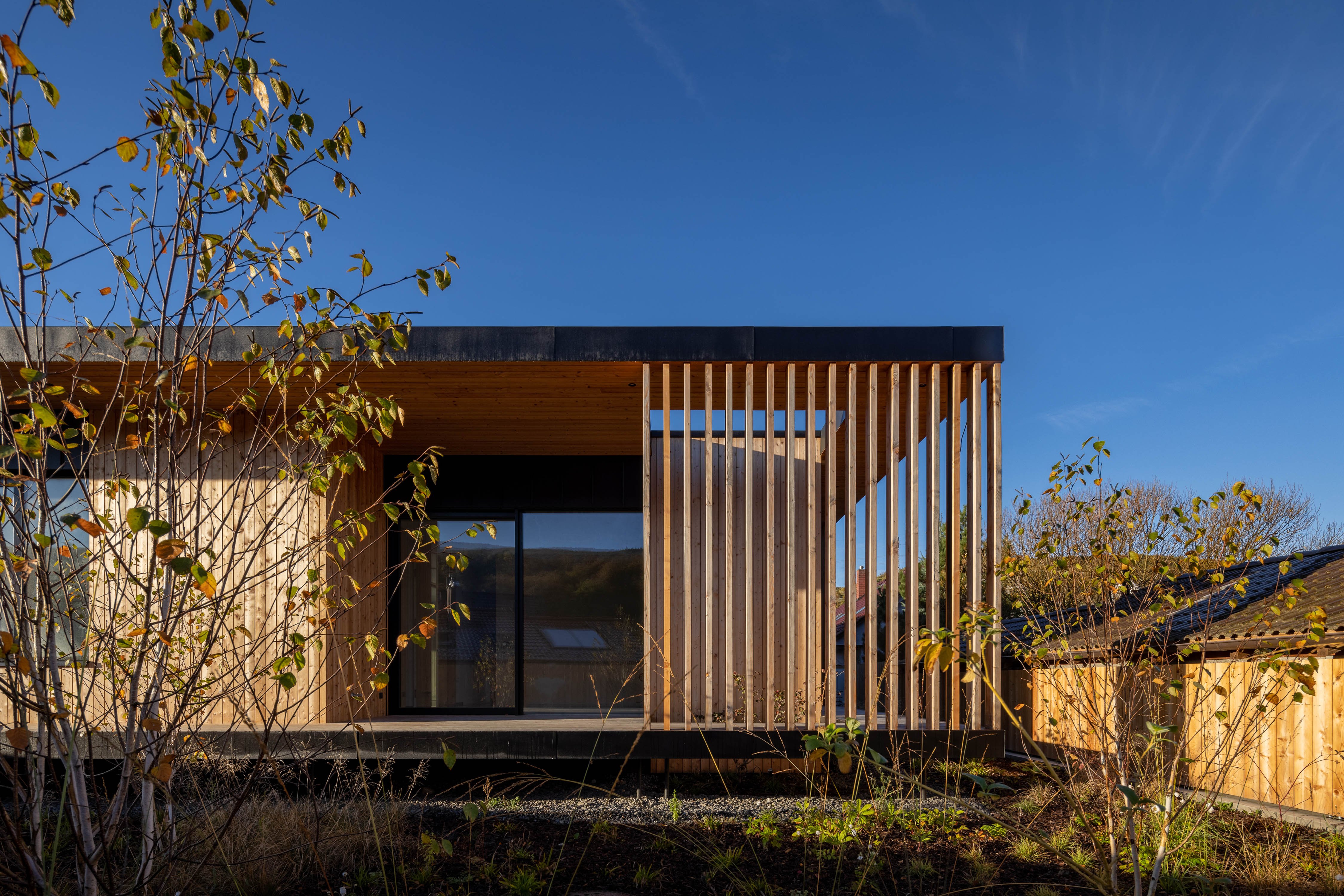 V exteriéri domu kombinujú architekti prvky zo sibírskeho smrekovca s neošetreným prírodným povrchom a matné čierne klampiarske prvky. Výsadba extenzívnej vegetačnej strechy zahŕňa sukulentné rastliny a stepné trávy.
