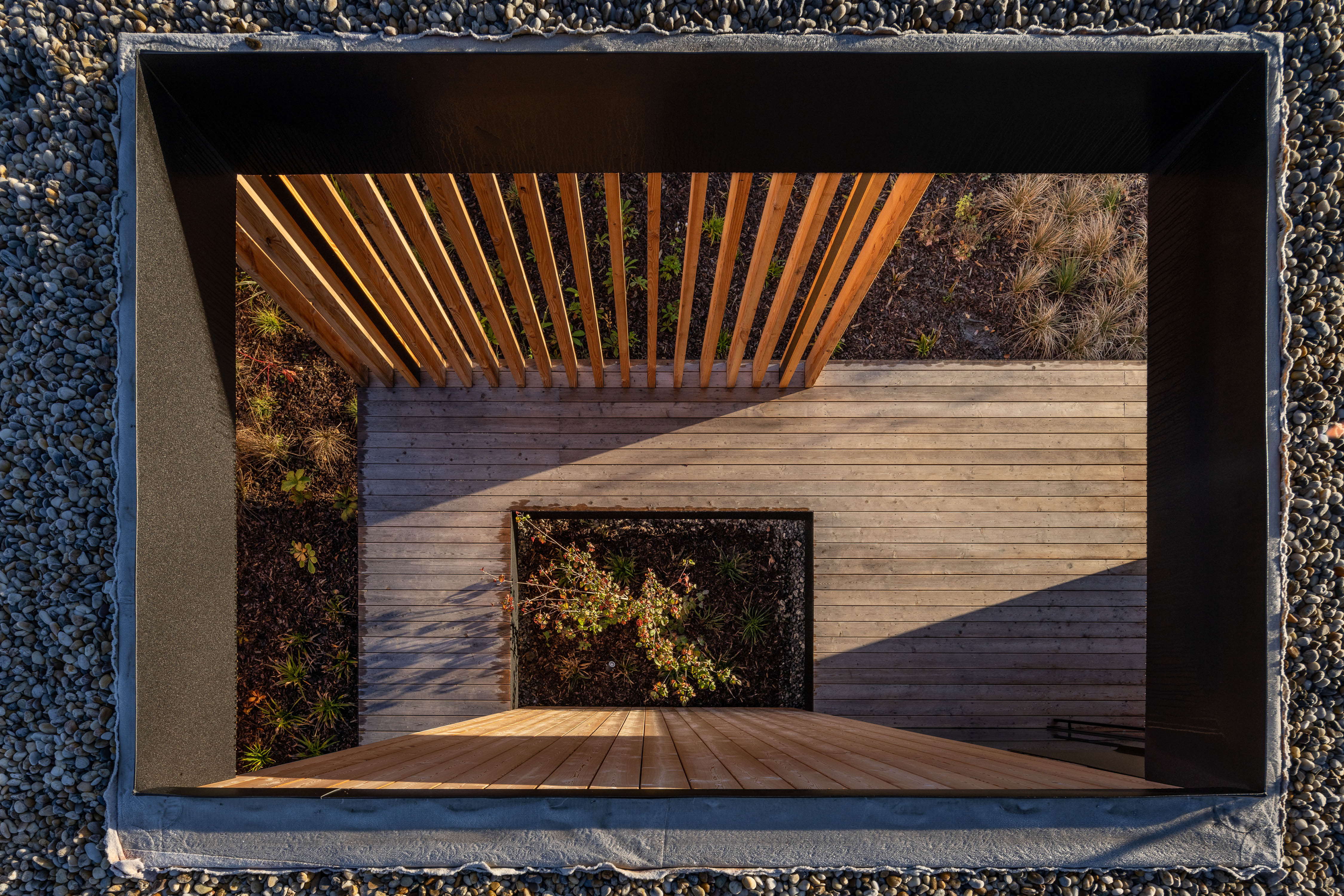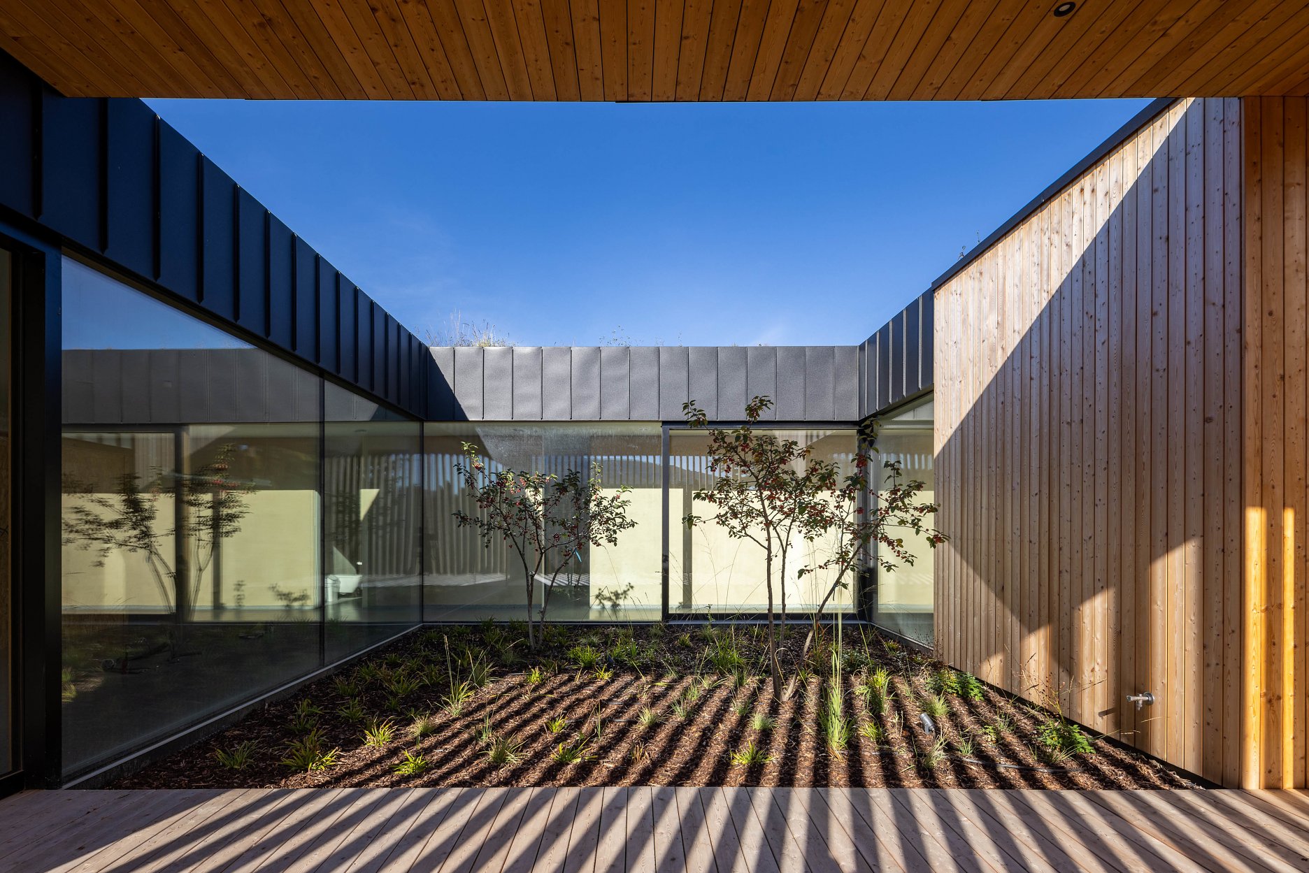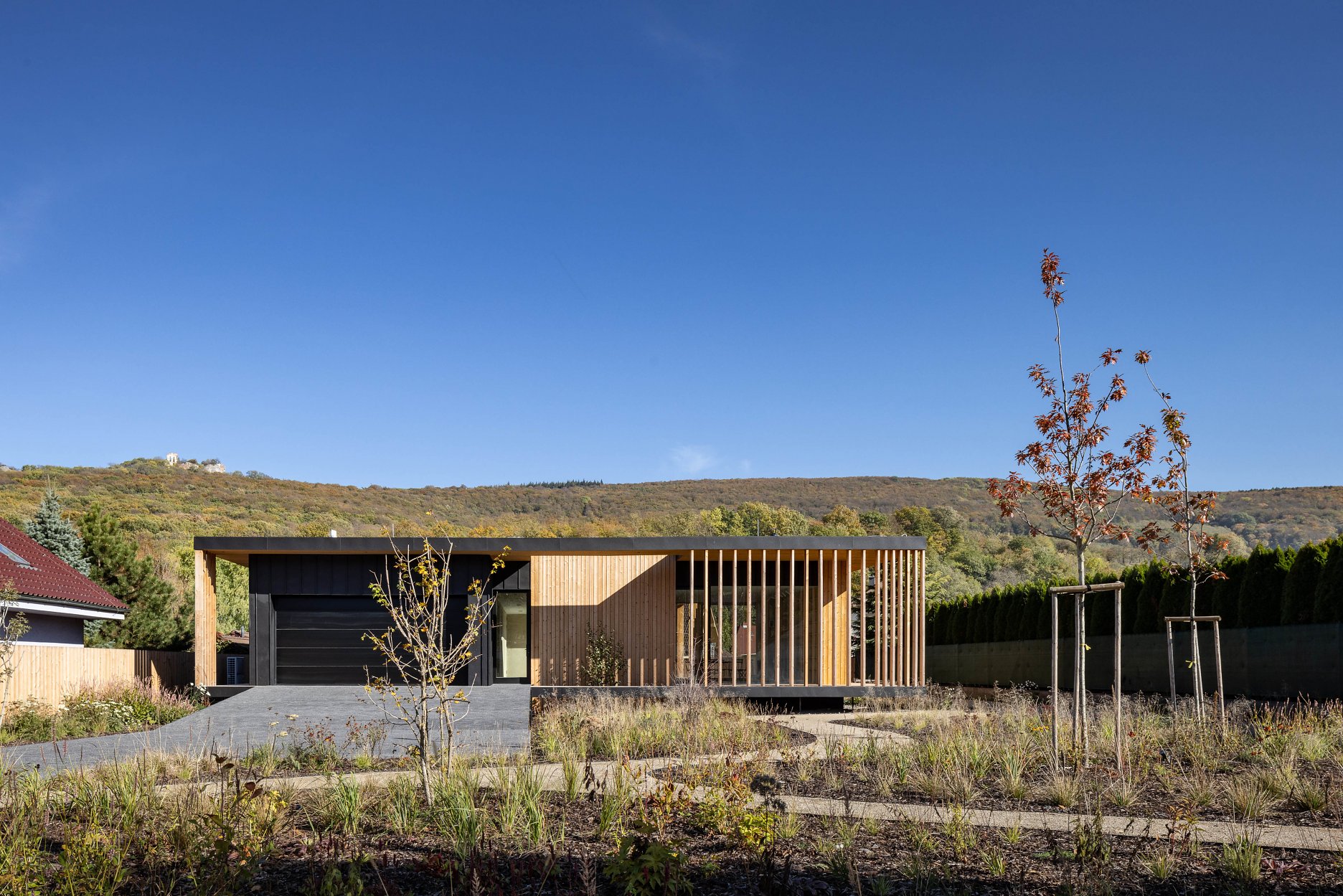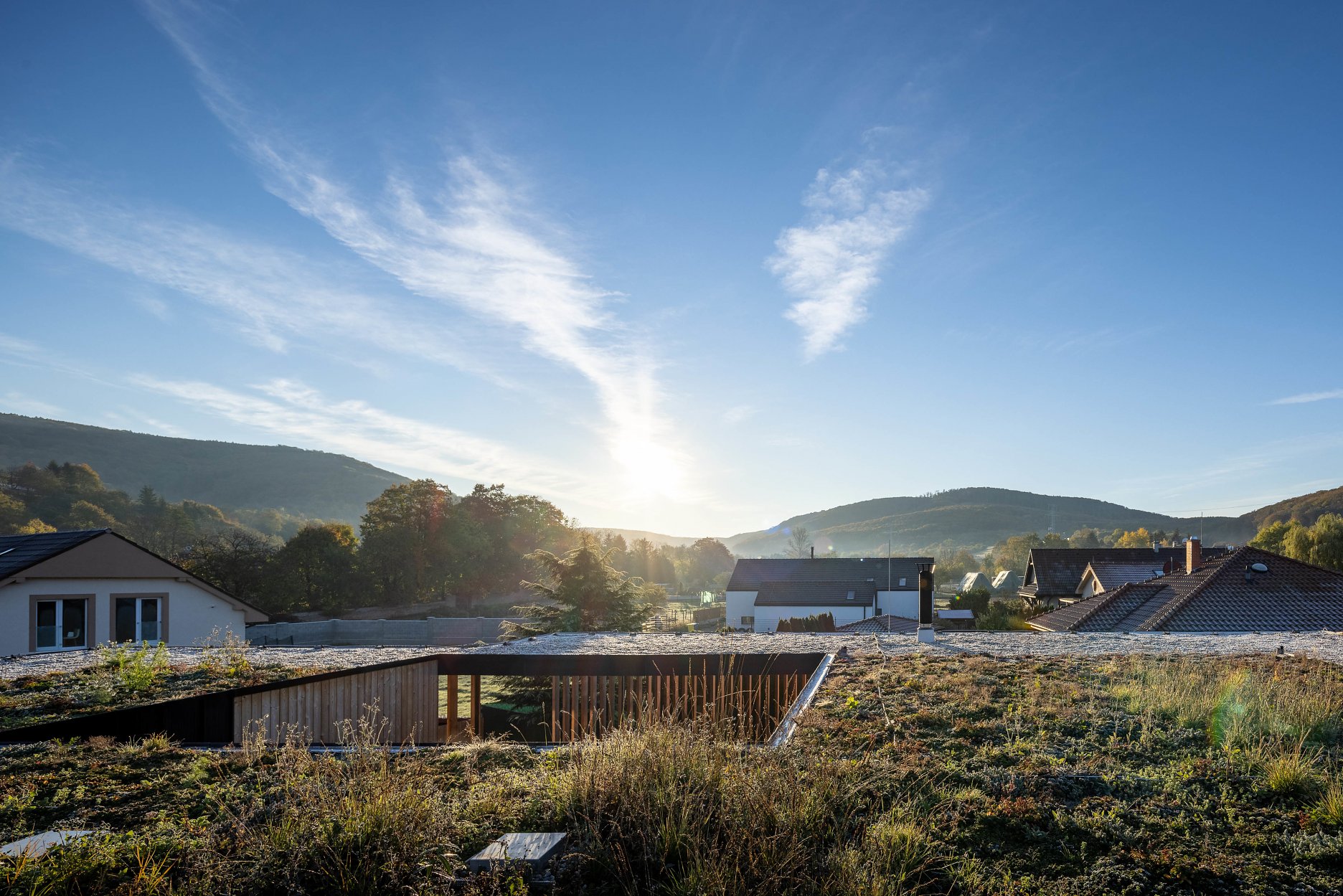 V exteriéri domu kombinujú architekti prvky zo sibírskeho smrekovca s neošetreným prírodným povrchom a matné čierne klampiarske prvky. Výsadba extenzívnej vegetačnej strechy zahŕňa sukulentné rastliny a stepné trávy.