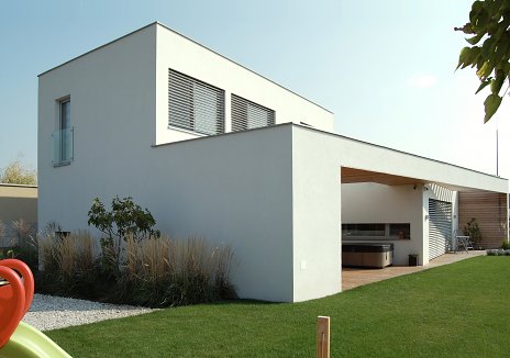 Dom je vzhľadom k okolitému terénu vyvýšený. Vykonzolovaná terasa, prebiehajúca po obvode celého objektu, tvorí výrazný architektonický prvok. Intimitu pobytu v exteriéri zabezpečujú vertikálne drevené lamely.