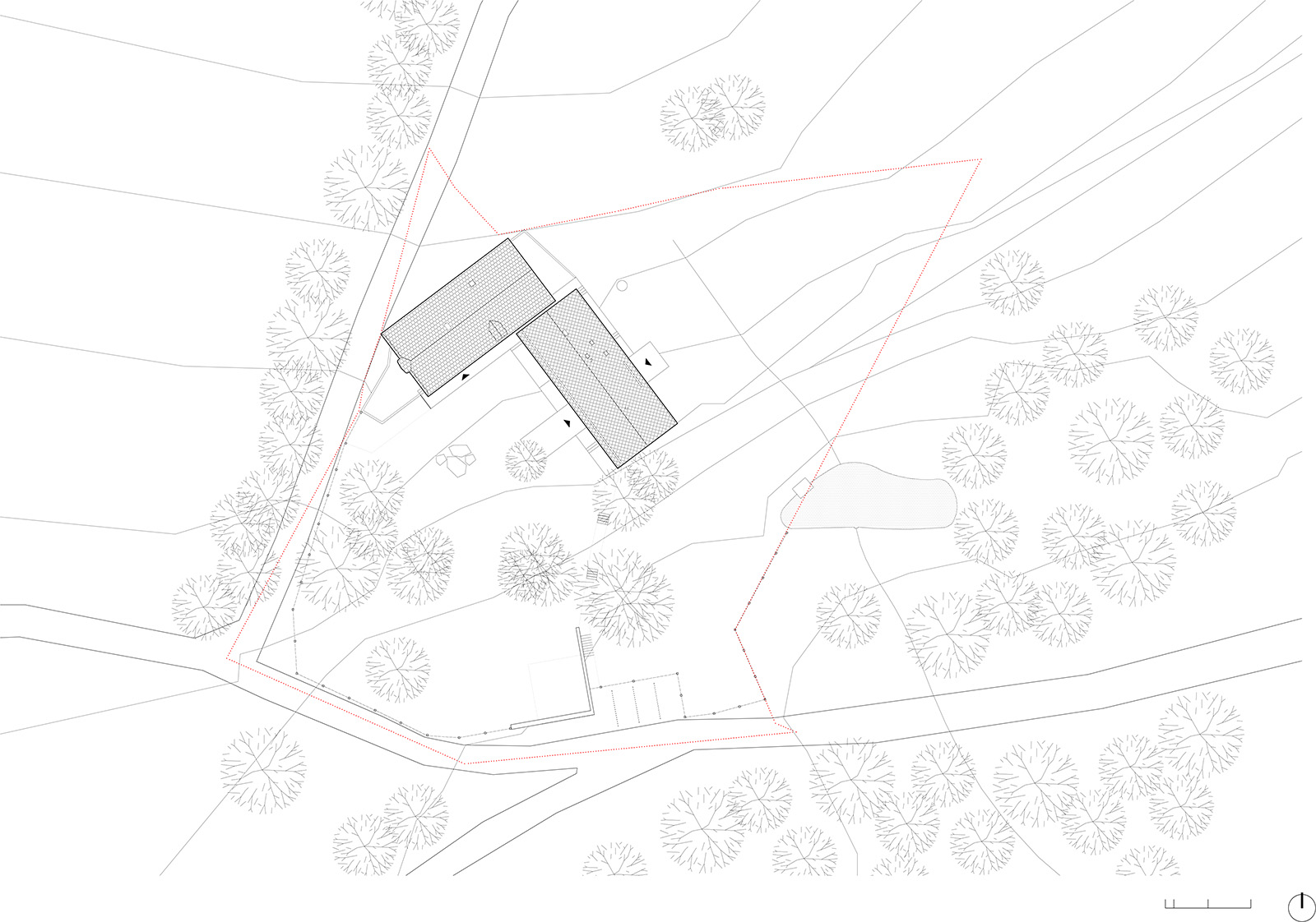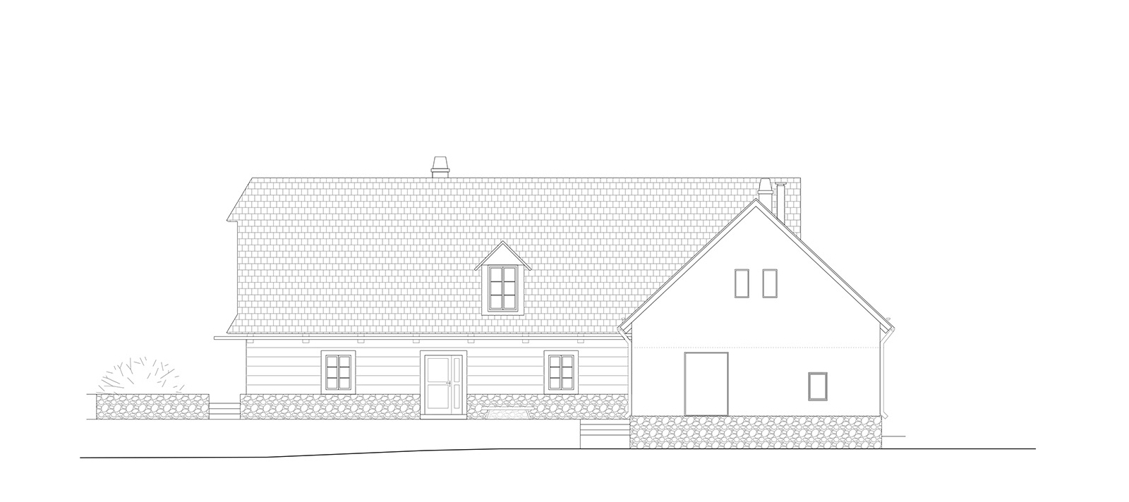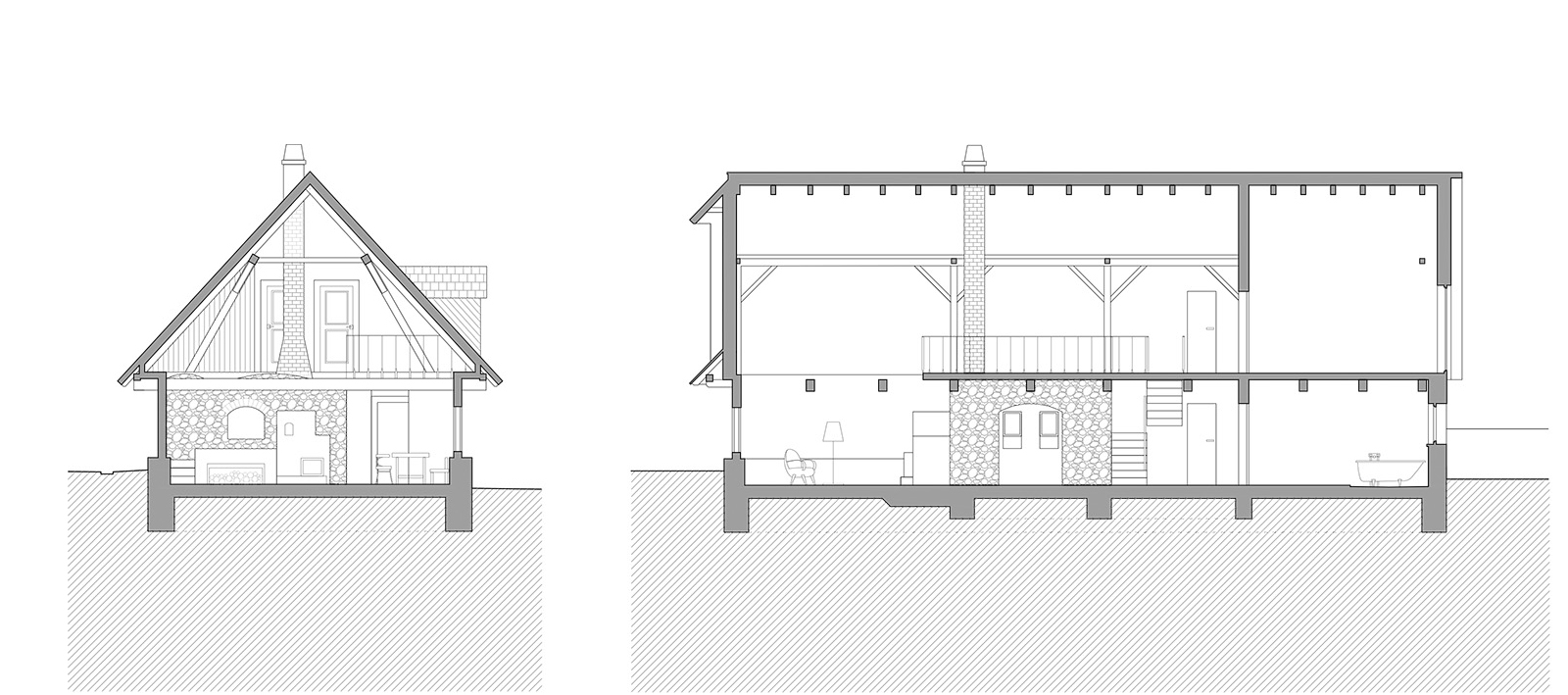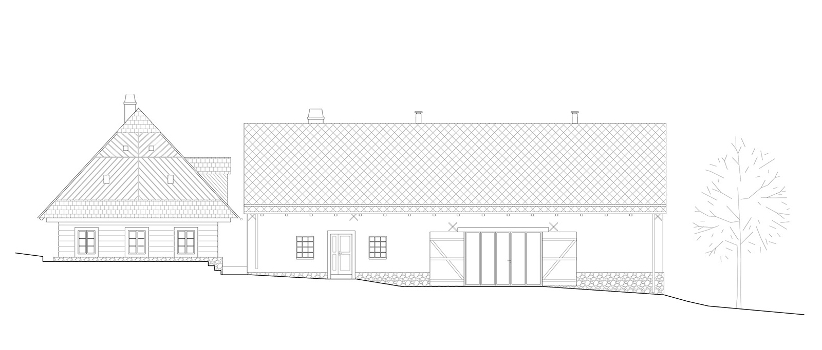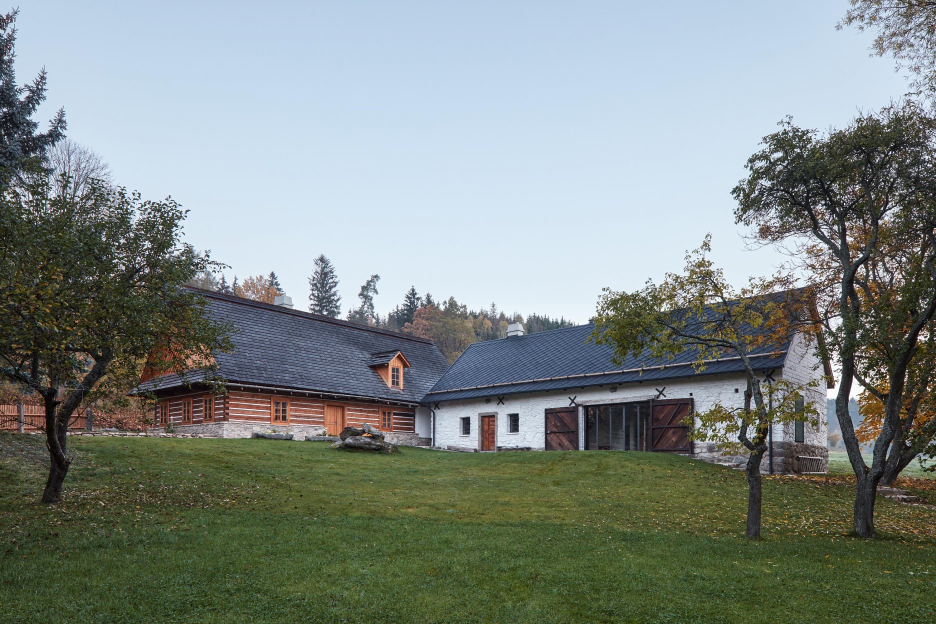 Zvonku sa návrh držal čo najvernejšie pôvodnej podoby stavieb. Zásadné zmeny sa diali v interiéri. Hlavné obytné priestory sú otvorené až po krov, aby vynikol charakteristický prvok pôvodného domu - v chalupe čierna kuchyňa, v stodole priehľad cez pôvodné vráta. V oboch domoch je naviac vstavaný nový čierny "komín", ktorý v sebe ukrýva hygienické zázemie a nesie schody vedúce na poschodie. V stodole sa týči táto dostavba ako dominanta, v chalupe je zámerne nenápadná.