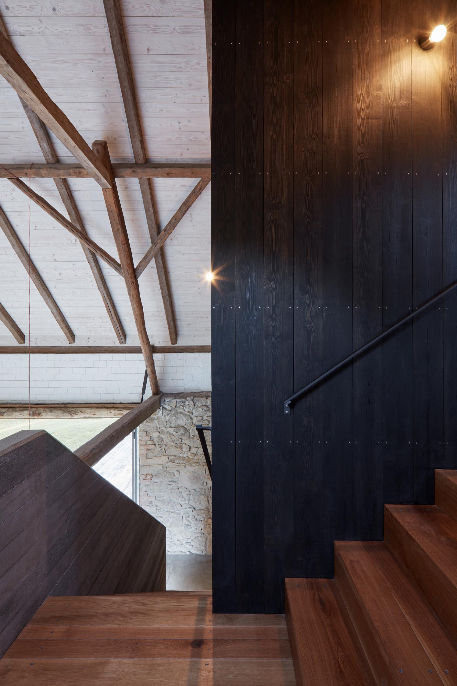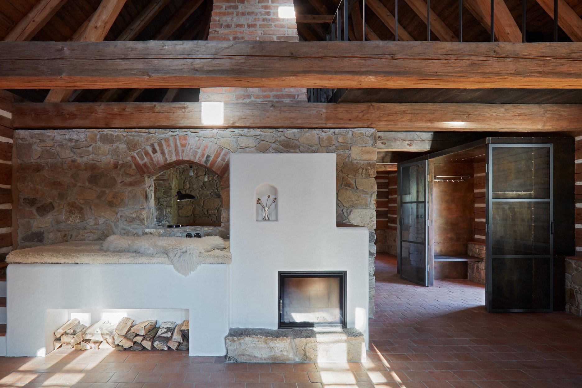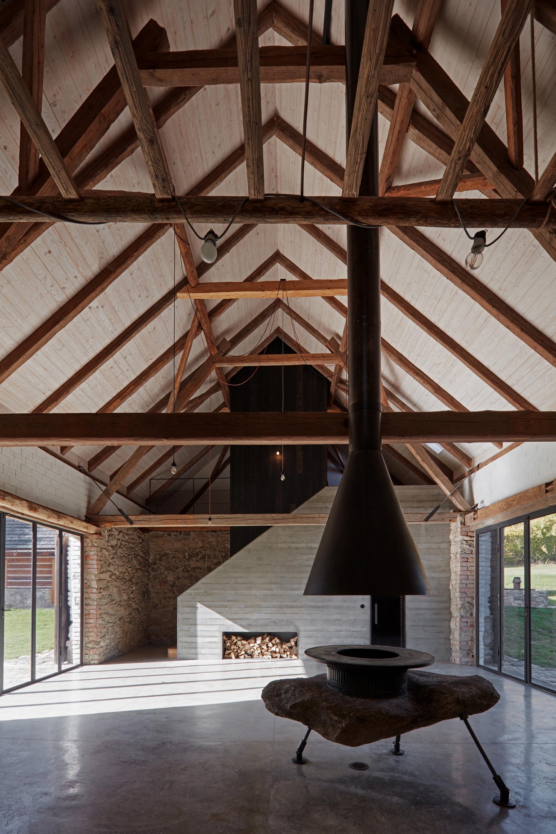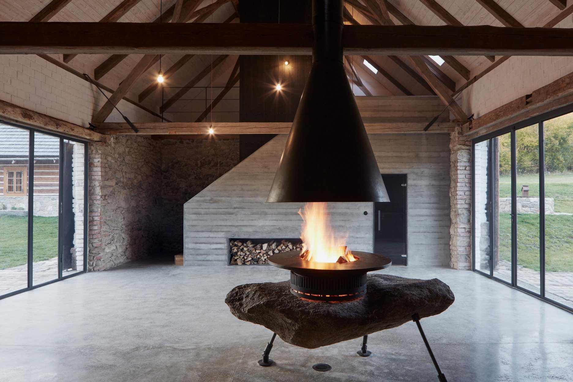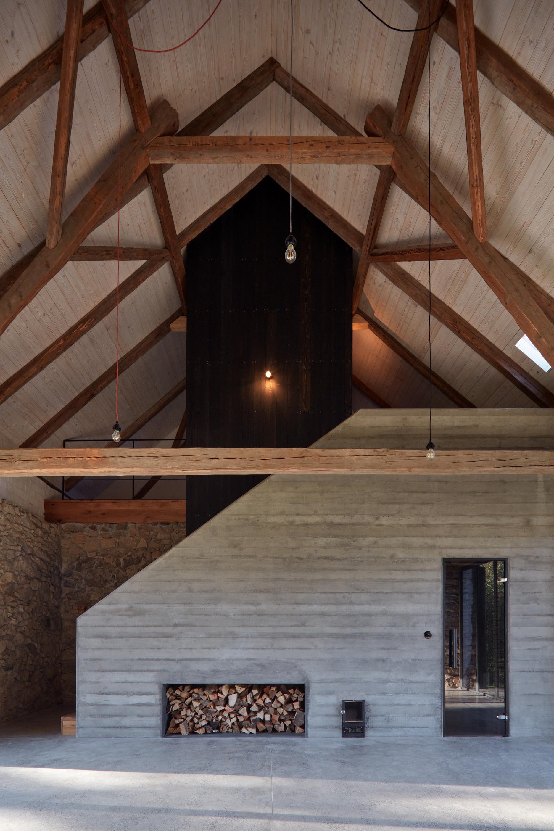 Pôvodné kamenné steny zostávajú vo vnútri odhalené. Murivo dopĺňa stena z pohľadového betónu s odtlačkami debniacich dosiek, ktorá ukrýva schodisko a saunu. Na pozadí svetlého zákrytu vyniká pôvodný krov a veľký otvorený priestor. Interiér sa nerušene otvára vďaka skladacím preskleným krídlam do záhrady i na lúku za domom. Presvetlenie zabezpečuje aj presklenie v štíte stodoly. Pomyselné srdce domu tvorí otvorený krb na kameni z neďalekej stráne.