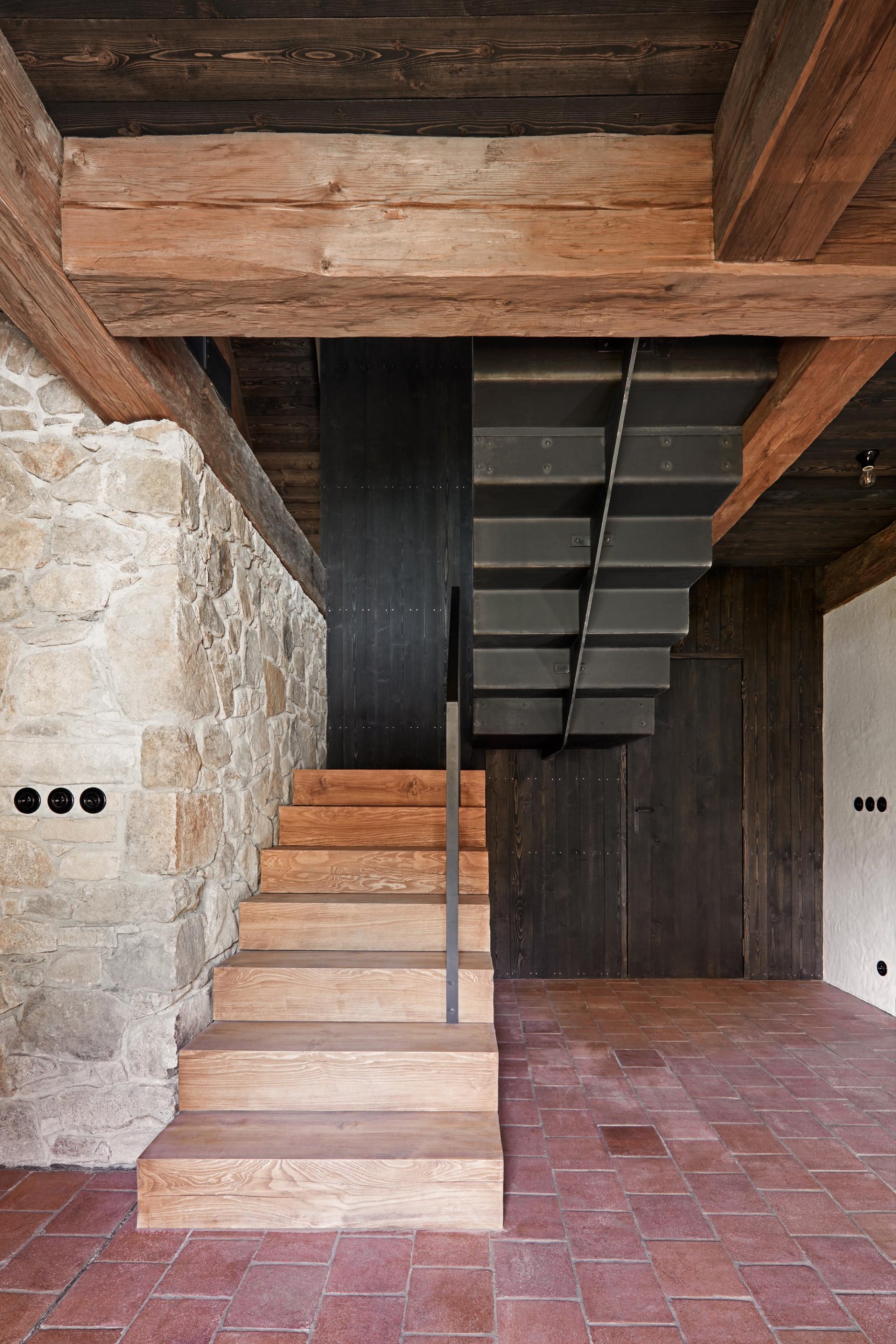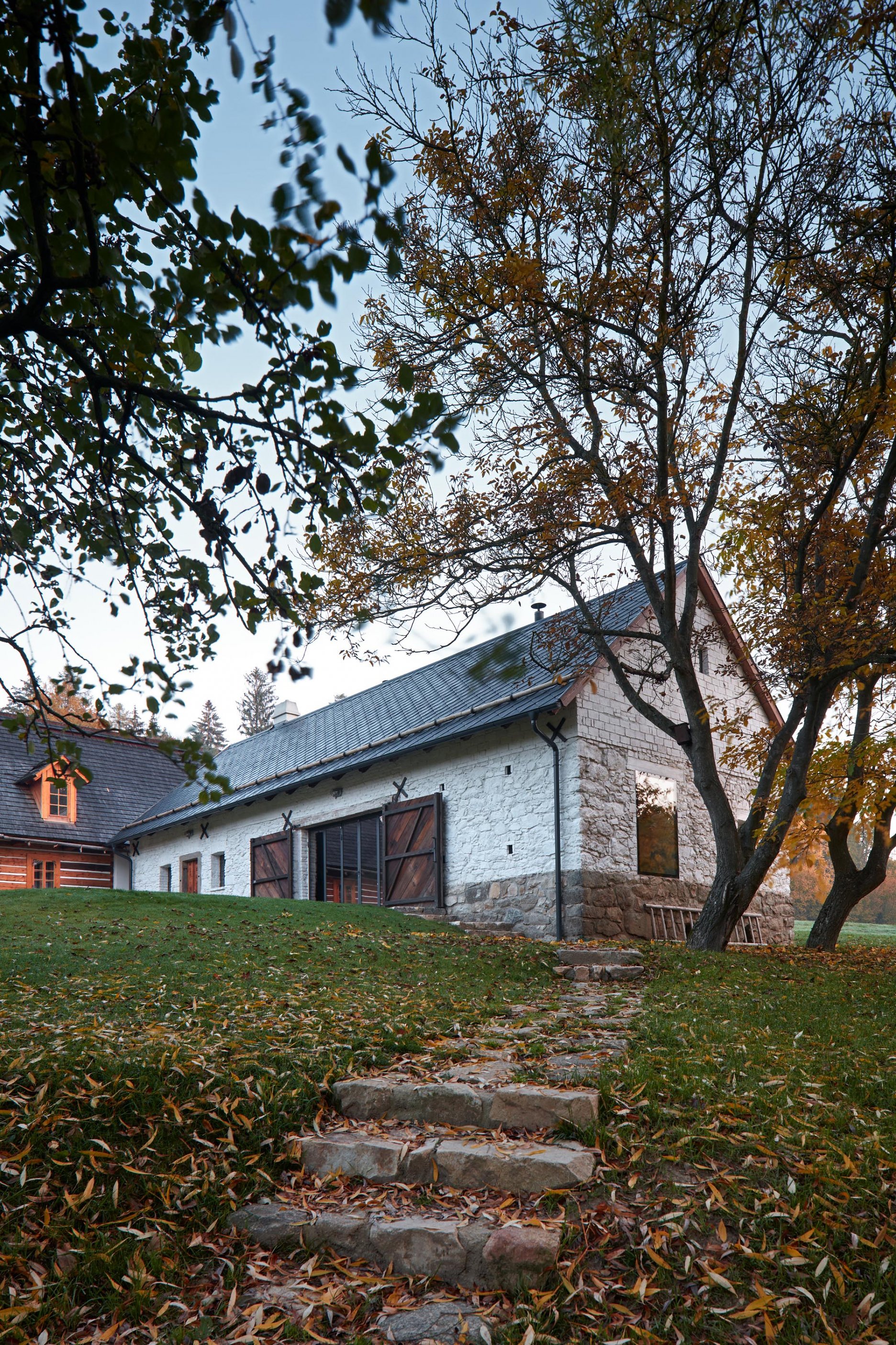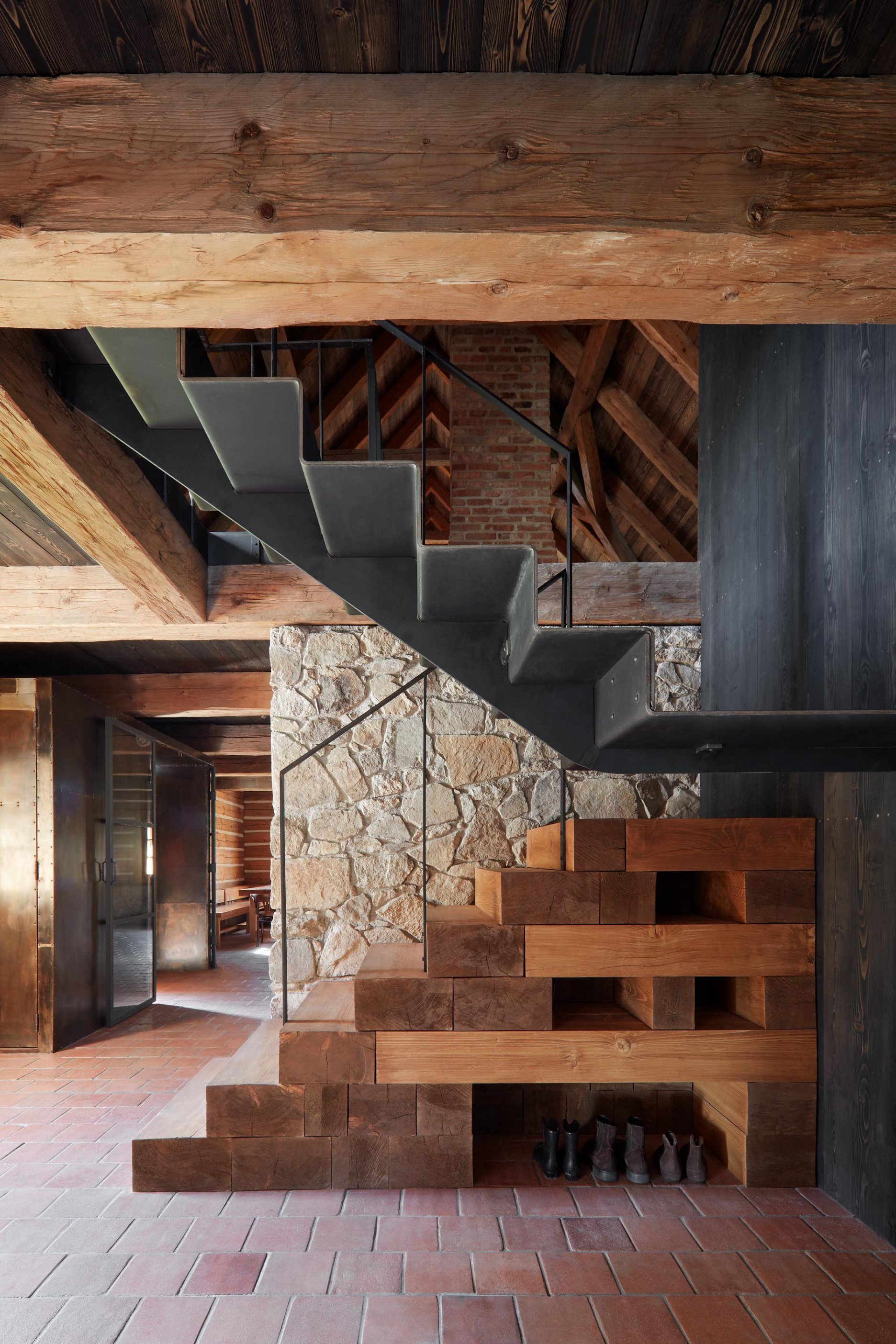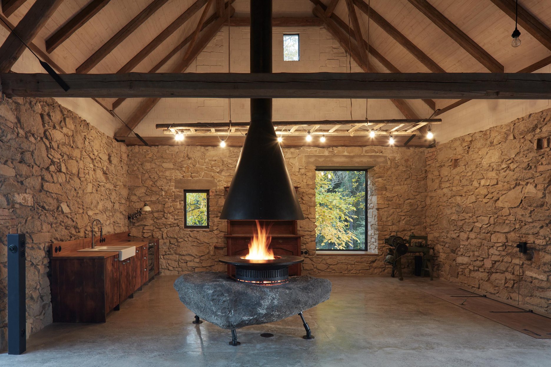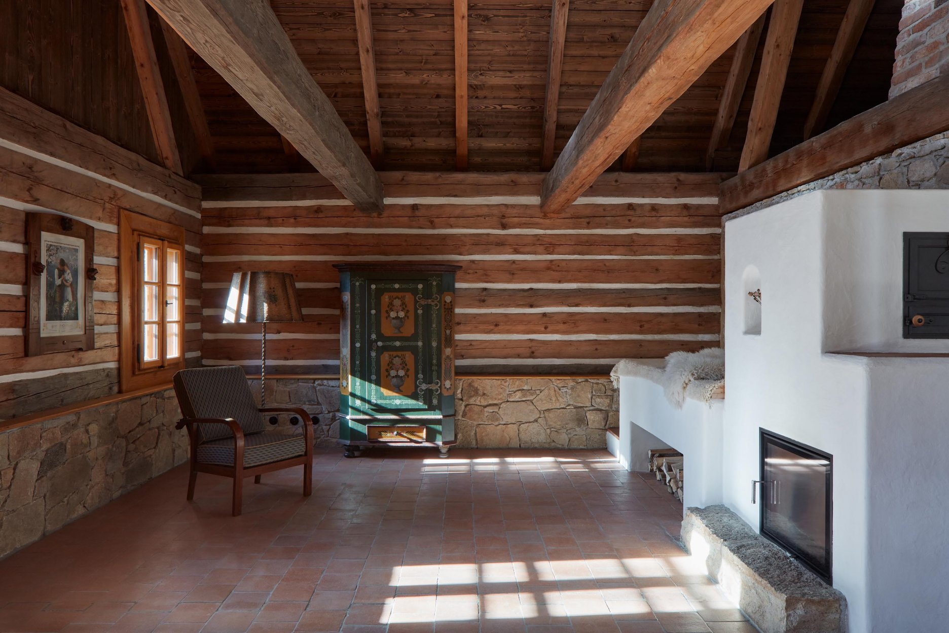 Pôvodné kamenné steny zostávajú vo vnútri odhalené. Murivo dopĺňa stena z pohľadového betónu s odtlačkami debniacich dosiek, ktorá ukrýva schodisko a saunu. Na pozadí svetlého zákrytu vyniká pôvodný krov a veľký otvorený priestor. Interiér sa nerušene otvára vďaka skladacím preskleným krídlam do záhrady i na lúku za domom. Presvetlenie zabezpečuje aj presklenie v štíte stodoly. Pomyselné srdce domu tvorí otvorený krb na kameni z neďalekej stráne.