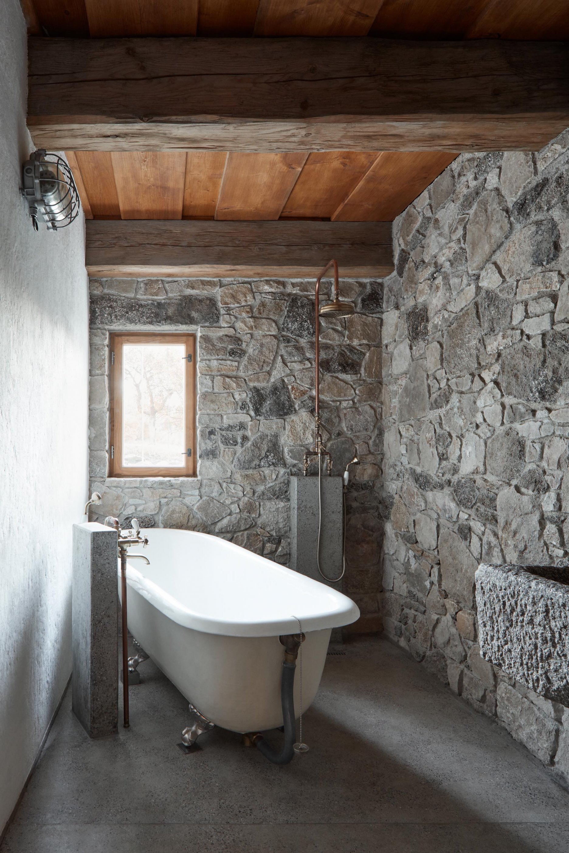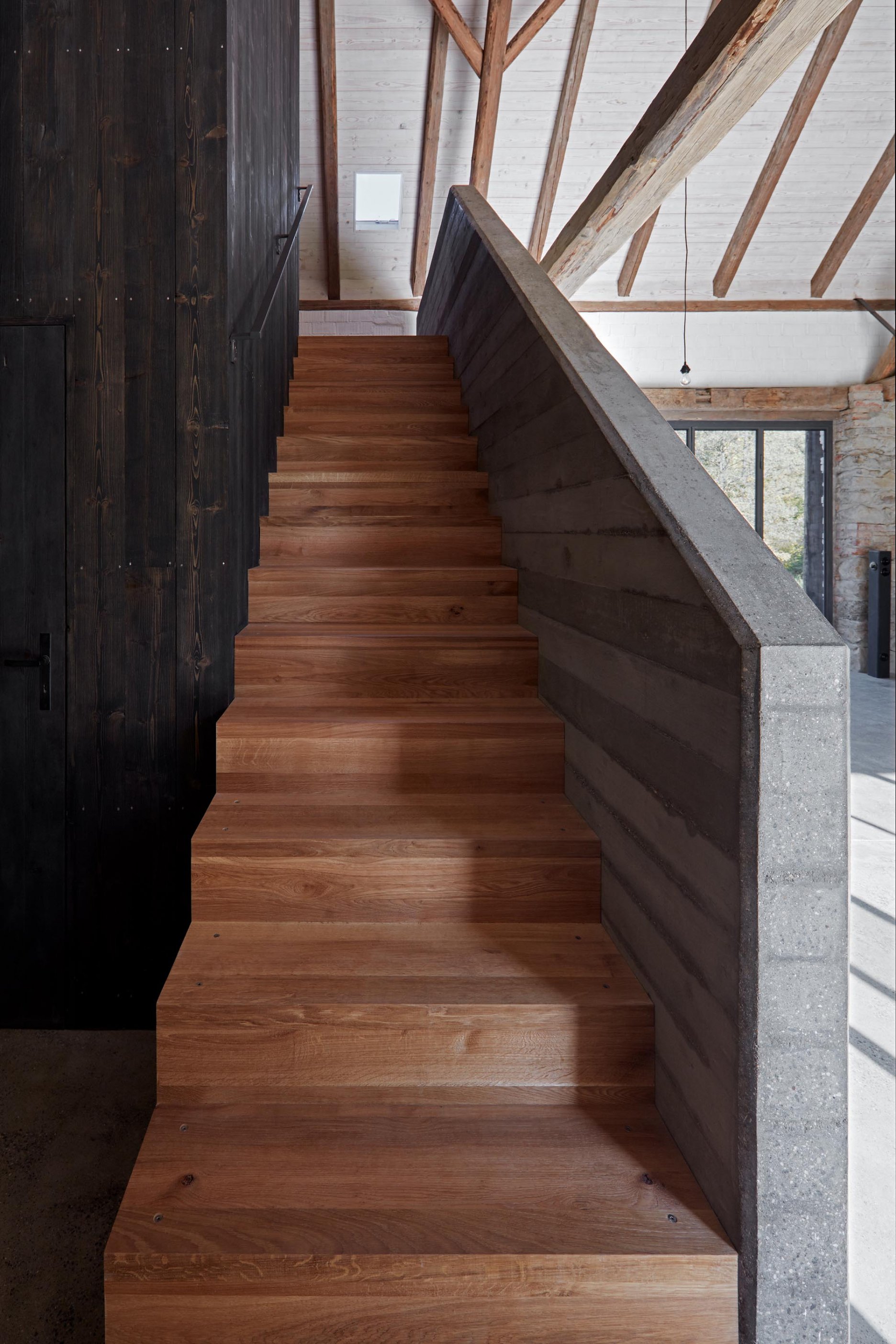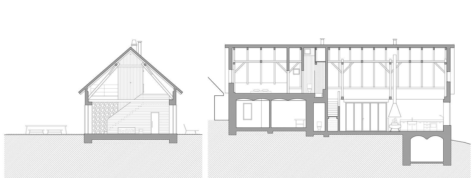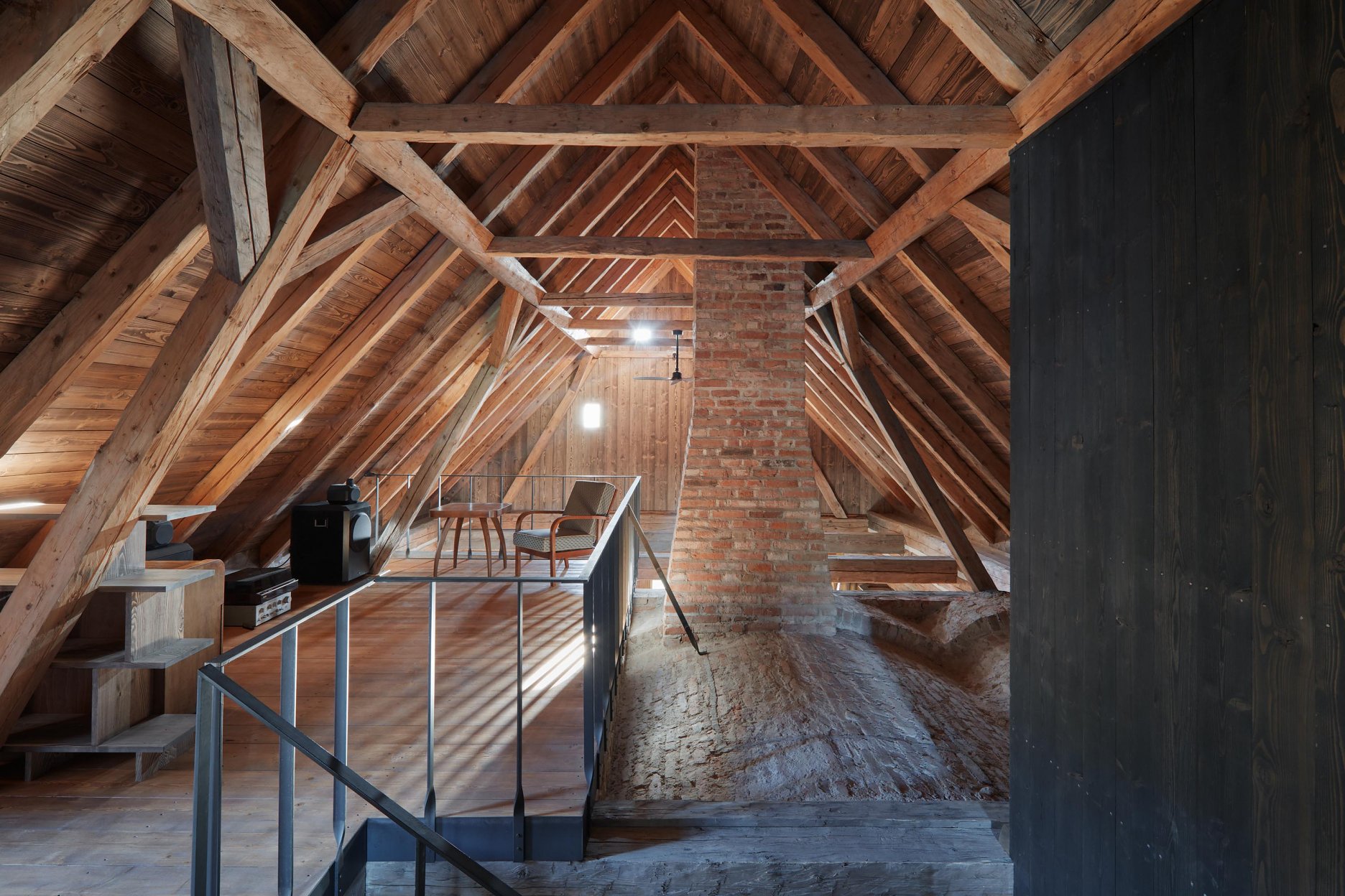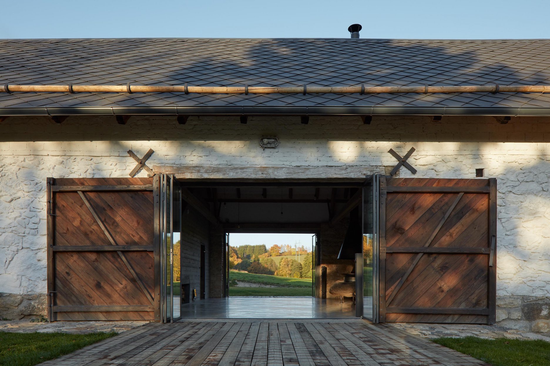 Pôvodné kamenné steny zostávajú vo vnútri odhalené. Murivo dopĺňa stena z pohľadového betónu s odtlačkami debniacich dosiek, ktorá ukrýva schodisko a saunu. Na pozadí svetlého zákrytu vyniká pôvodný krov a veľký otvorený priestor. Interiér sa nerušene otvára vďaka skladacím preskleným krídlam do záhrady i na lúku za domom. Presvetlenie zabezpečuje aj presklenie v štíte stodoly. Pomyselné srdce domu tvorí otvorený krb na kameni z neďalekej stráne.