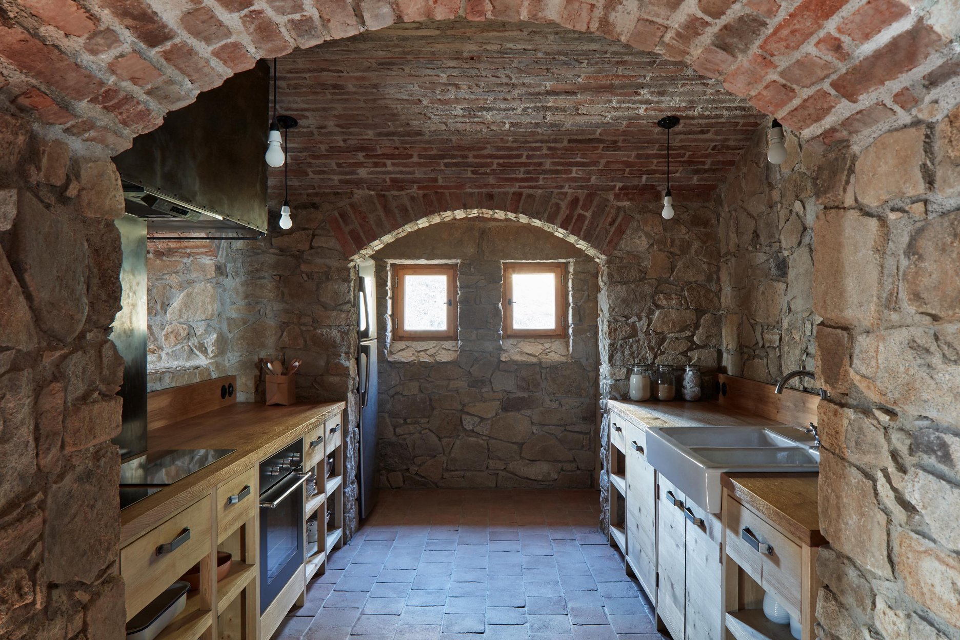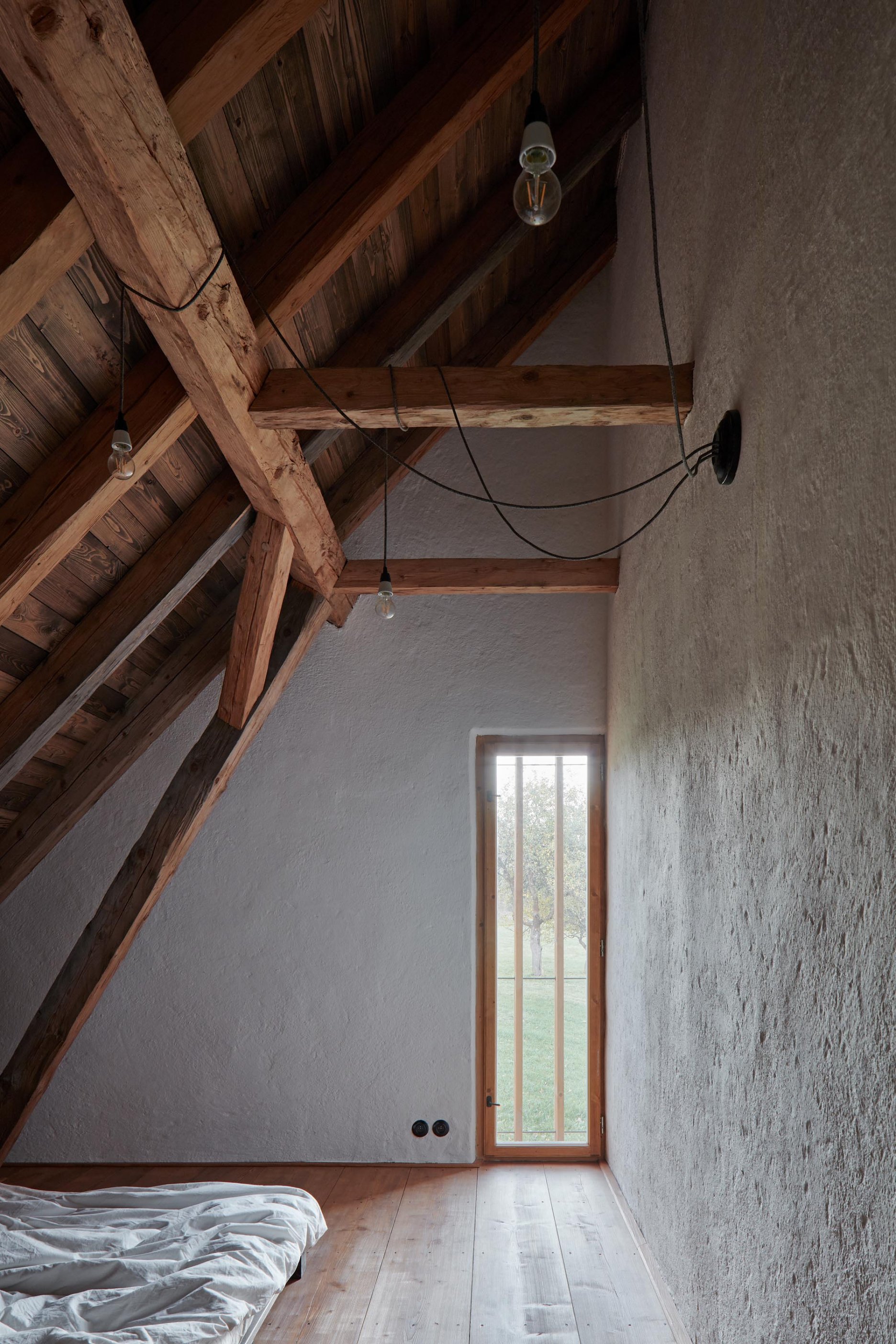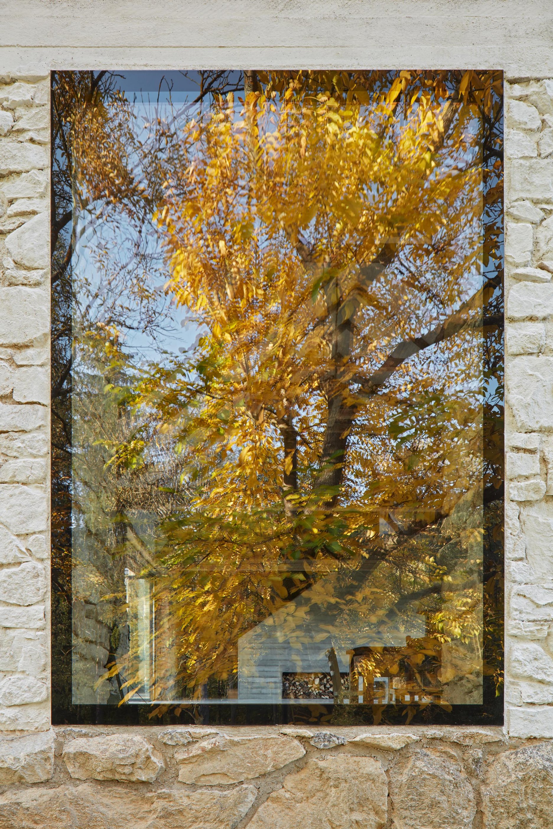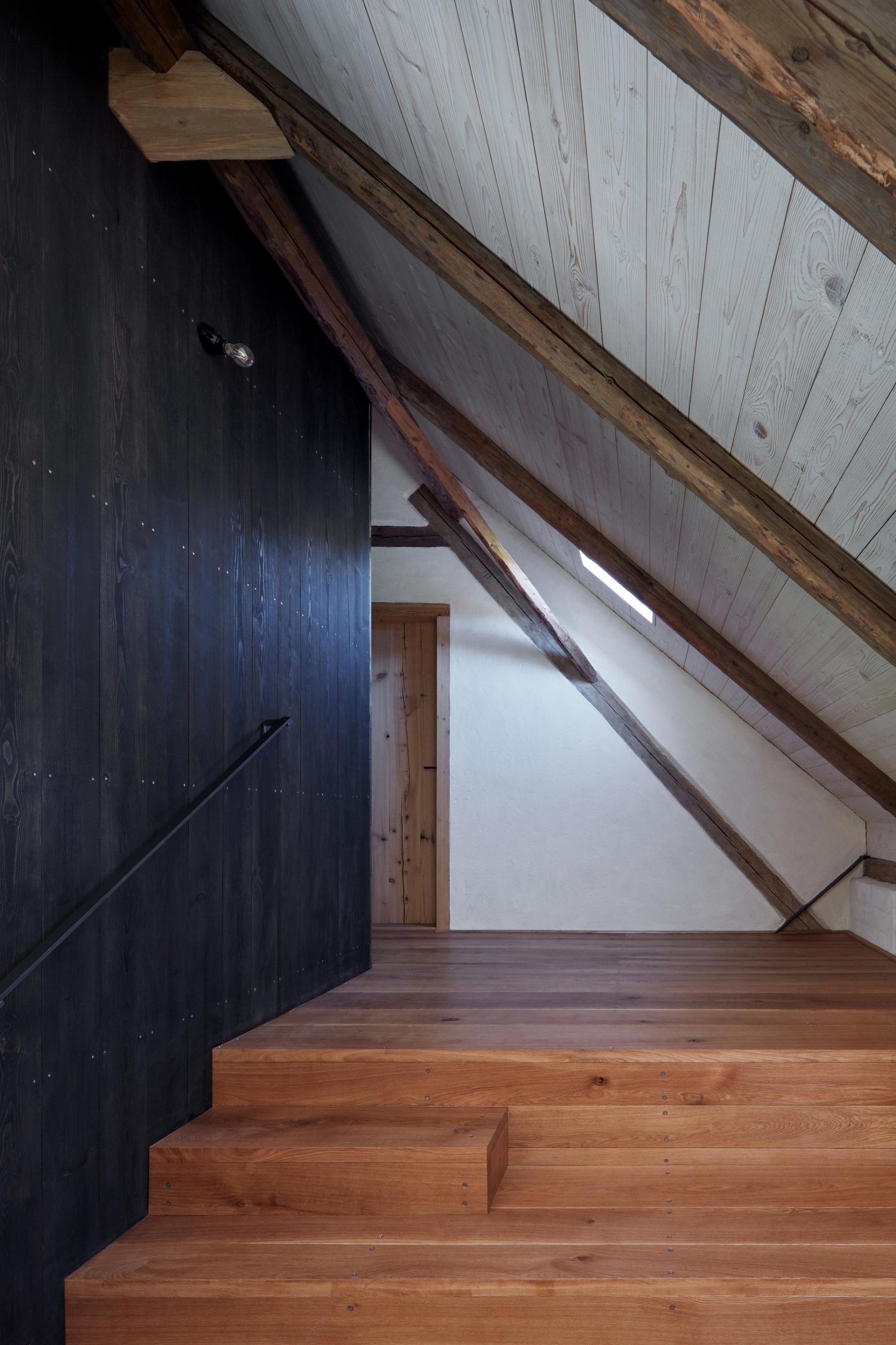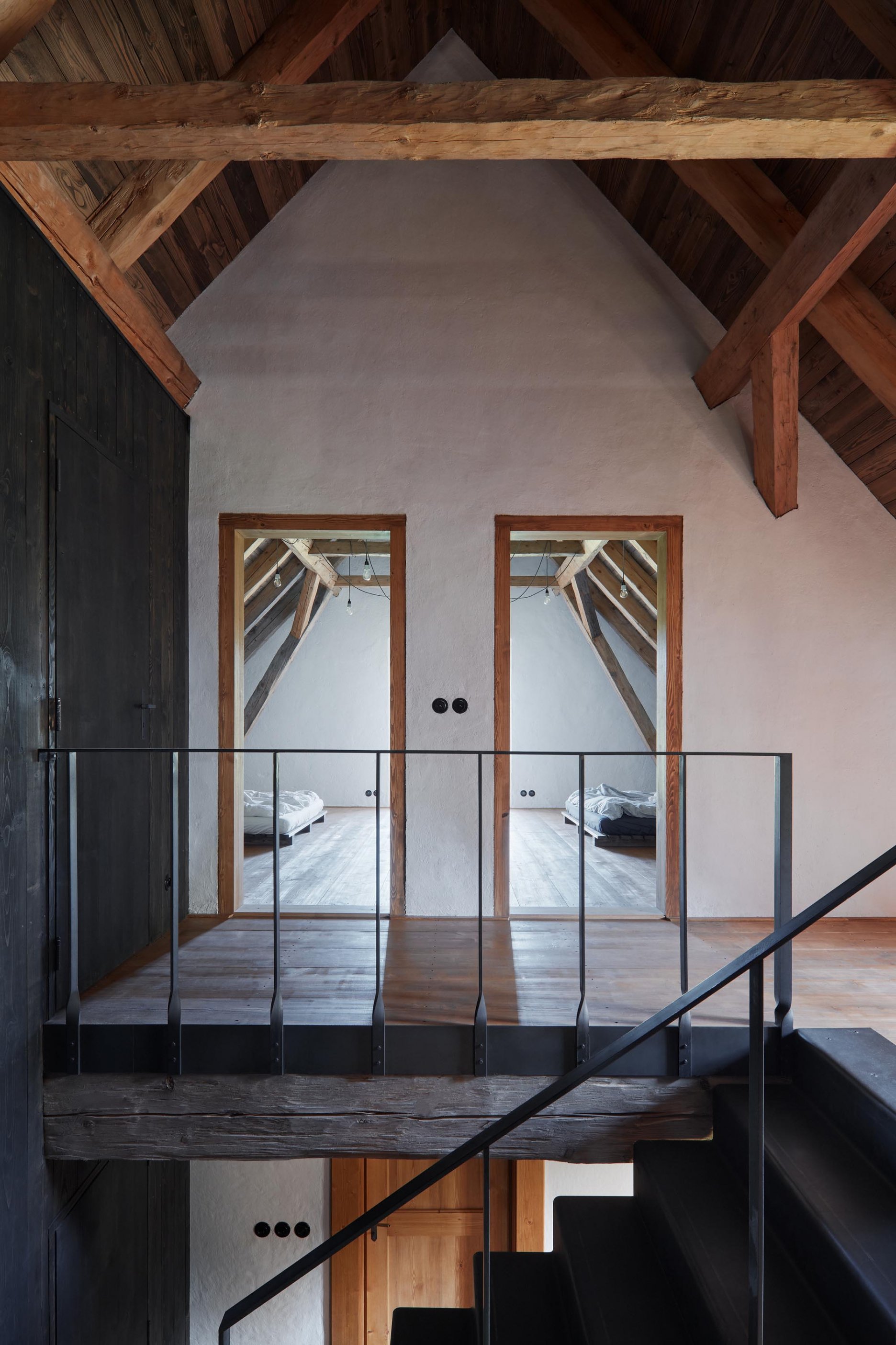 Pôvodné kamenné steny zostávajú vo vnútri odhalené. Murivo dopĺňa stena z pohľadového betónu s odtlačkami debniacich dosiek, ktorá ukrýva schodisko a saunu. Na pozadí svetlého zákrytu vyniká pôvodný krov a veľký otvorený priestor. Interiér sa nerušene otvára vďaka skladacím preskleným krídlam do záhrady i na lúku za domom. Presvetlenie zabezpečuje aj presklenie v štíte stodoly. Pomyselné srdce domu tvorí otvorený krb na kameni z neďalekej stráne.