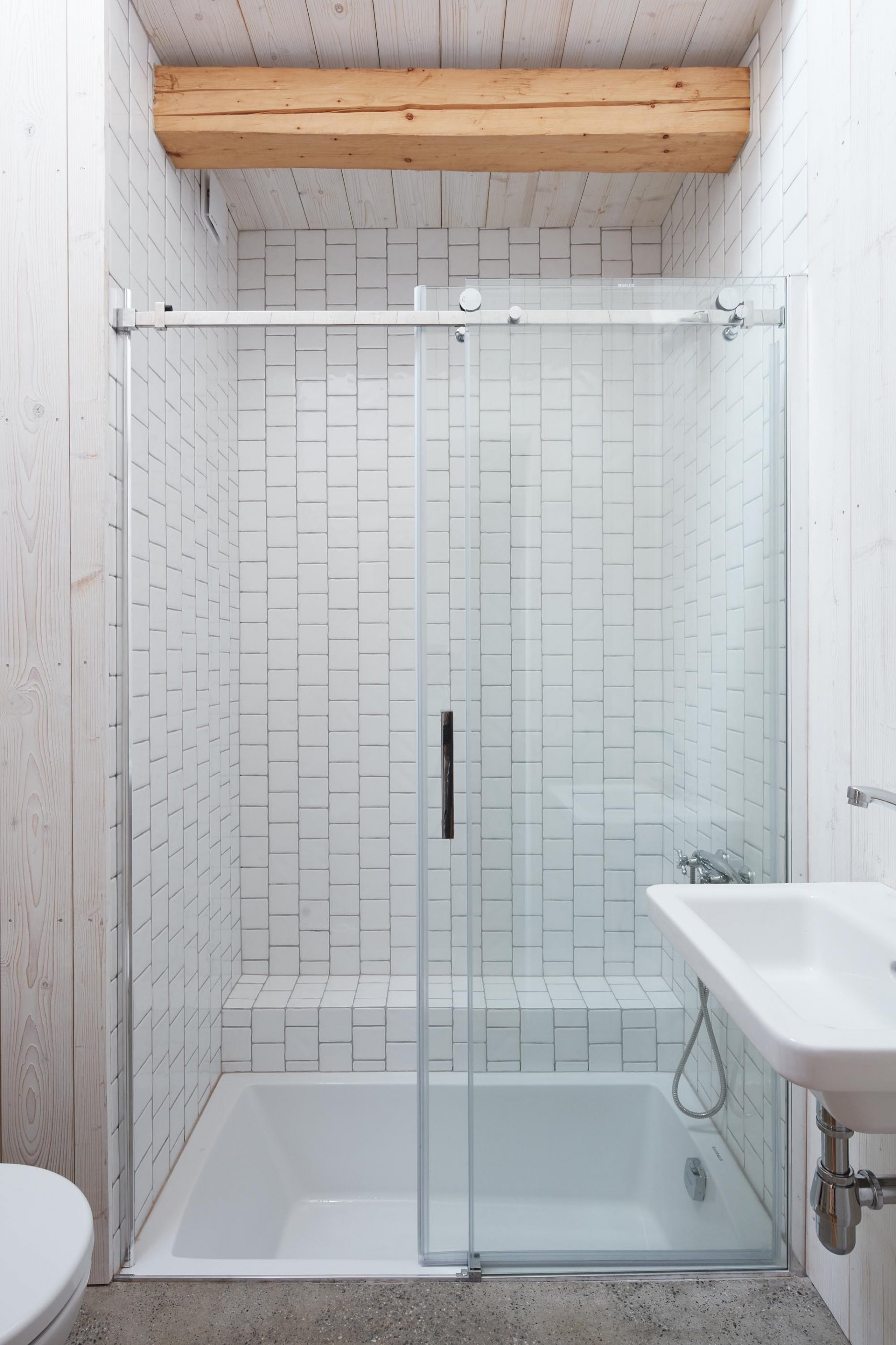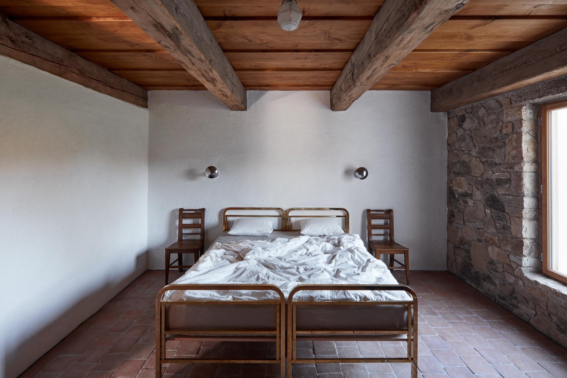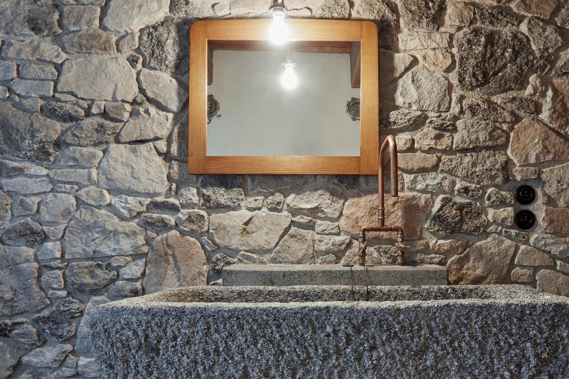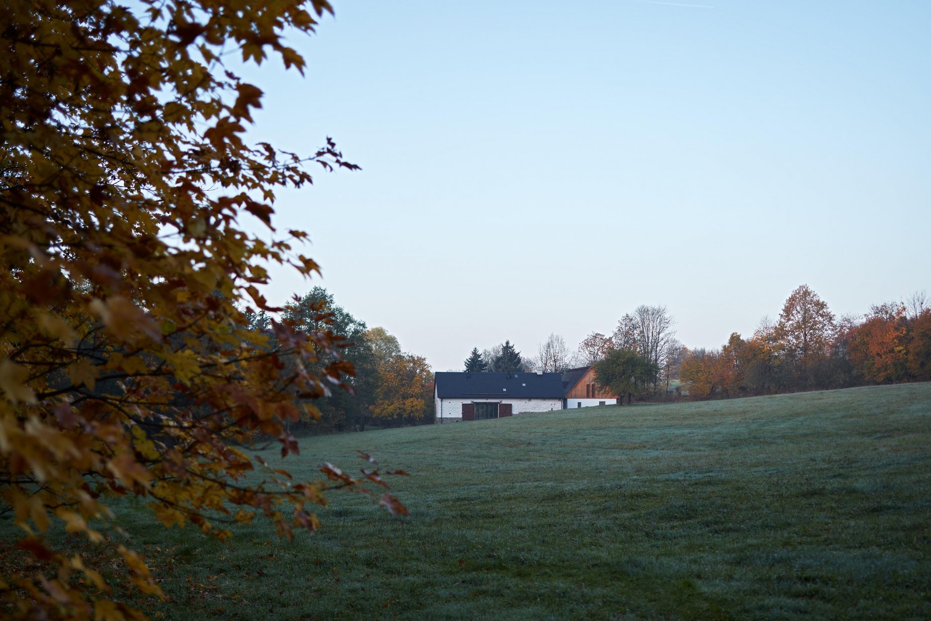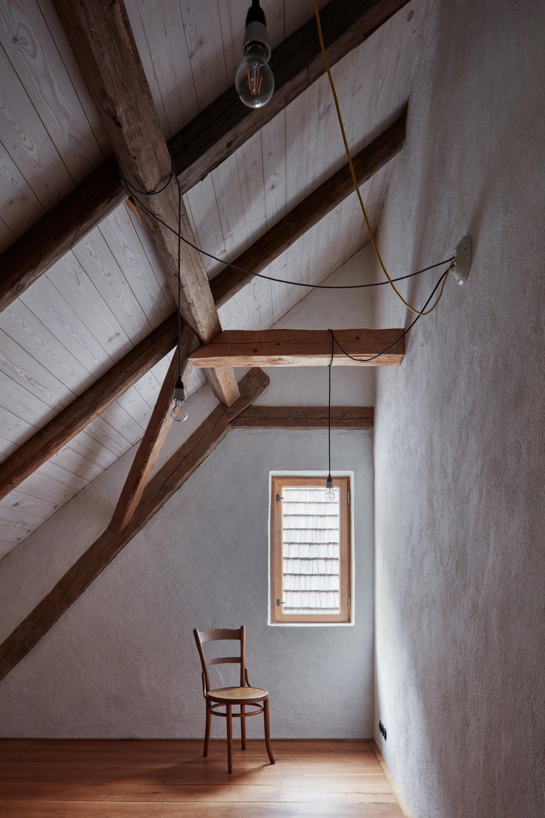 Pôvodné kamenné steny zostávajú vo vnútri odhalené. Murivo dopĺňa stena z pohľadového betónu s odtlačkami debniacich dosiek, ktorá ukrýva schodisko a saunu. Na pozadí svetlého zákrytu vyniká pôvodný krov a veľký otvorený priestor. Interiér sa nerušene otvára vďaka skladacím preskleným krídlam do záhrady i na lúku za domom. Presvetlenie zabezpečuje aj presklenie v štíte stodoly. Pomyselné srdce domu tvorí otvorený krb na kameni z neďalekej stráne.
