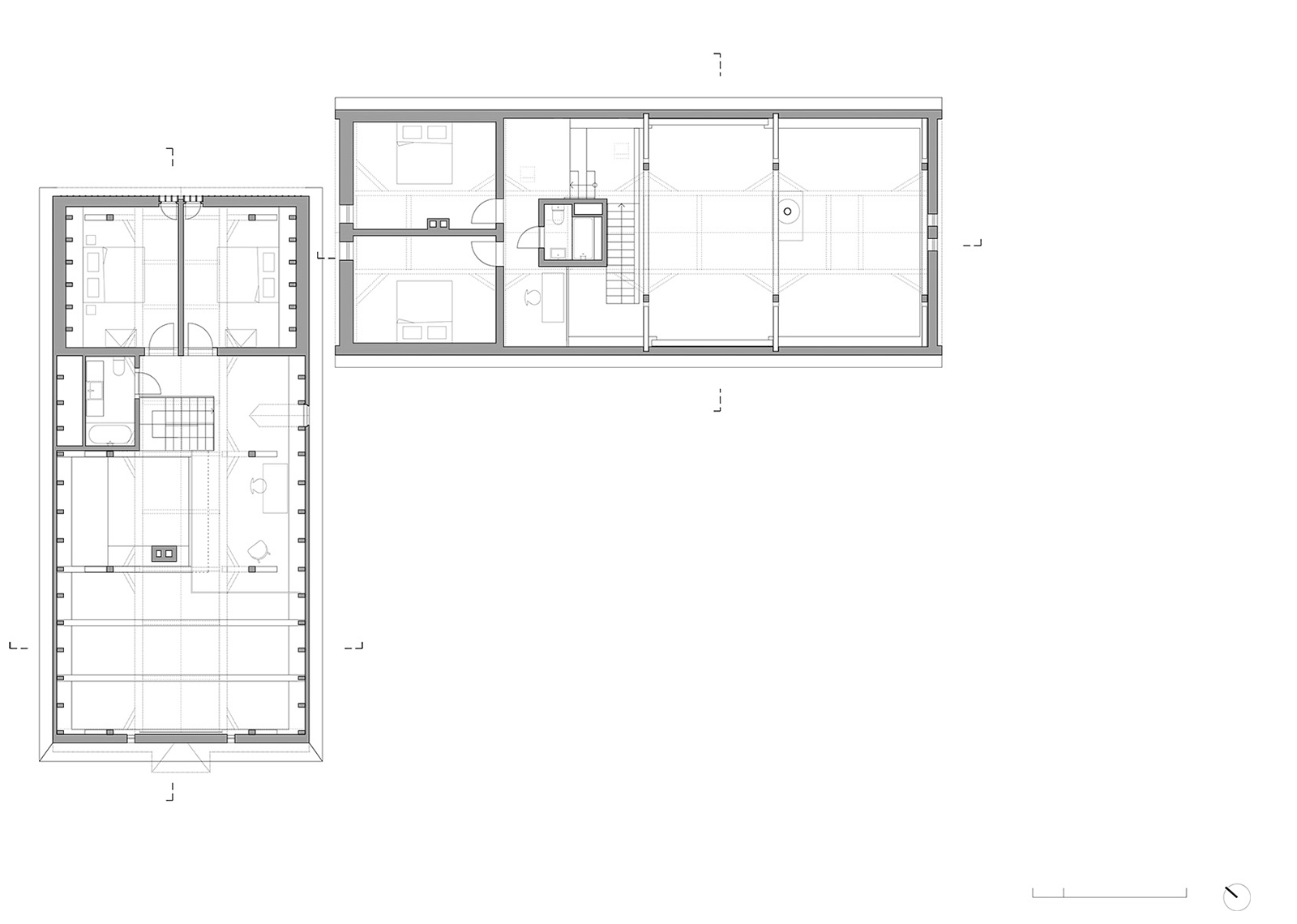 Dualita domov sa nesie celým návrhom - ich odlišný charakter a pôvodné využitie sa premietajú do novej prevádzky a celkového prístupu k rekonštrukcii.
