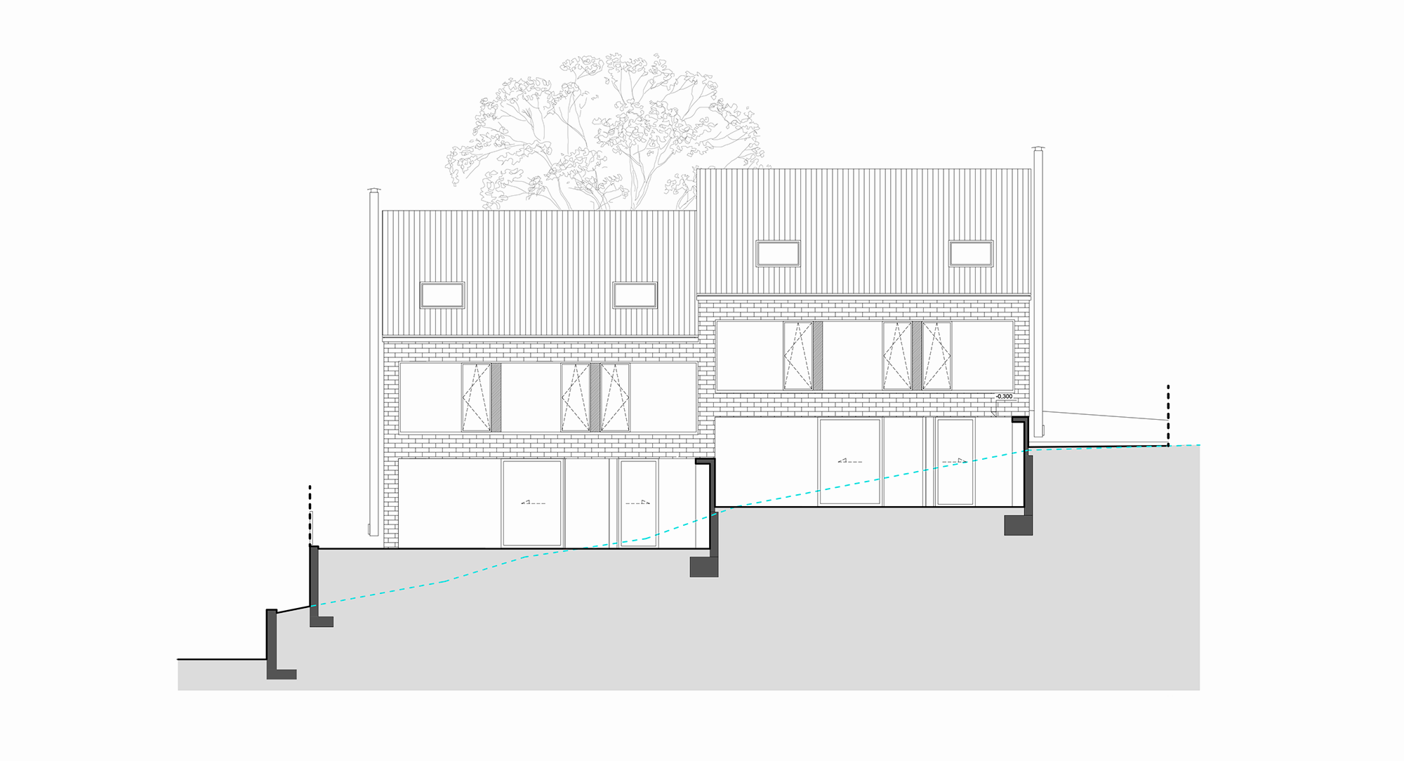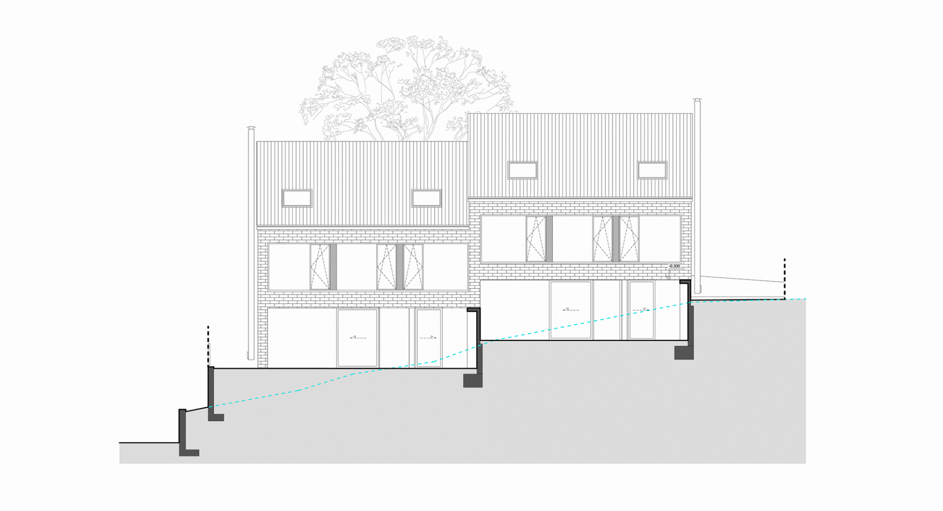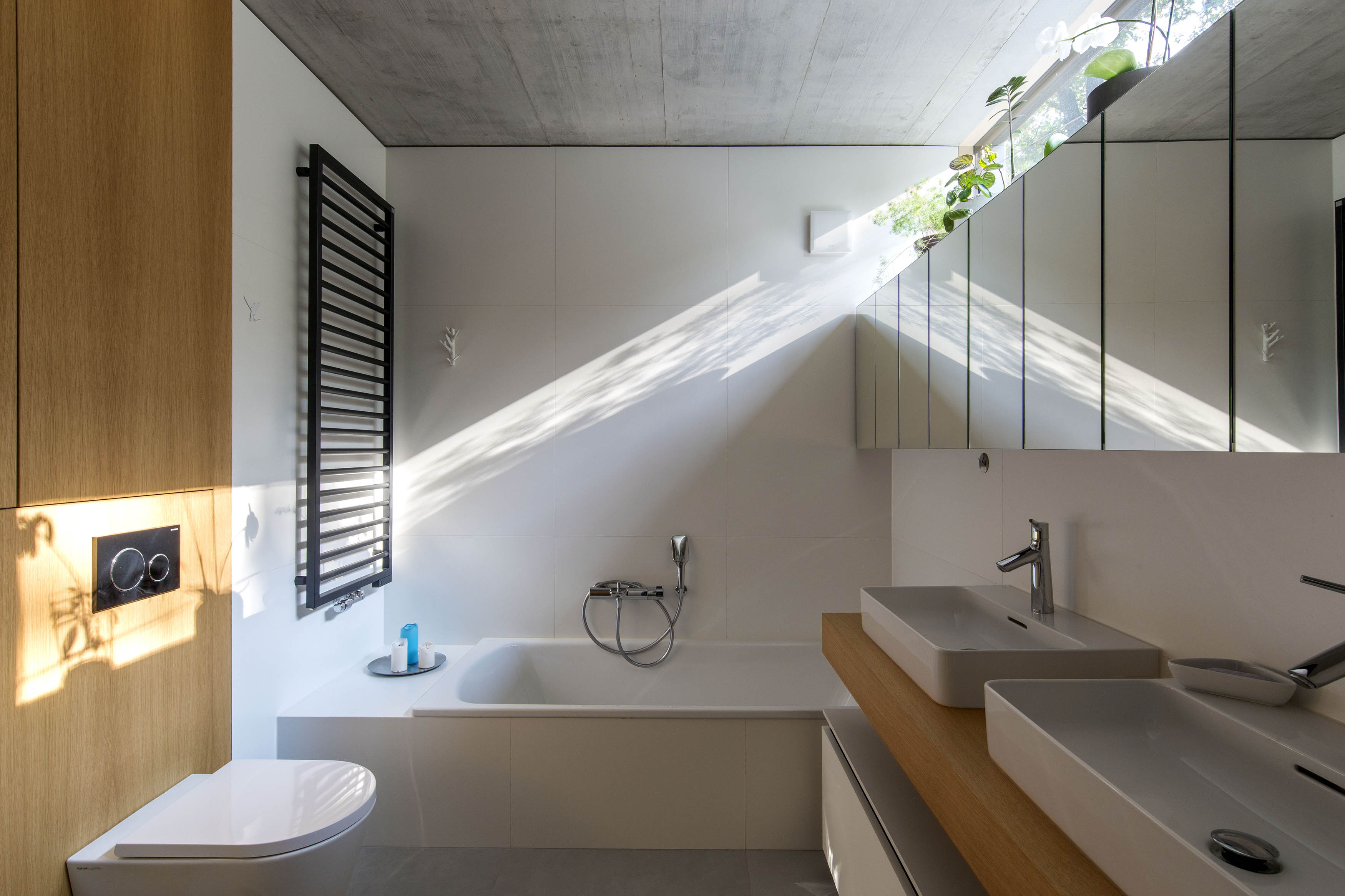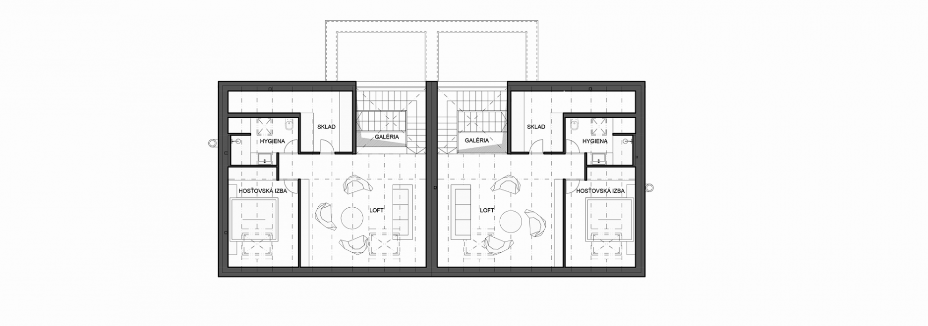 V interiéri vsadili architekti na kombináciu dubových podláh obkladov a nábytku s neutrálnymi bielymi stenami a stropom z pohľadového betónu. Celok dopĺňajú detaily ako drevohliníkové rámy zasklenia či dvere so skrytou zárubňou. Ako zdroj tepla slúži pec s akumulačnou stenou umiestnená v obývacej časti oboch bytových jednotiek.