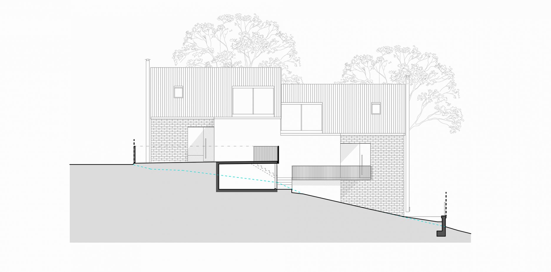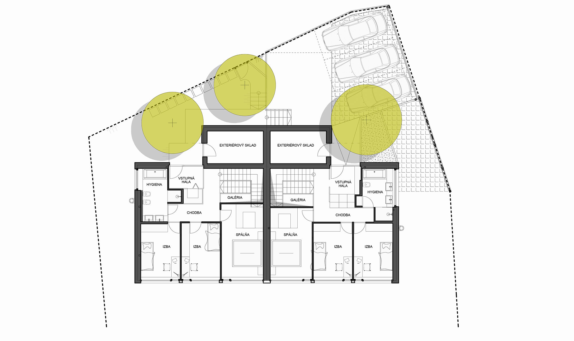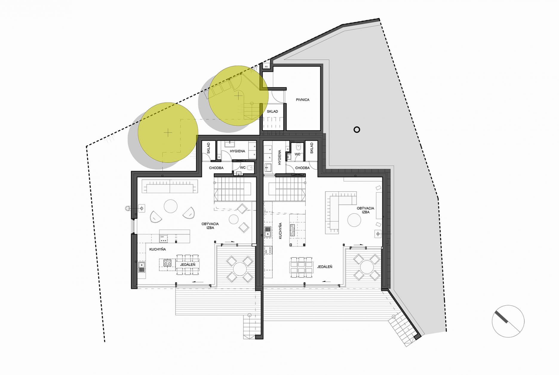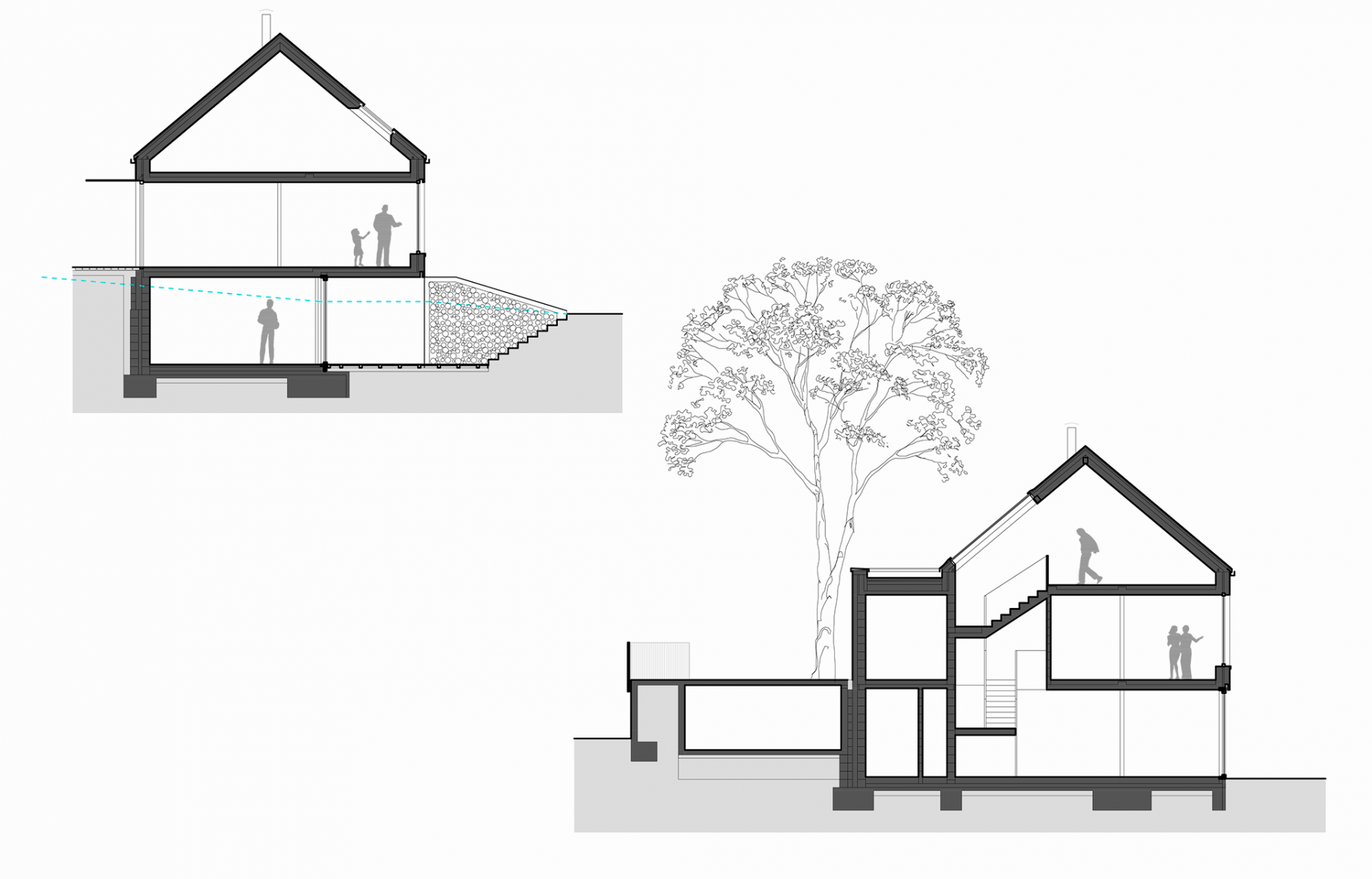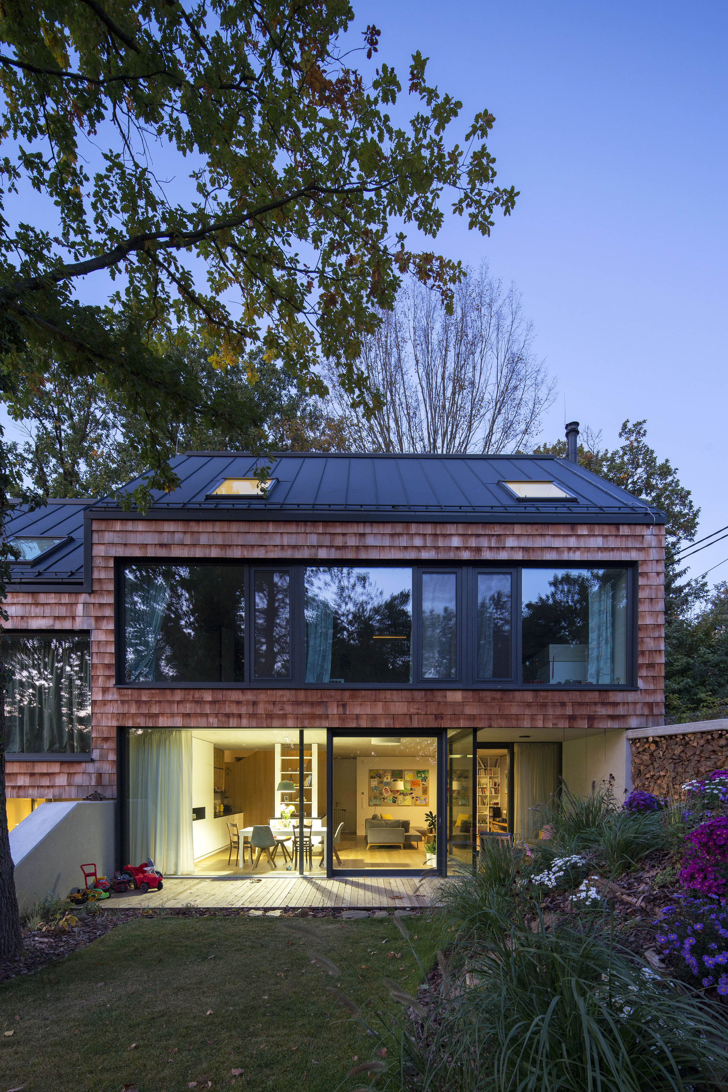 Nadzemné podlažie prístupné z ulice dopĺňa obytné podkrovie (hosťovský loft so samostatnou obytnou a odpočinkovou časťou) presvetlené päťmetrovými svetlíkmi s výhľadom do korún stromov. Pod svetlíkmi sa nachádza drevené otvorené schodisko, ktoré prepája vstupné podlažie (nočná časť domu) s izbami na najnižšom podlaží. Voľná dispozícia obytnej časti nadväzuje na terasovito upravenú plochu záhrady s drevenou pobytovou terasou. Všetky obslužné priestory sú situované na severovýchodnej strane (vrátane pivnice a skladu so samostatným vstupom). Naopak, juhozápadná fasáda sa prostredníctvom rozmerného zasklenia otvára k výhľadom do krajiny a na mesto. “Bývanie v peknom lese je v Bratislave vzácnosťou, preto sa okná zväčšili na maximálnu možnú mieru,” vysvetľujú architekti.