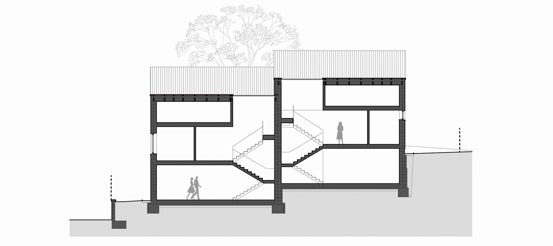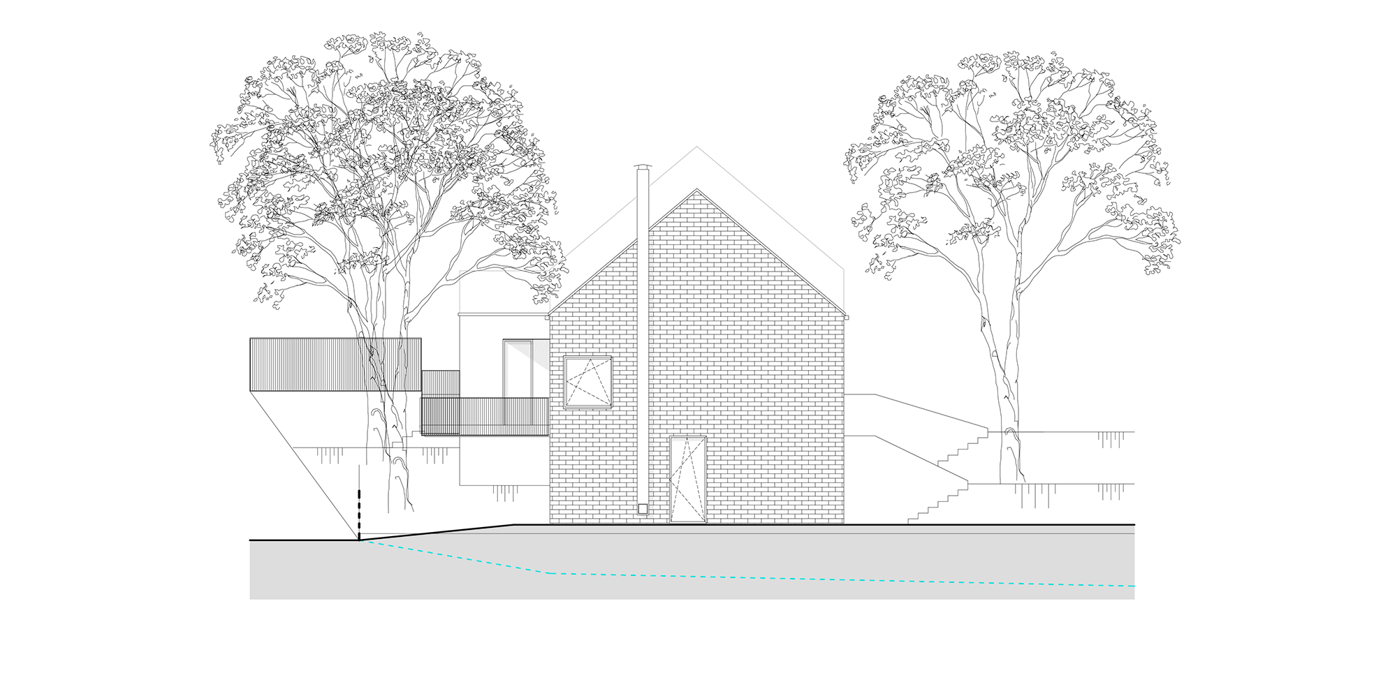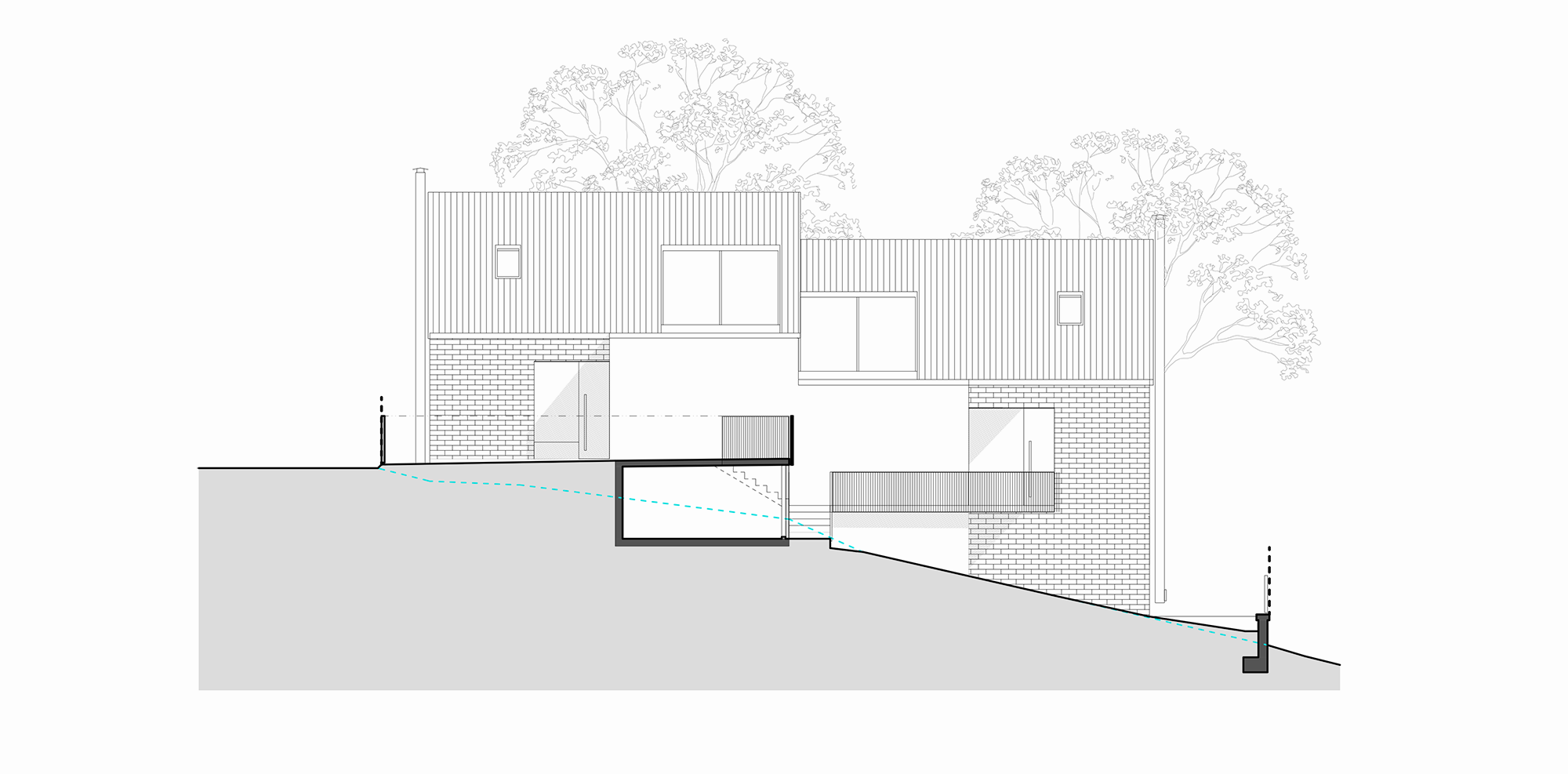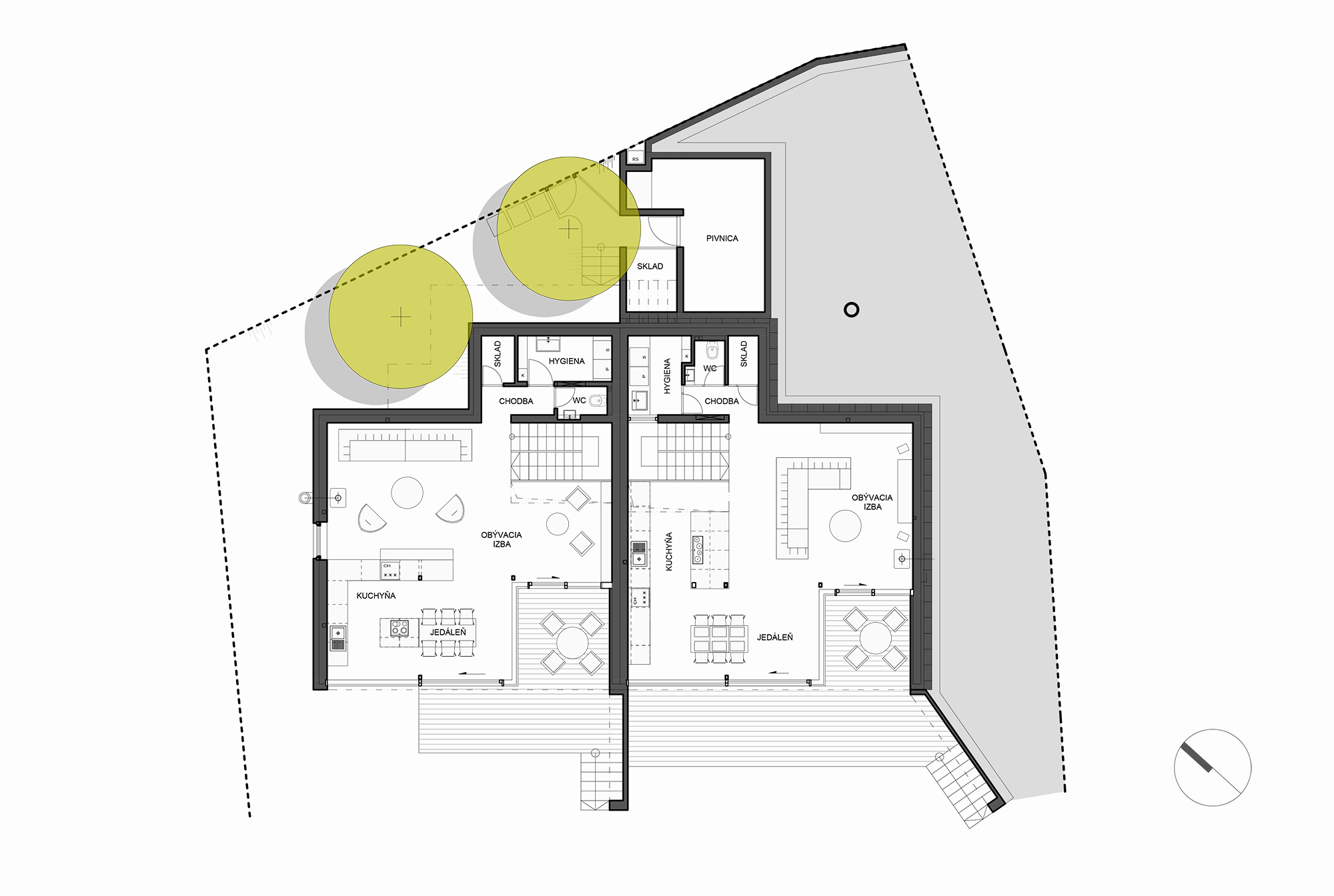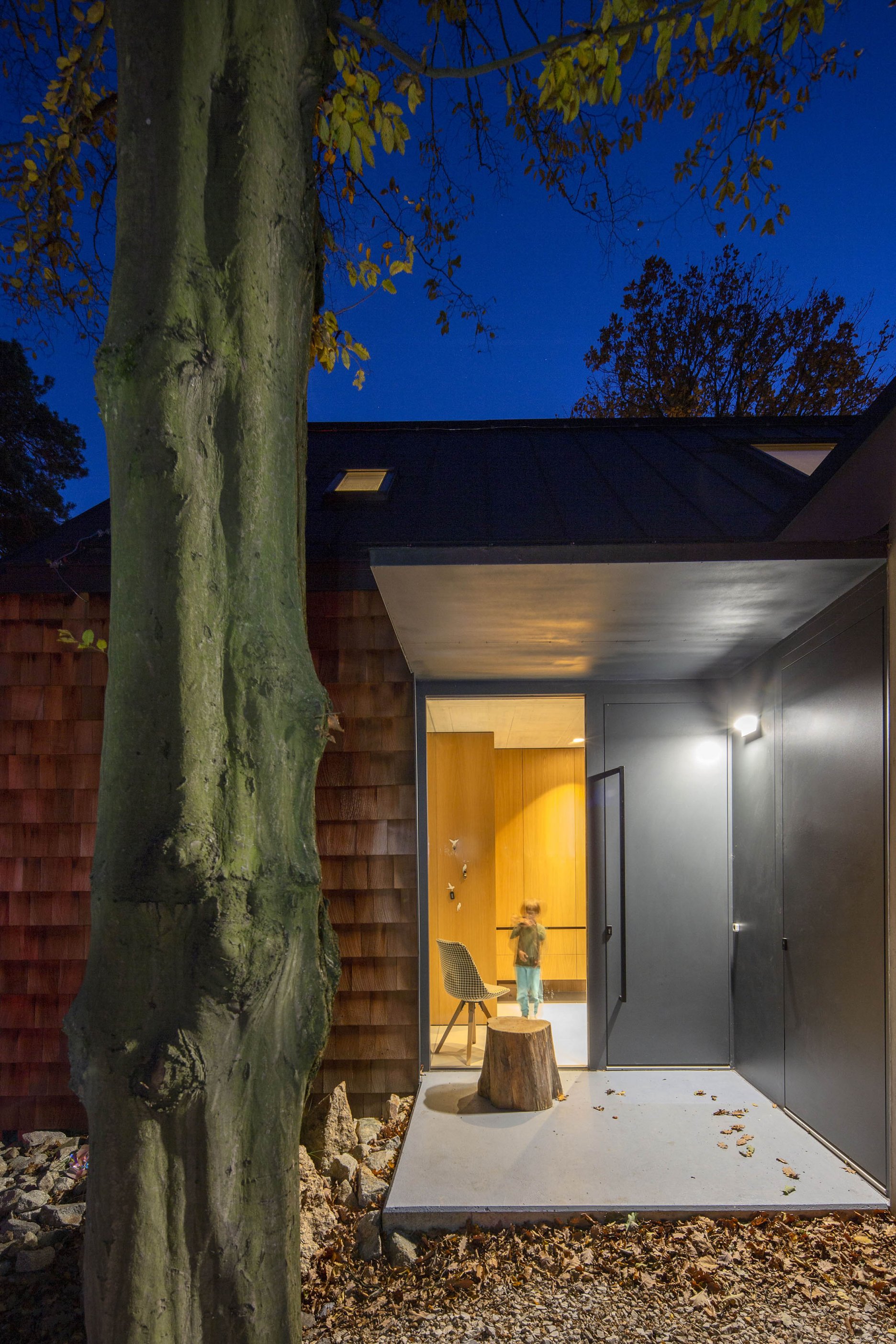 Nadzemné podlažie prístupné z ulice dopĺňa obytné podkrovie (hosťovský loft so samostatnou obytnou a odpočinkovou časťou) presvetlené päťmetrovými svetlíkmi s výhľadom do korún stromov. Pod svetlíkmi sa nachádza drevené otvorené schodisko, ktoré prepája vstupné podlažie (nočná časť domu) s izbami na najnižšom podlaží. Voľná dispozícia obytnej časti nadväzuje na terasovito upravenú plochu záhrady s drevenou pobytovou terasou. Všetky obslužné priestory sú situované na severovýchodnej strane (vrátane pivnice a skladu so samostatným vstupom). Naopak, juhozápadná fasáda sa prostredníctvom rozmerného zasklenia otvára k výhľadom do krajiny a na mesto. “Bývanie v peknom lese je v Bratislave vzácnosťou, preto sa okná zväčšili na maximálnu možnú mieru,” vysvetľujú architekti.