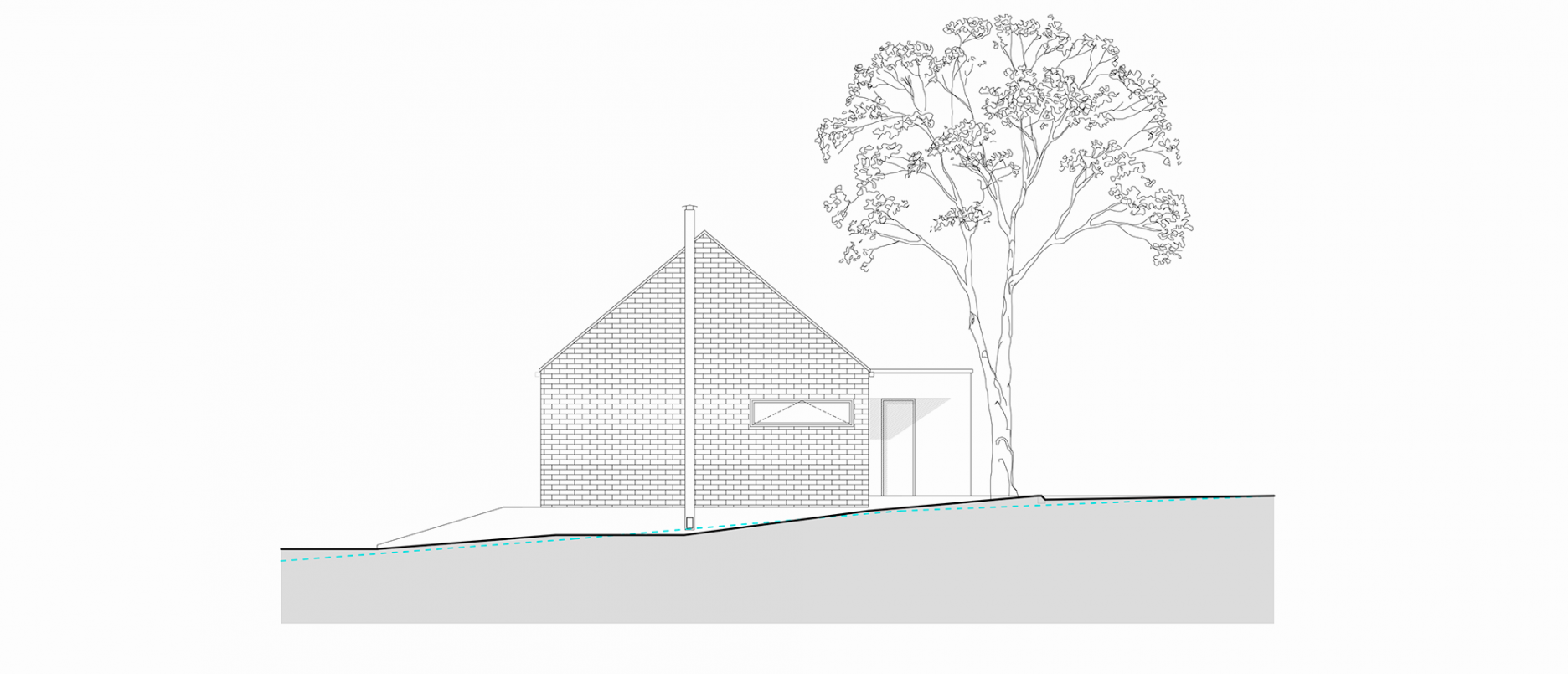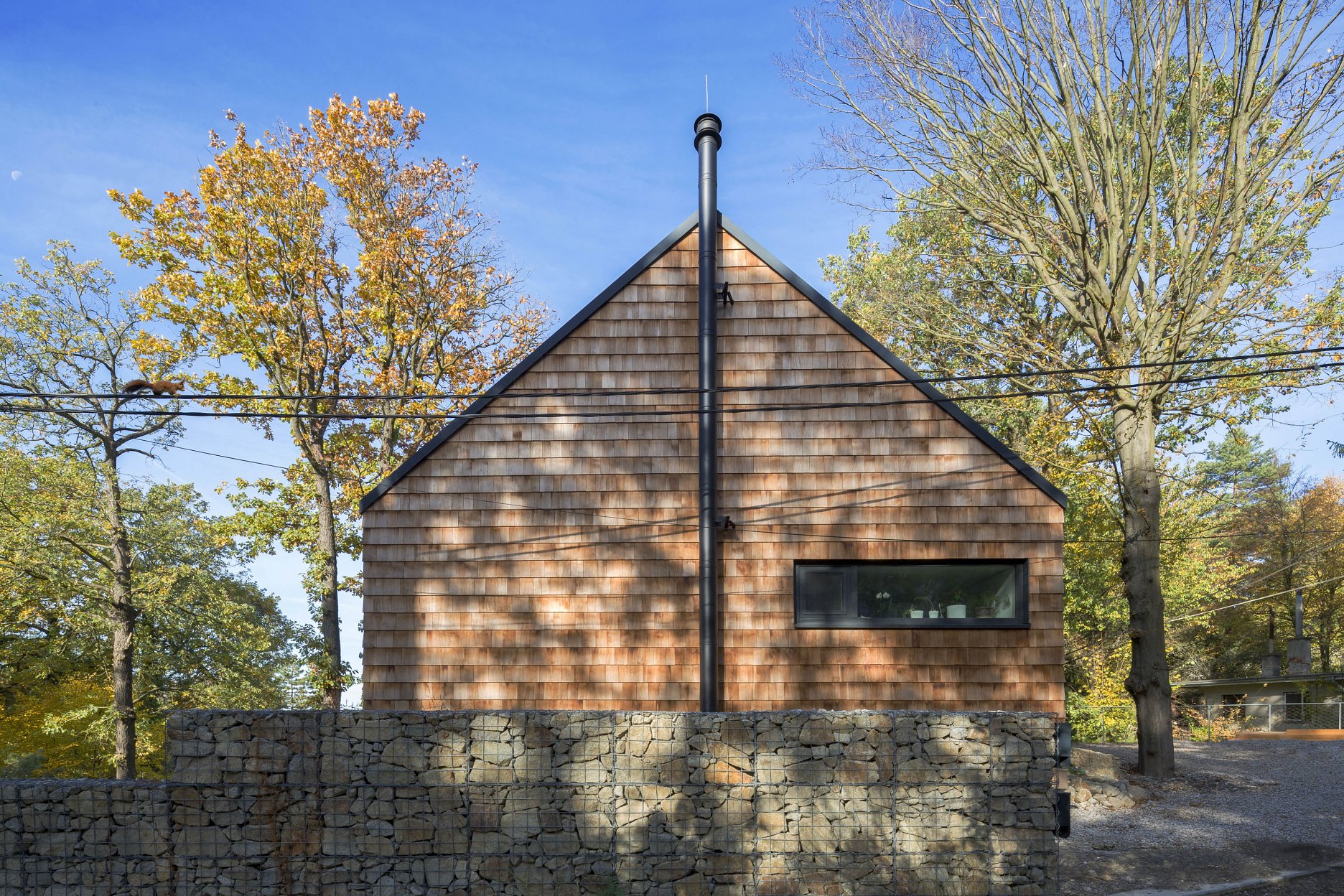 Za gabinovým múrikom sa ukrýva fasáda obložená šindľom z kanadského cédra. Nepravidelná textúra štiepaného dreva začína postupne nadobúdať príjemnú patinu. Skladbu materiálov zo strany exteriéru dopĺňa betón a plechová strešná krytina.