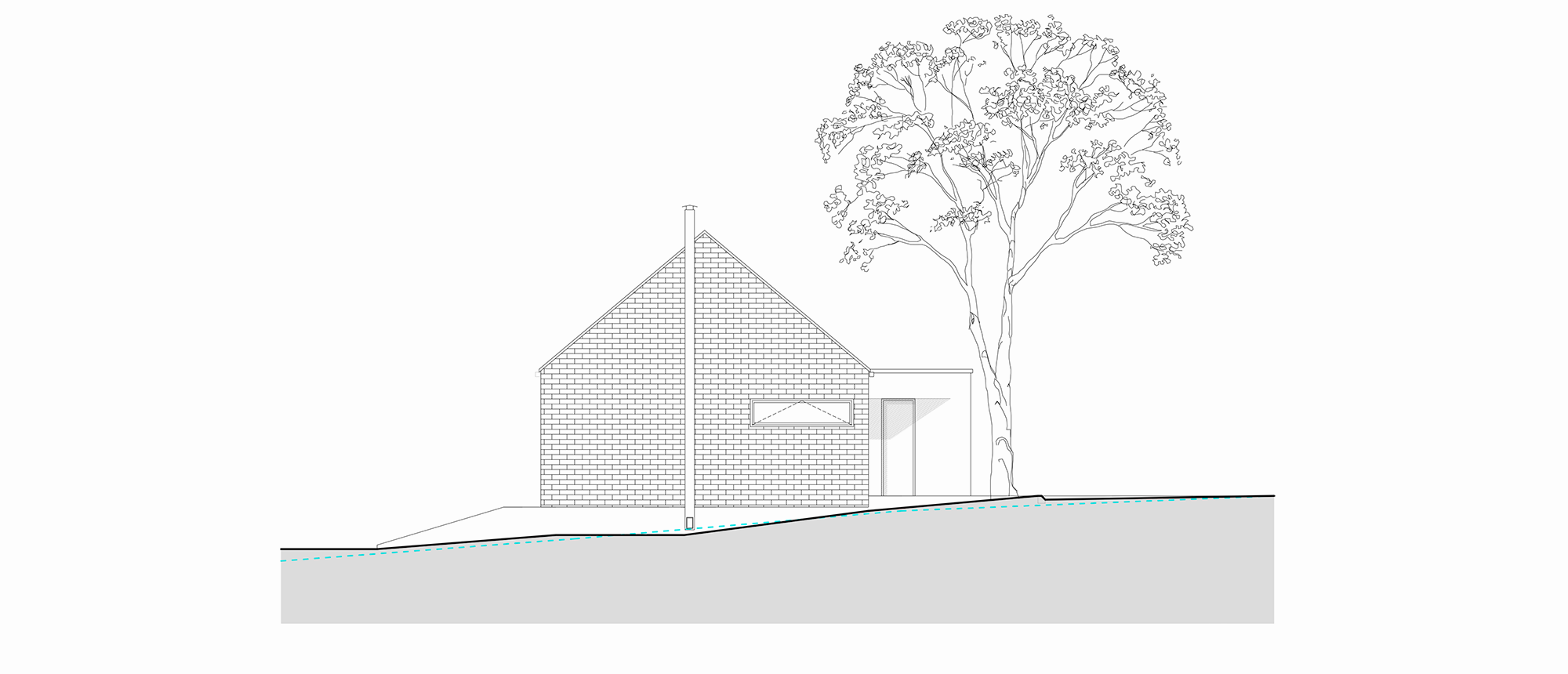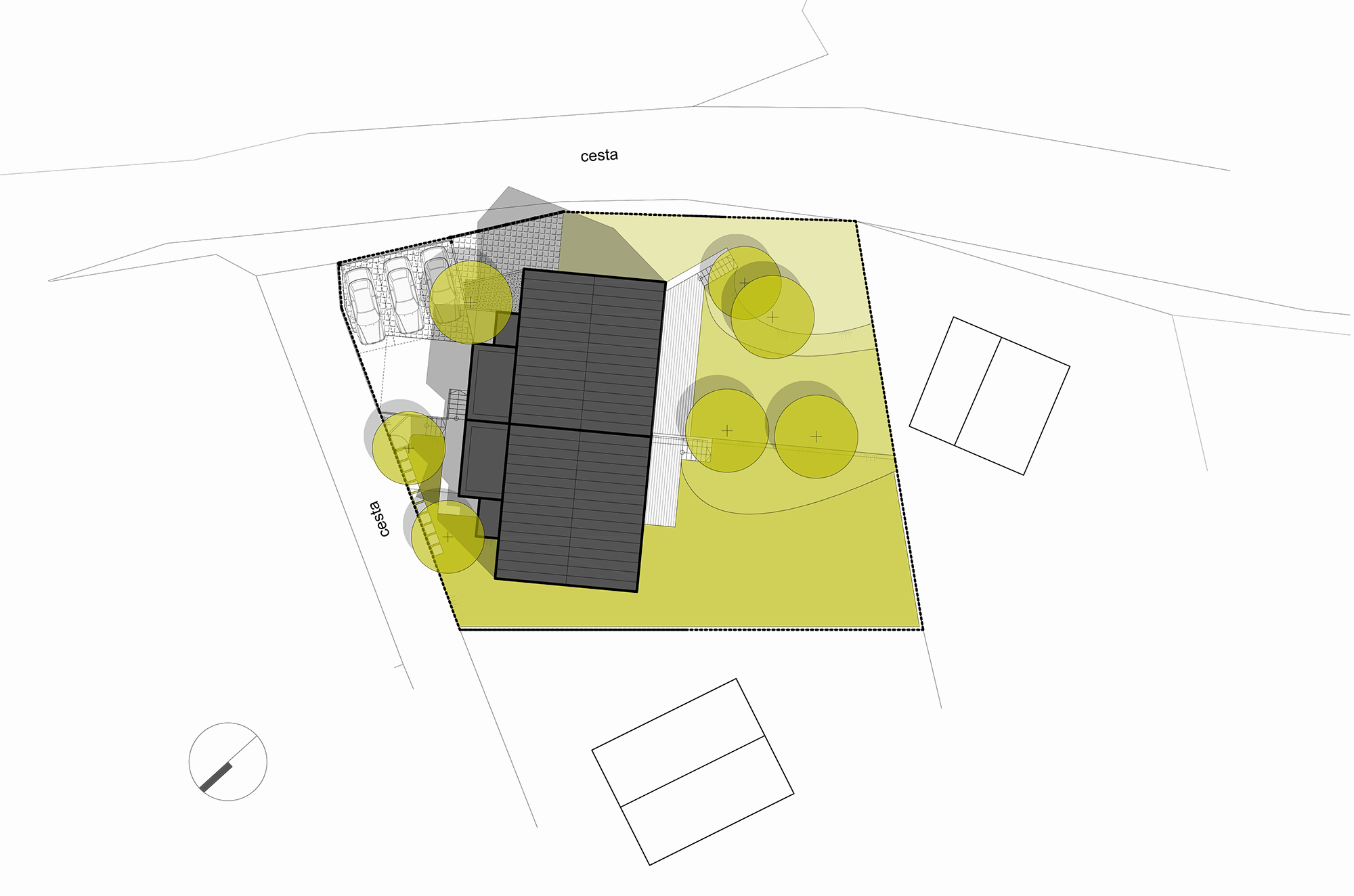 Nárožná parcela v rekreačnej oblasti Plánky sa zvažuje pomerne strmo na juhozápad. Pozemok je prístupný z úzkej asfaltovej cesty, parkuje sa na mlatovej ploche priamo pred spoločným vchodom do dvojdomov. Stavba sa prispôsobuje svahovitému terénu, spodné podlažie je zapustené pod úroveň ulice. Pri pohľade z cesty je viditeľné iba jedno poschodie so sedlovou strechou.