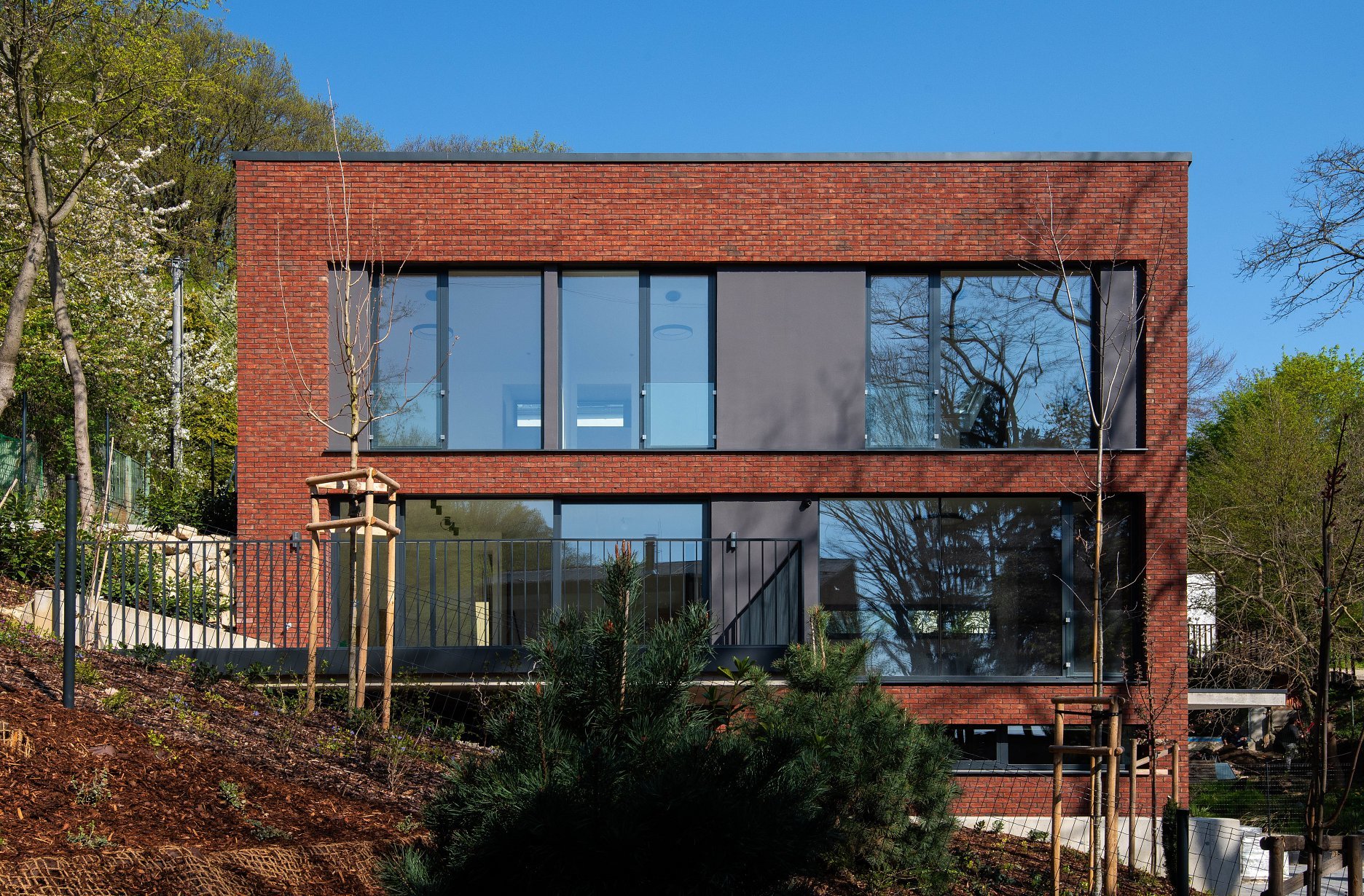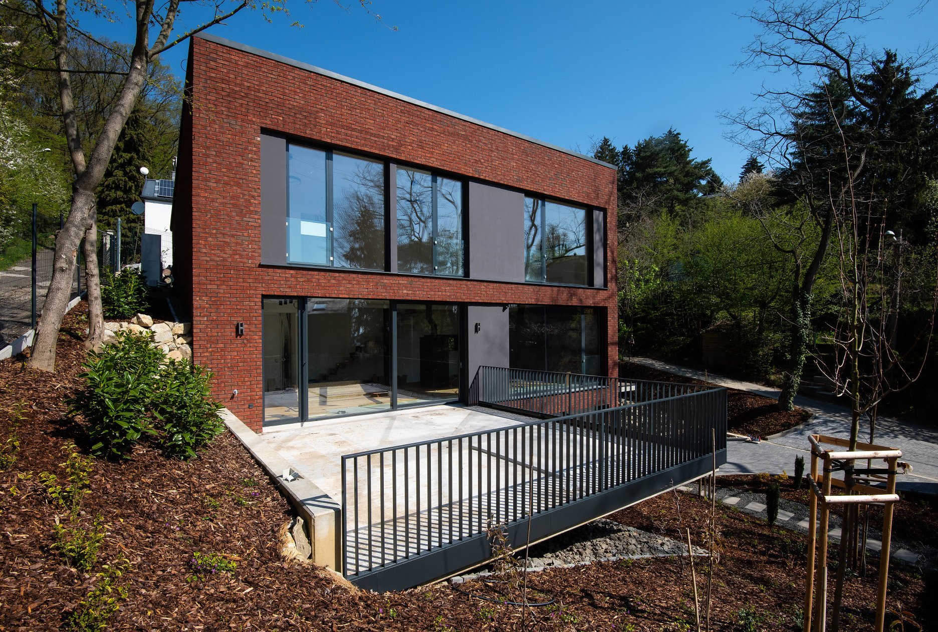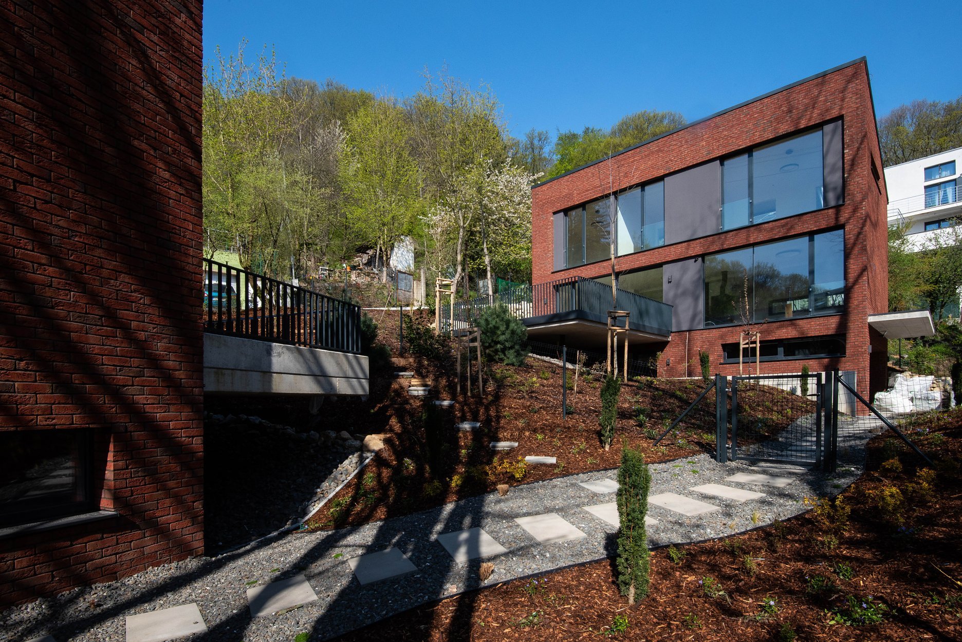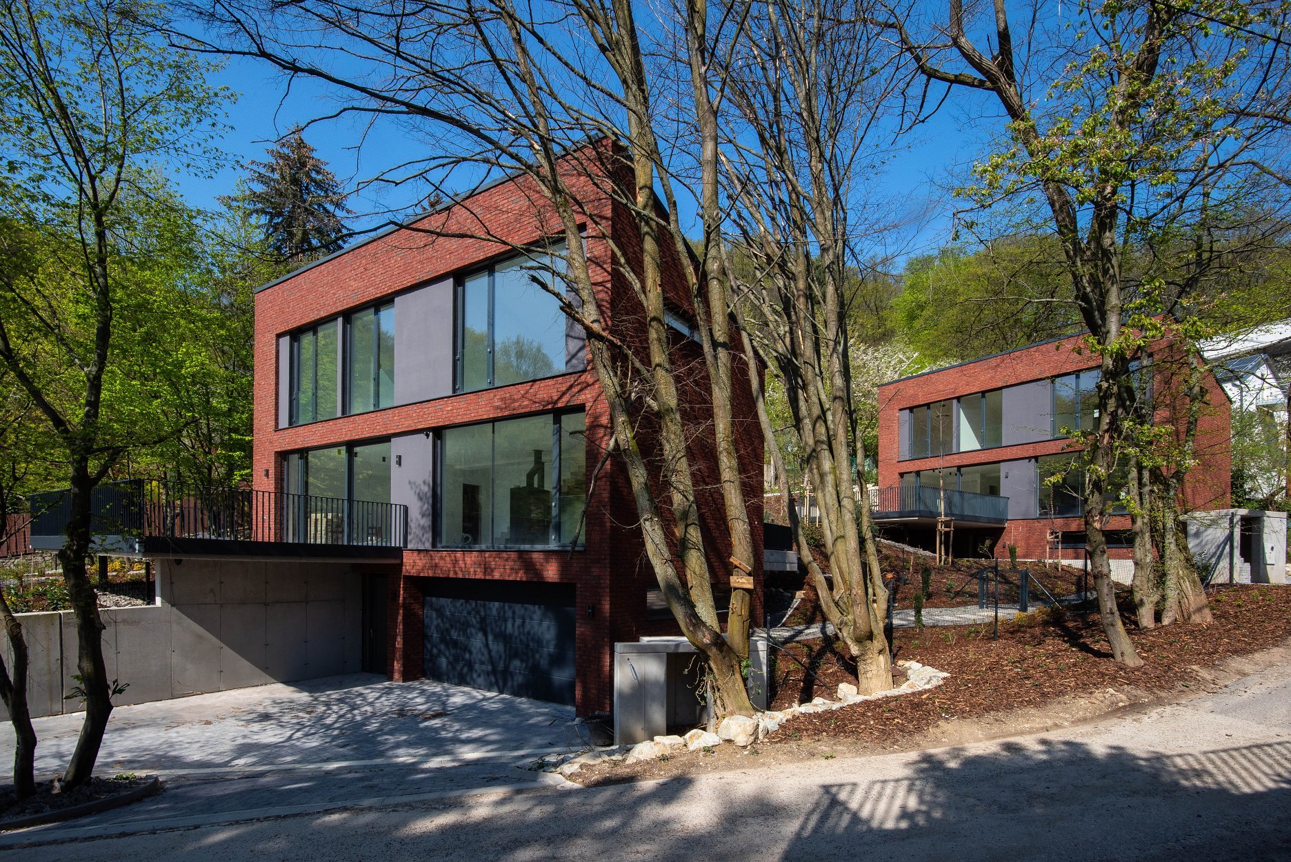 Domy majú železobetónovú konštrukciu, okná sú kovové čierne trojkomorové Aljval, tehlový obklad sa ako poťah vinie po stenách aj v interiéri, dopĺňajú ho dubové parkety a vstavaná kuchynská linka.