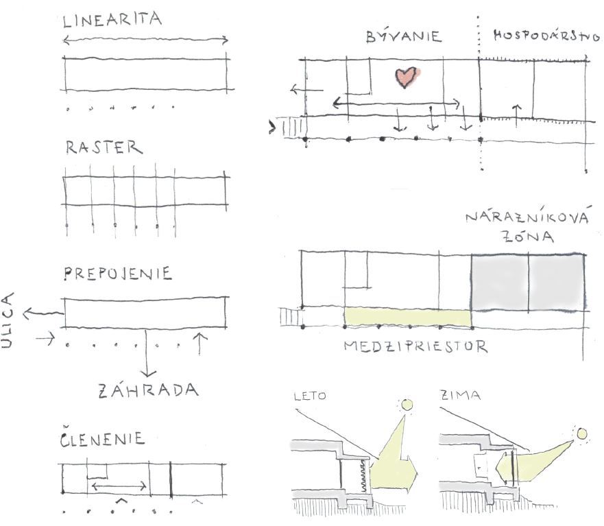 Návrh reaguje na linearitu, stĺporadie, orientáciu na svetové strany a polohu voči ulici a záhrade. Dom je členený na obytnú a hospodársku časť. To sa prejavuje v dispozíčnej schéme i vizuálnom riešení.