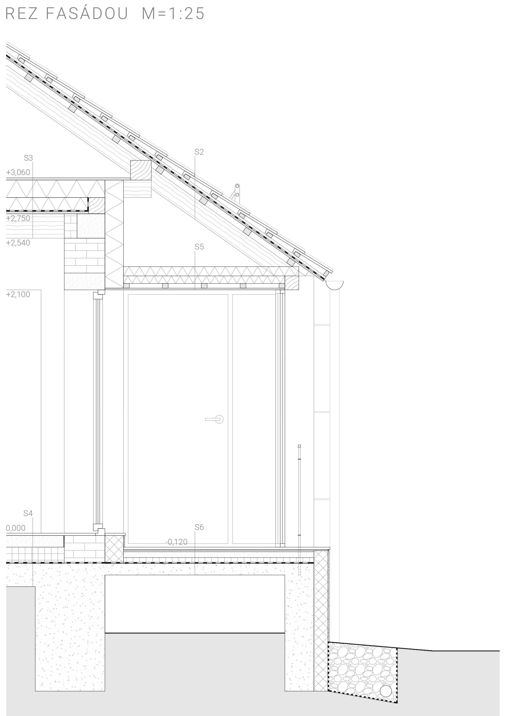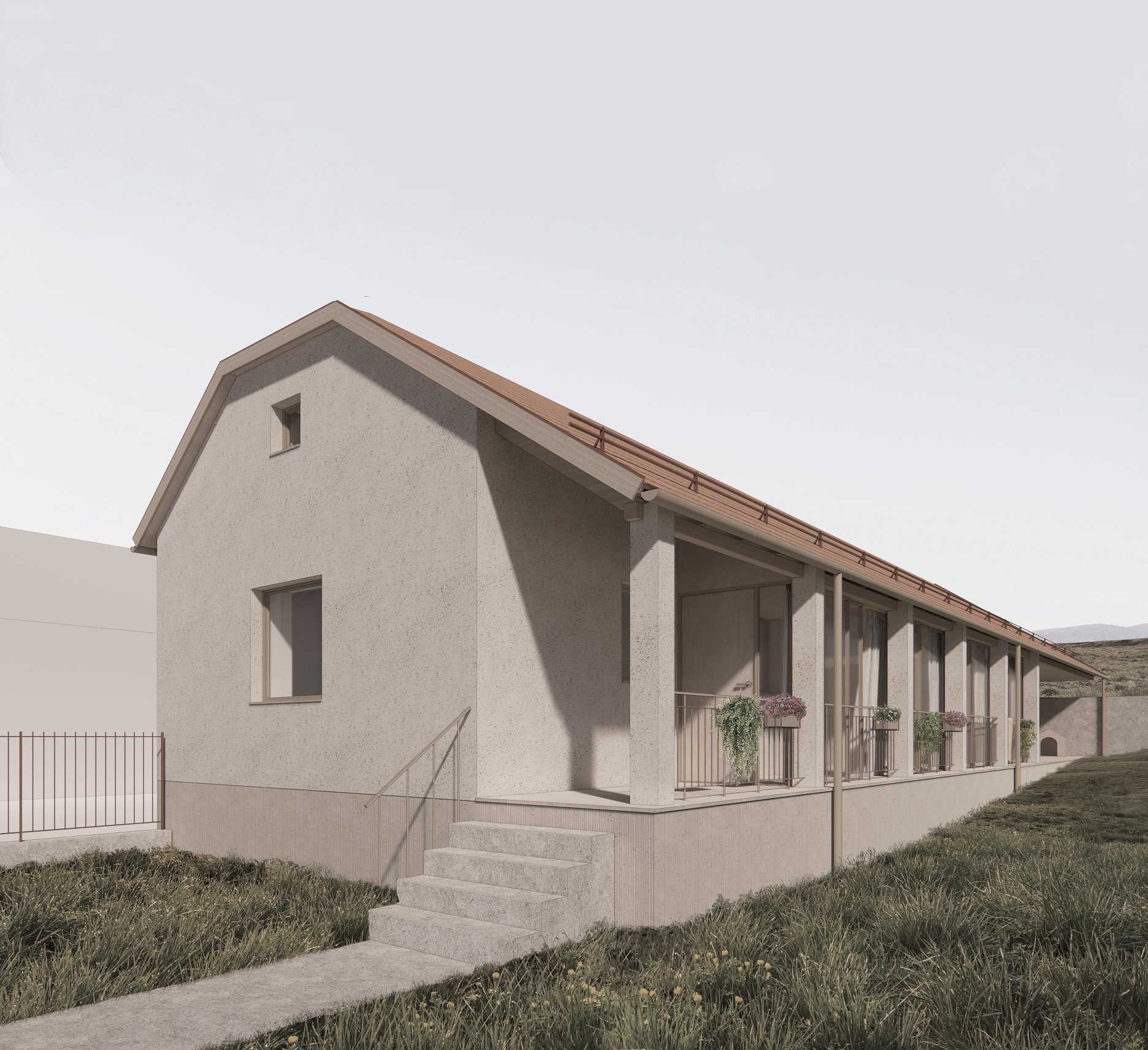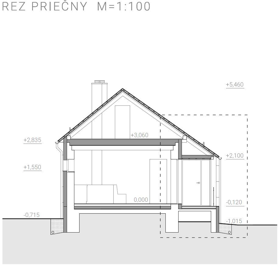 Je zachovaná pôvodná silueta domu, pričom novým prvkom je zasklenie časti gánku, čo vytvára ako energetickú, tak aj prevádzkovú pridanú hodnotu. Centrom domu je pec v spoločenskej časti.