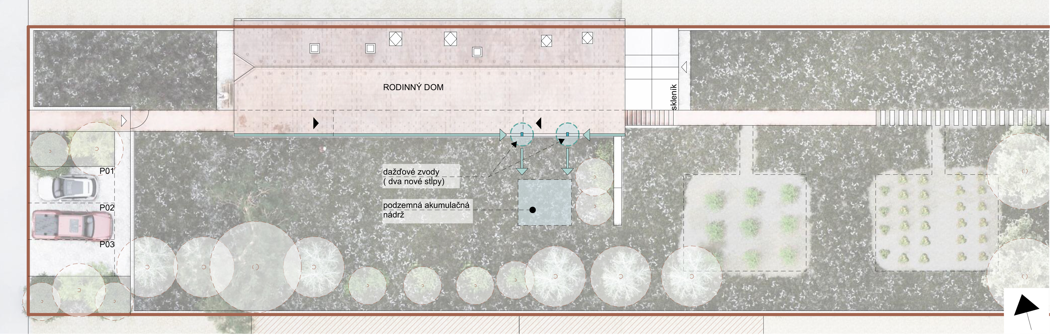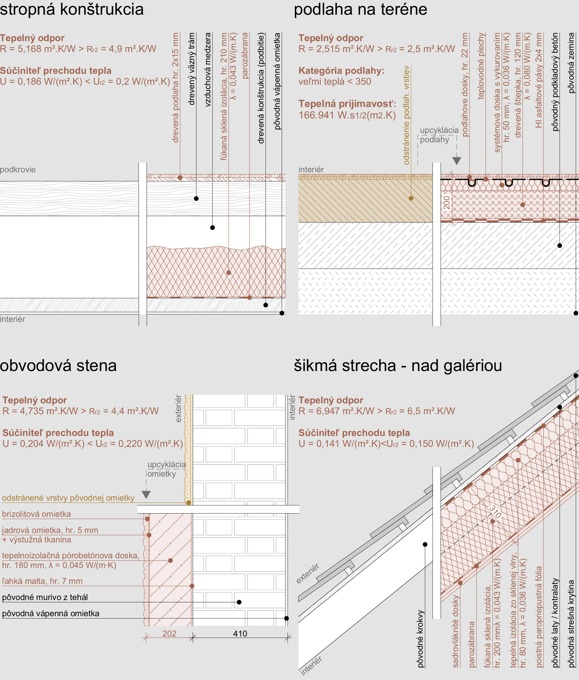 Pod oknami boli v niektorých prípadoch odstránené parapety z dôvodu zvýšenia solárnych ziskov a presvetleniu priestorov. Výnimkou je čelné okno, ktoré ostáva v pôvodnom stave – za neho bude osadené nové okno, ktoré bude energeticky efektívne a tak sa do pôvodného nebude musieť zasahovať, ani ho odstraňovať. Vzhľadom na to, že je severná fasáda objektu na hranici pozemku, nie je možné na fasáde osadiť nové okná, ktoré by prevetrali celý rodinný dom priečne. Z tohto dôvodu boli navrhnuté v strešnej rovine nové strešné okná, ktoré zabezpečia priečne prevetranie priamo, alebo zošikmenými koridormi „tunelmi“ do detských izieb.