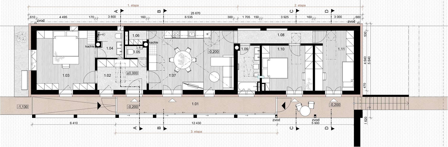 Realizáciu zmeny dispozície je možné riešiť aj v etapách. V prvej etape by bolo potrebné zrealizovať zádverie, hosťovskú izbu, kúpeľňu, WC, spoločenskú zónu a vyhotoviť zateplenie na fasádach, v strope a v podlahe. V druhej etape by bola zrealizovaná súkromná časť v zadnej časti domu a ako poslednou etapou by bolo zasklenie gánku, realizácia spevnených plôch gánku, zateplenie strechy (mimo teplovýmennej obálky) a vyhotovenie podláh v podkroví.