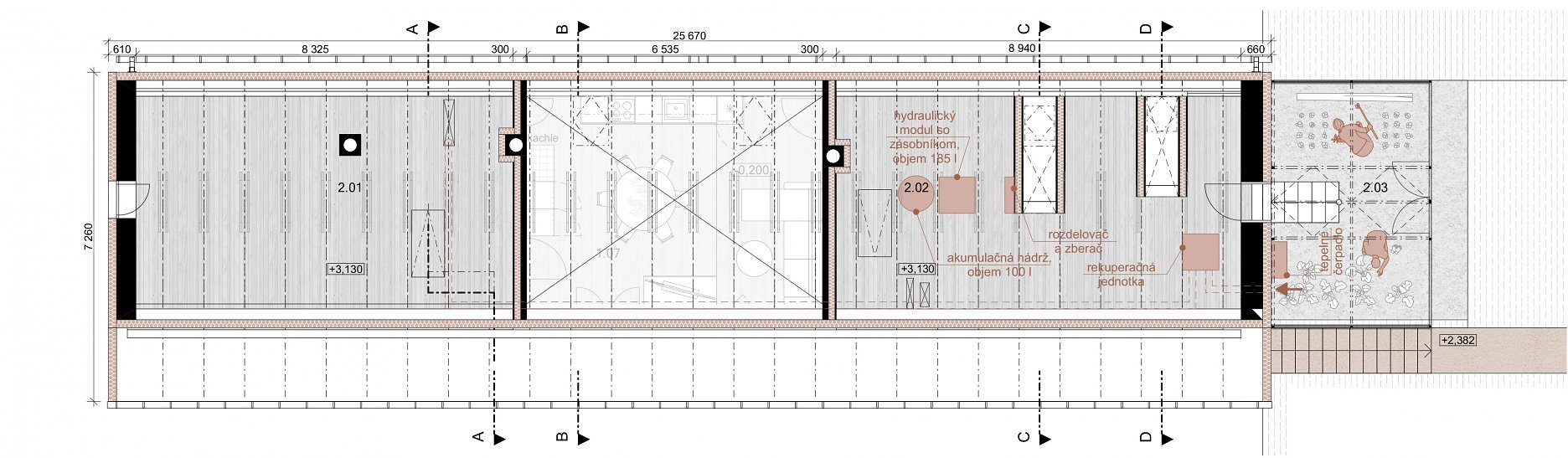 Podkrovie je rovnako rozdelené na tri časti, z ktorých dve budú využívané na skladovanie a umiestnenie technológie a v tretej časti je navrhnutá galéria spoločenskej zóny. Technický priestor v podkroví je okrem padacích dvierok na prízemí prístupný aj priamo z exteriéru cez skleník.