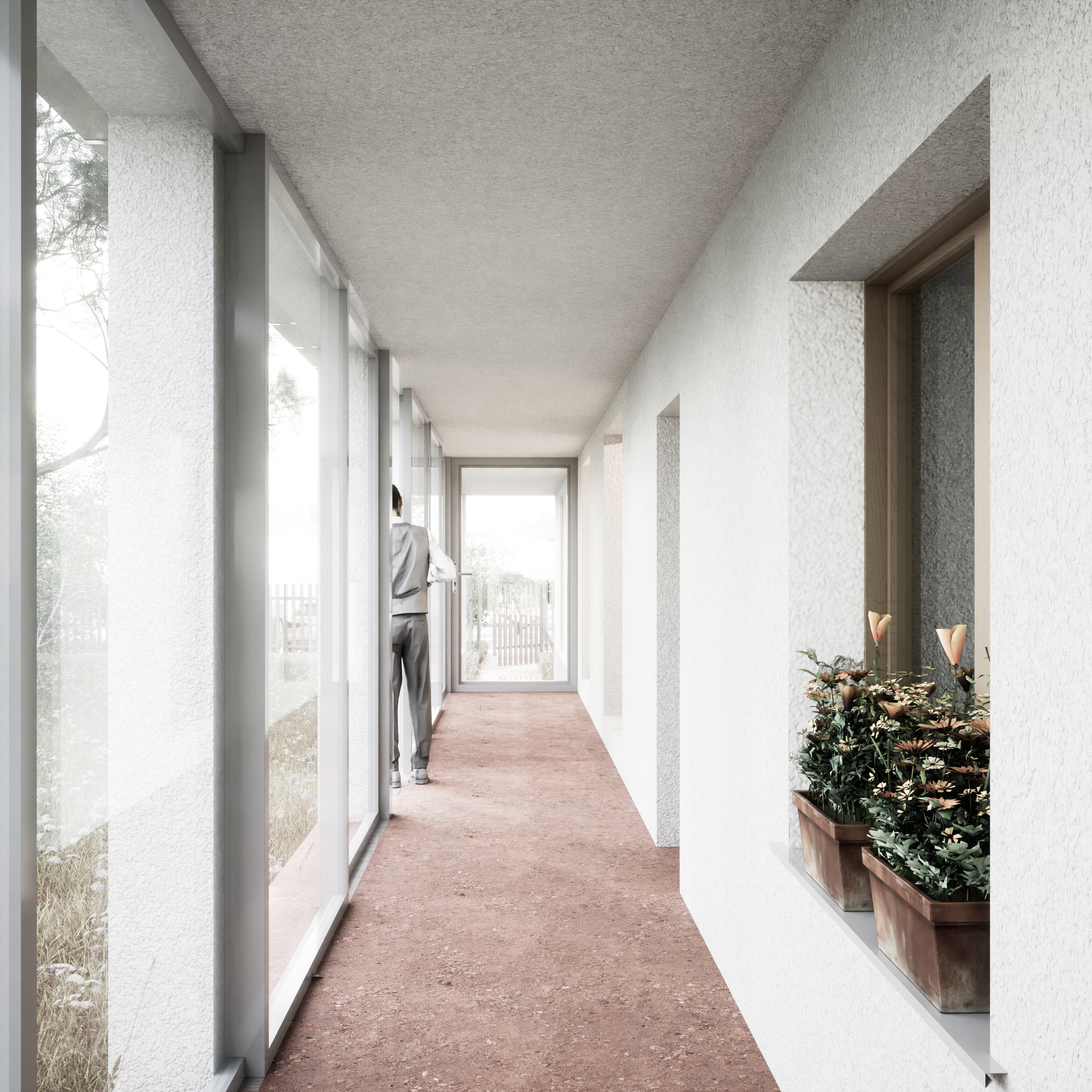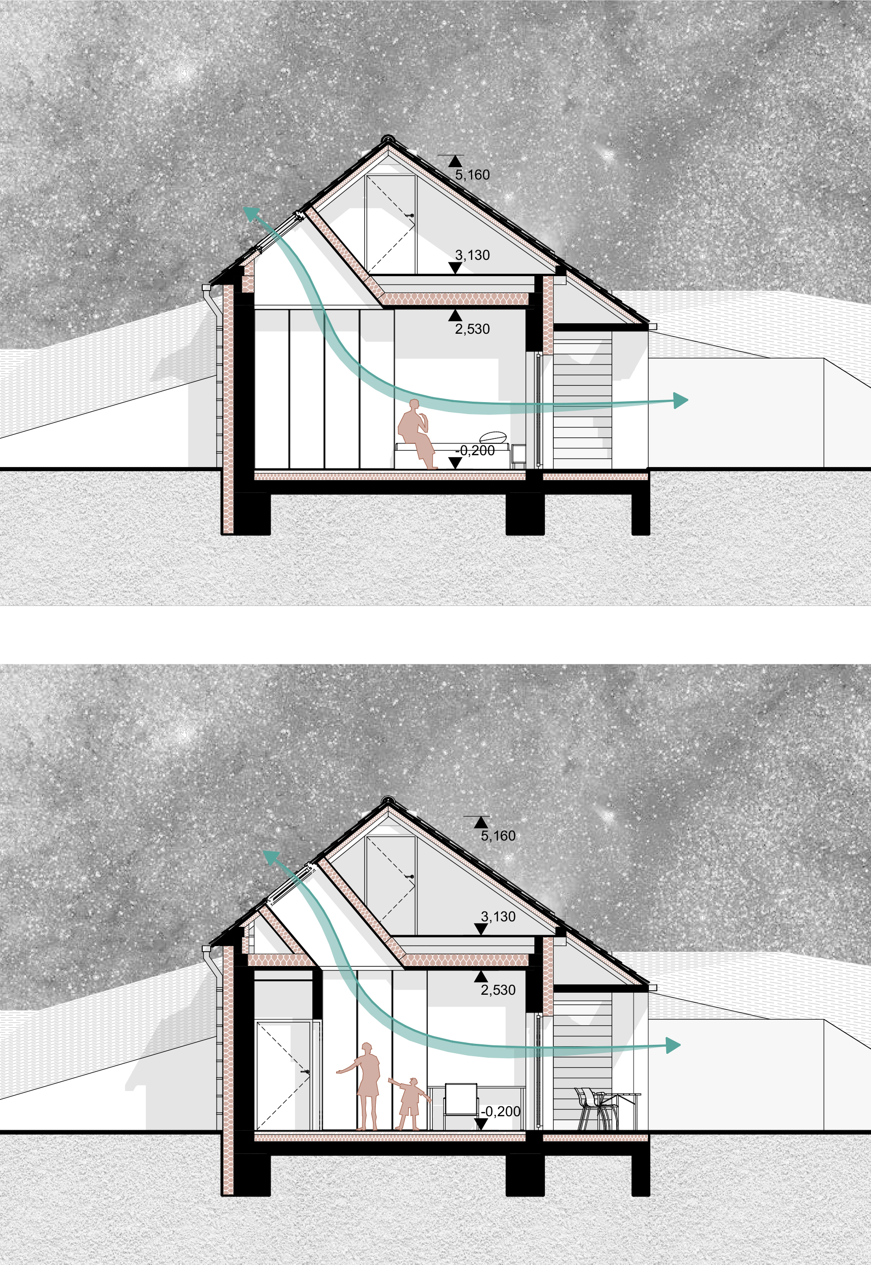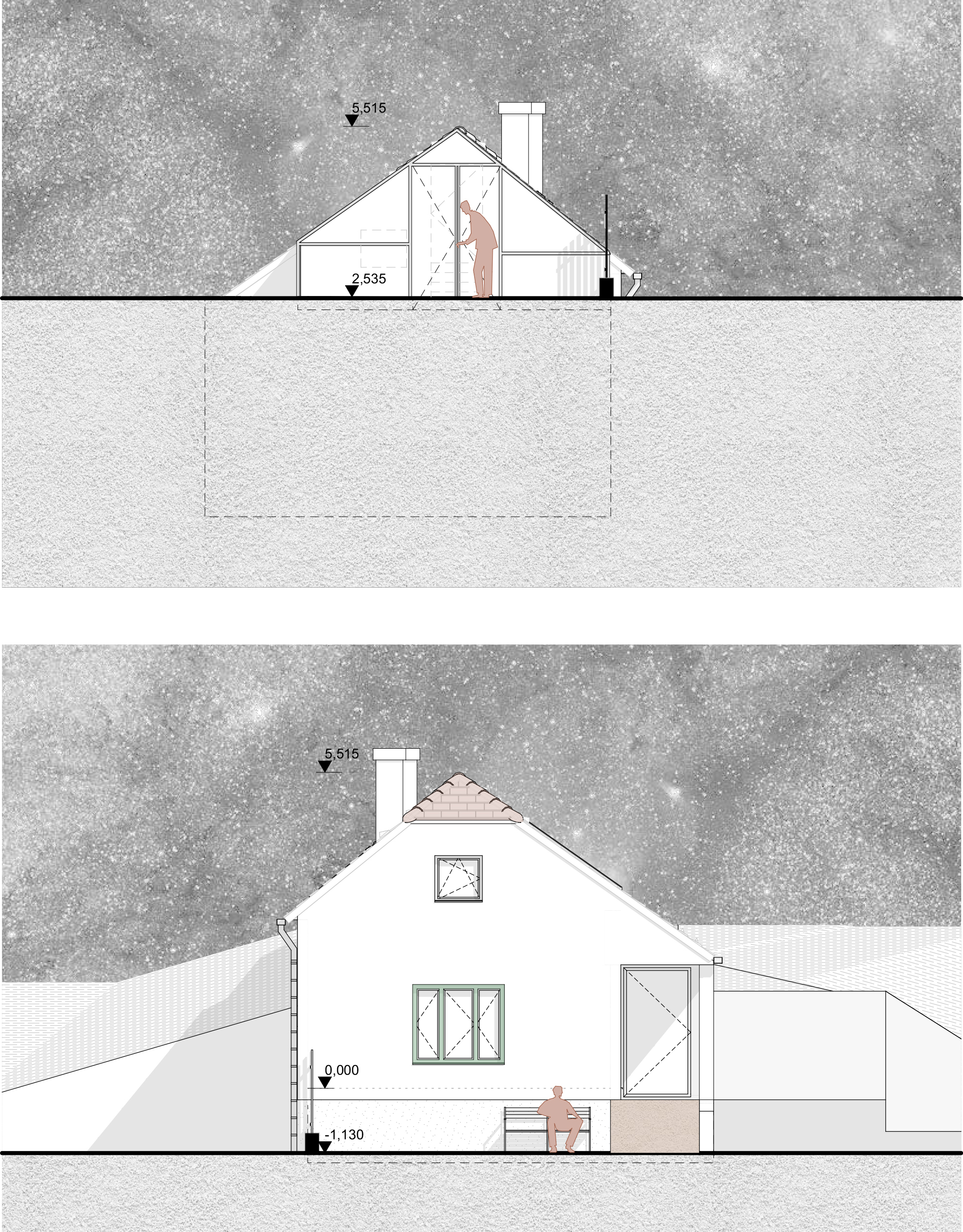 Na priečelí gánku je zároveň jasne čítať súkromnú a spoločenskú zónu domu. Pred spoločenskou zónou je navrhnutá zimná záhrada tvorená posuvným presklením, ktoré zreteľným spôsobom deklaruje svoj súčasný vstup – novú kultúrnu vrstvu, ktorá tak cituje pôvodnú polohu niekdajšieho zasklievania. Zároveň zasklenie zvyšuje energetickú efektivitu domu a vďaka jeho možnému celoplošnému otvoreniu dom nestráca možnosť priečneho vetrania. Cez zasklenie je možné čítať charakter bočnej fasády s rôznymi rozmermi otvorov, ktoré sú pre dom typické. Ďalším medzipriestorom, ktorý je do architektúry integrovaný, je skleník za domom, ktorý lemuje figúru domu a je priamo prístupný z osi gánku.