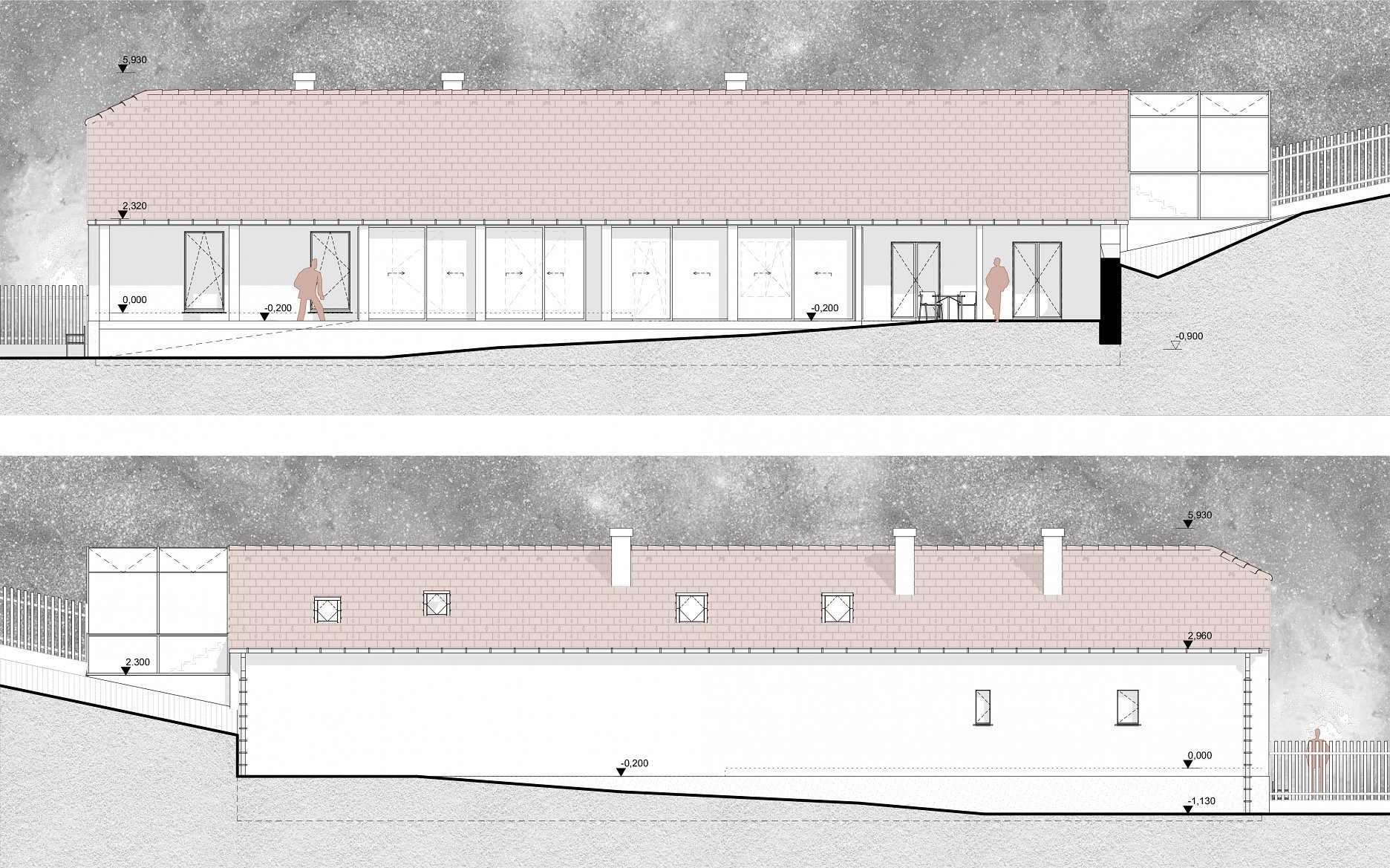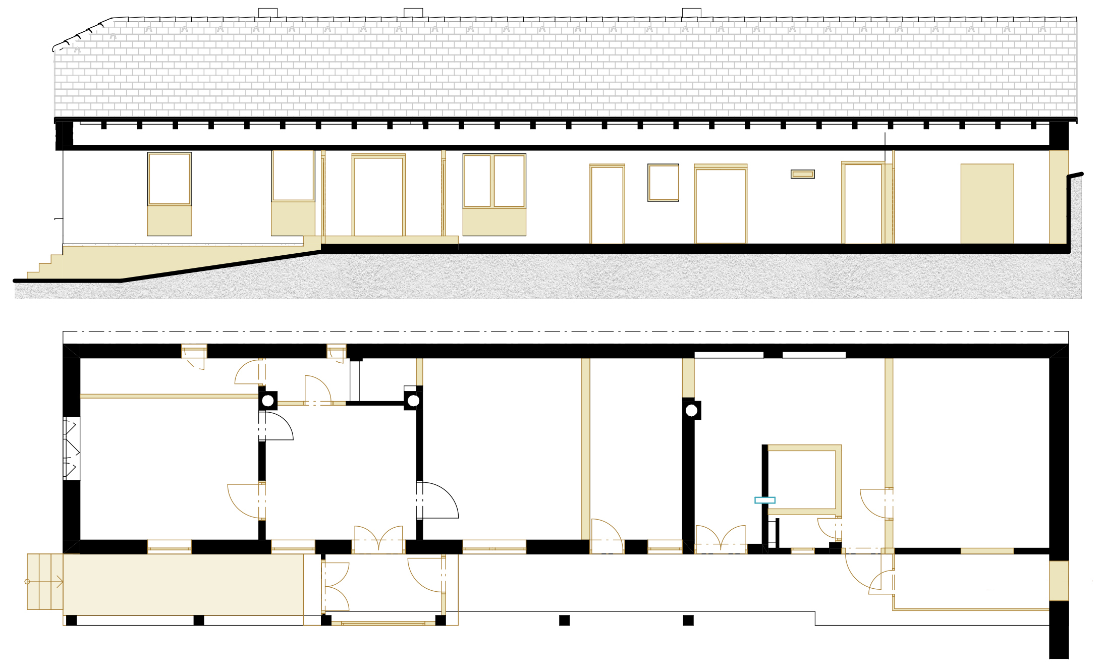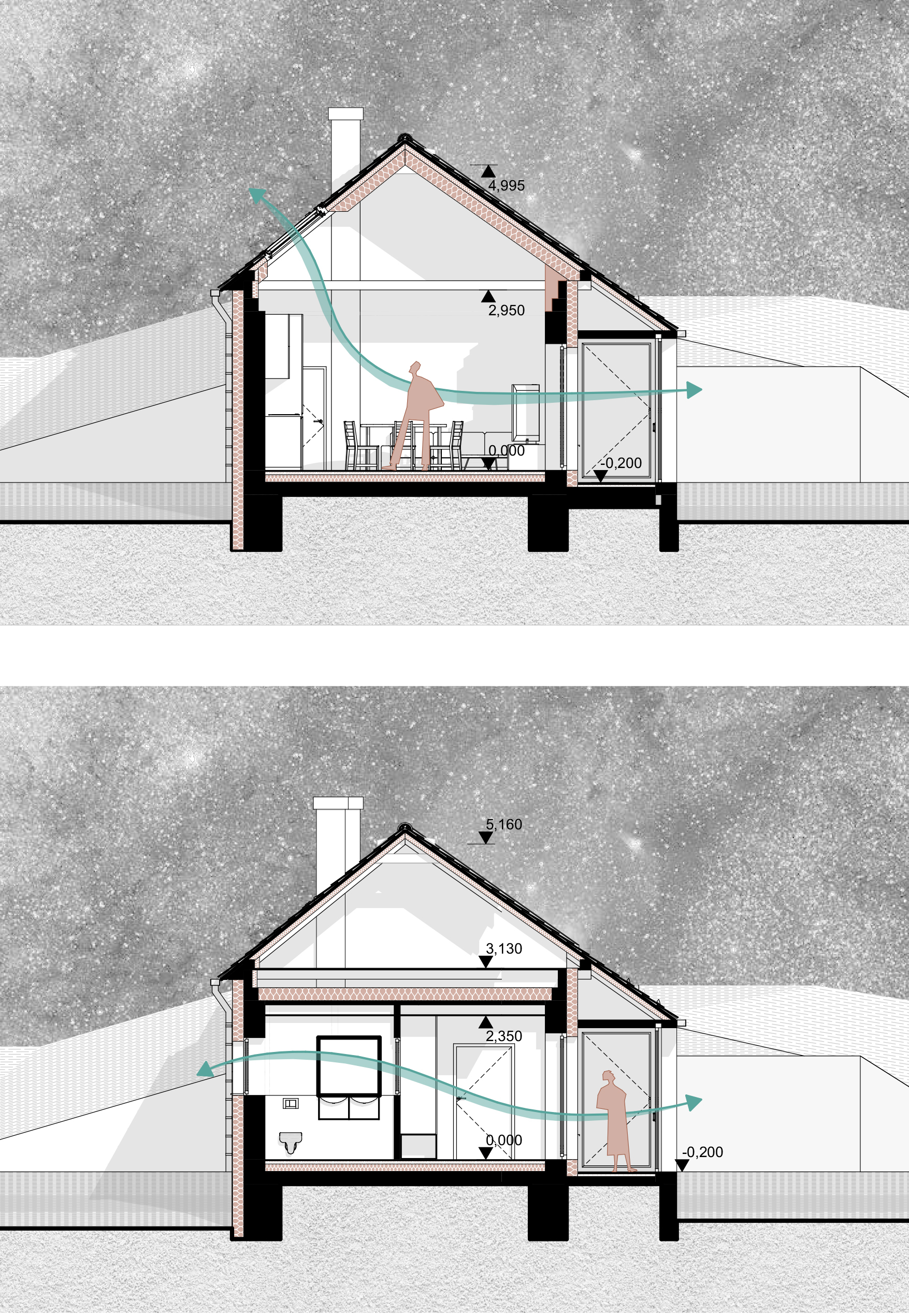Nástup do objektu je navrhnutý ako bezbariérový vďaka rampe, ktorá nahradí existujúce schody. Z rampy je prístupná zasklená časť gánku, ktorá prirodzene vytvára závetrie, z ktorého je možné vstúpiť cez hlavný vchod do zádveria. Hlavný vchod je navrhnutý v mieste pôvodného hlavného vchodu, z ktorého sa priamo dostaneme do hosťovskej spálne, spoločenskej zóny, pohotovostného WC a cez padacie dvierka so schodmi v strope aj do podkrovného priestoru, kde je v tejto časti navrhnutý sklad. Ďalšie padacie dvierka sú navrhnuté v kúpeľni (v súkromnej zóne), cez ktoré je sprístupnená technická miestnosť. Nad spoločenskou zónou (obývacia izba / jedáleň / kuchyňa) je navrhnutá galéria na celú svetlú výšku domu, kde budú odprezentované pôvodné drevené prvky krovu. Do tohto priestoru sa pri komíne osadia pôvodné kachle. Ďalšia možnosť osadenia kachlí je v spálni pri komíne. Pri kuchyni sa nachádza špajza, do ktorej je z nej priamo vstup.
