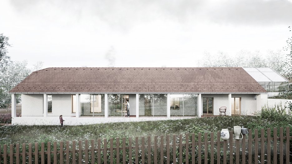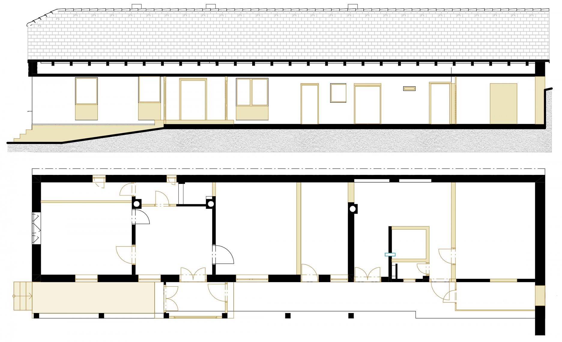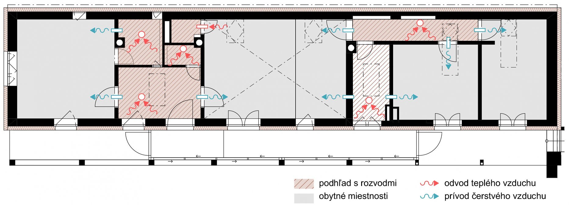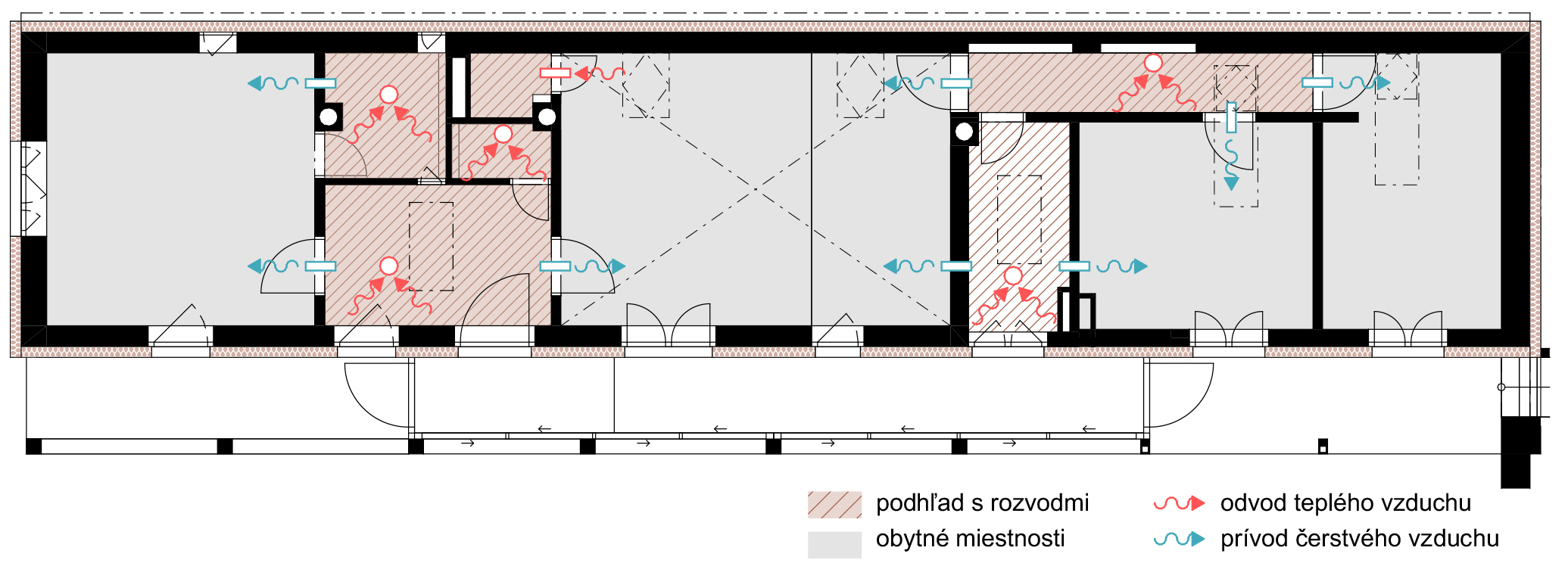 Pôvodná dispozícia domu nevyhovuje súčasným štandardom bývania a hlavným negatívom je, že priestory nie sú v rámci interiéru navzájom prepojené. Aj preto bolo potrebné v návrhu robiť intervencie, ktoré spočívajú v odstránení niektorých nenosných priečok. Snahou však bolo navrhnúť dispozíciu, pri ktorej by bolo možné zachovať čo najviac zabudovaných konštrukcií. Z hľadiska prevádzky je v návrhu dom rozdelený na 3 zóny. Prvá zóna (orientovaná k ceste) bude slúžiť ako hosťovská časť s vlastným hygienickým zázemím – môže slúžiť aj ako hlavná spálňa rodičov, alebo starých rodičov (pri viacgeneračnom bývaní). Do stredu objektu je navrhnutá spoločenská zóna, ktorá sa stáva ústredným priestorom celého domu a je priamo prístupná aj zo zaskleného priestoru gánku. To dovoľuje túto zónu rozšíriť o gánok v každom ročnom období. Treťou zónou je súkromná zóna v zadnej časti domu, v ktorej sa nachádzajú dve izby a kúpeľňa. Izby môžu byť ponímané ako dve detské izby, prípadne pri viacgeneračnom bývaní ako spálňa a detská izba.