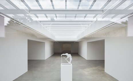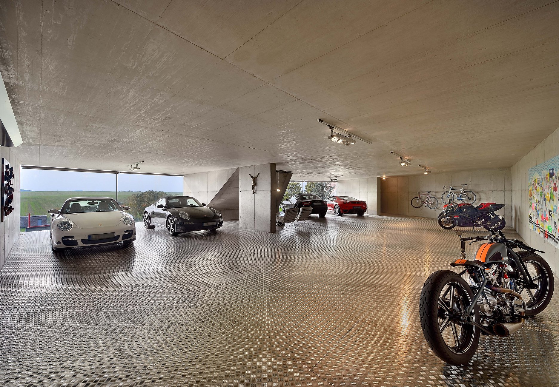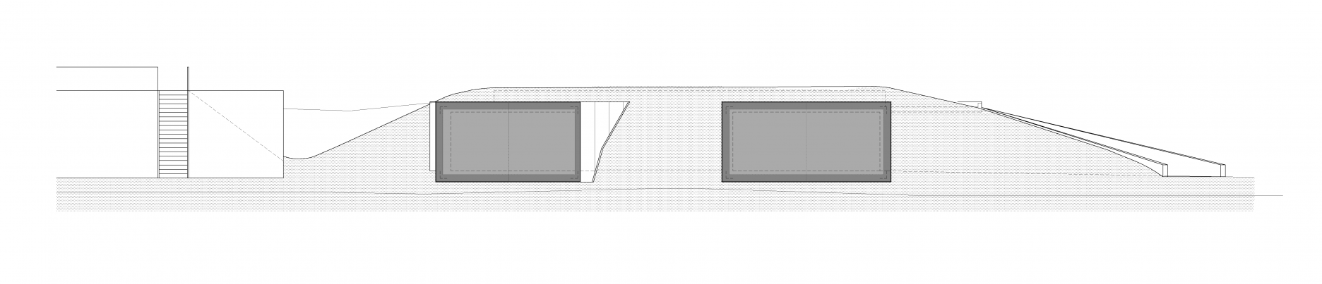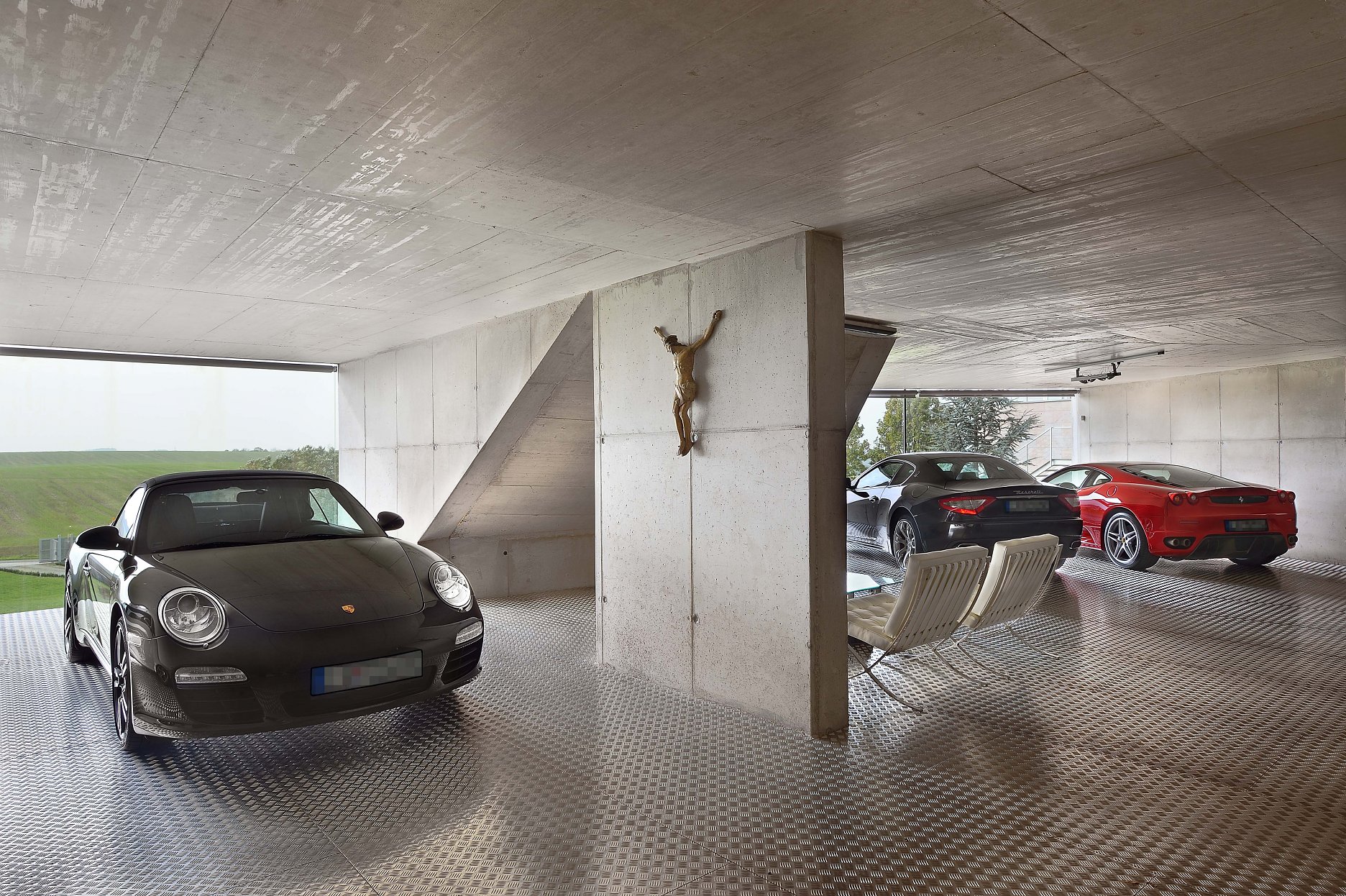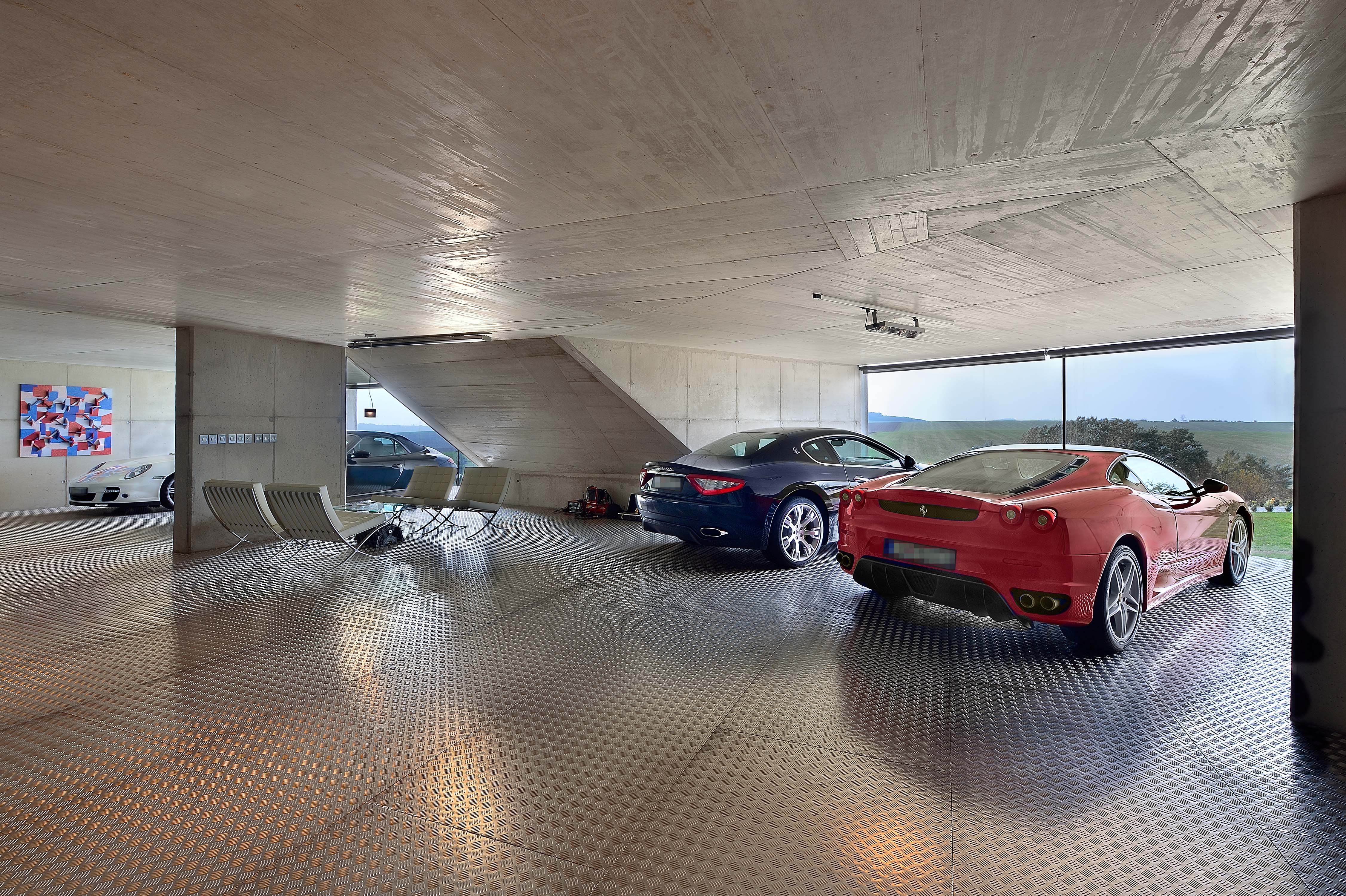 Z toho vznikla koncepcia podzemnej garáže bez podporných elementov, s dvomi výkladnými skriňami, ktoré tvoria živé prepojenie s exteriérom a jemne sa vznášajú nad terénom. Celková nosná konštrukcia je otočená nad dosku a schovaná pod násypom, čo nám pomohlo vytvoriť v interéri bezprievlakový rovný strop z pohľadového betónu. Podlaha je pre zjemnenie pocitu pokrytá hliníkovým plechom. Interierové osvetlenie je navrhnuté s možnosťou osvetľovania umeleckých diel, umiesnených po obvodových stenách.