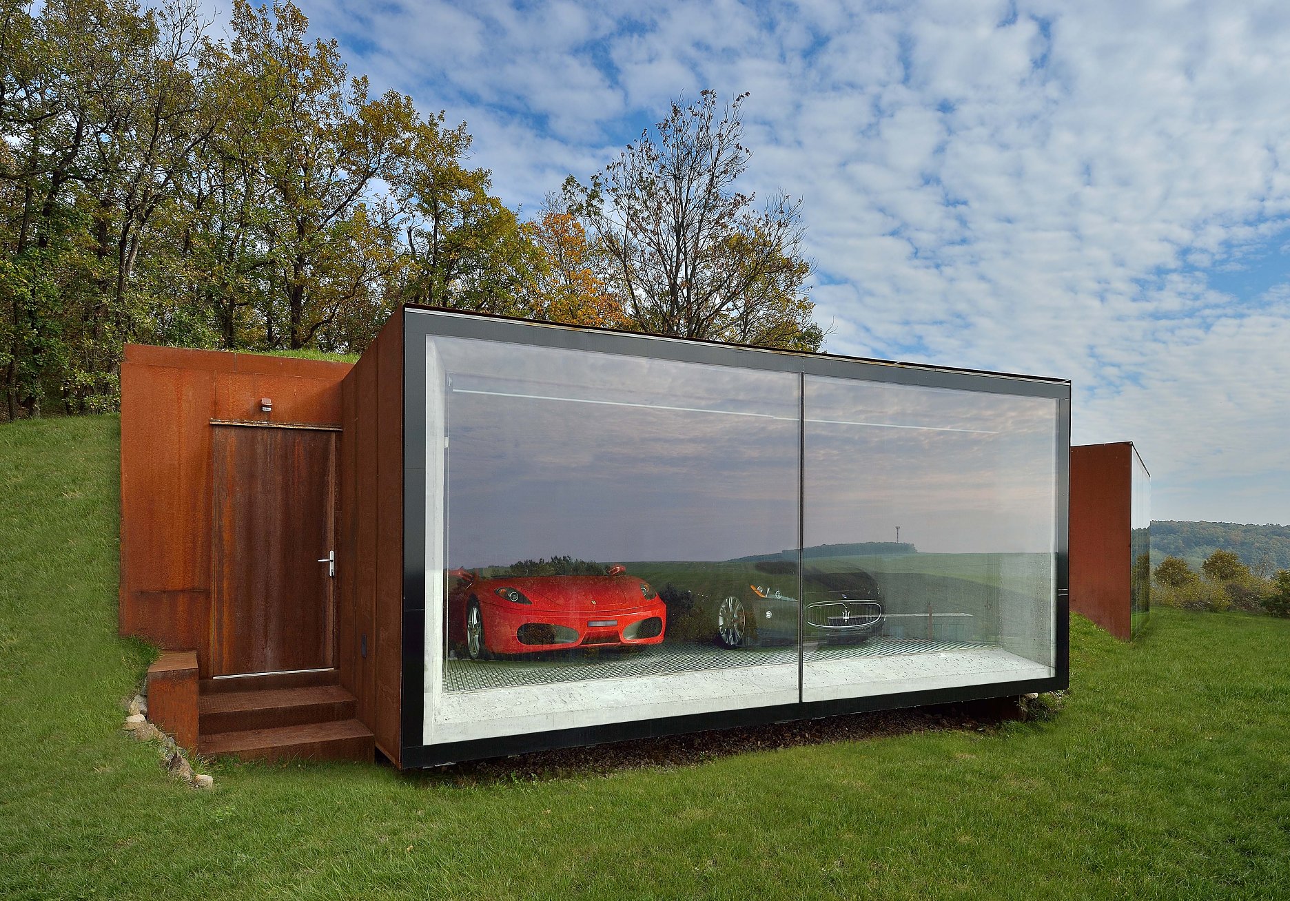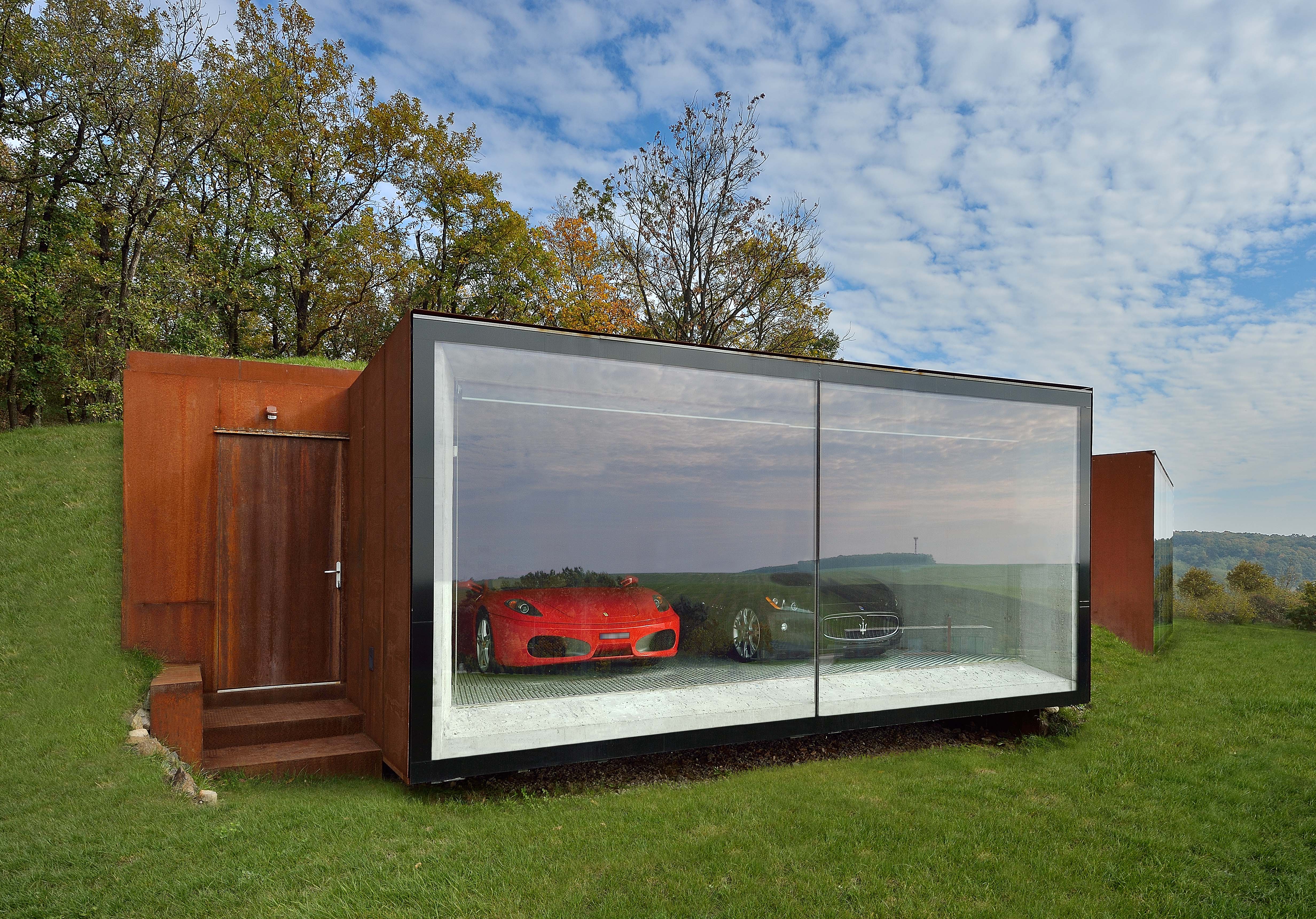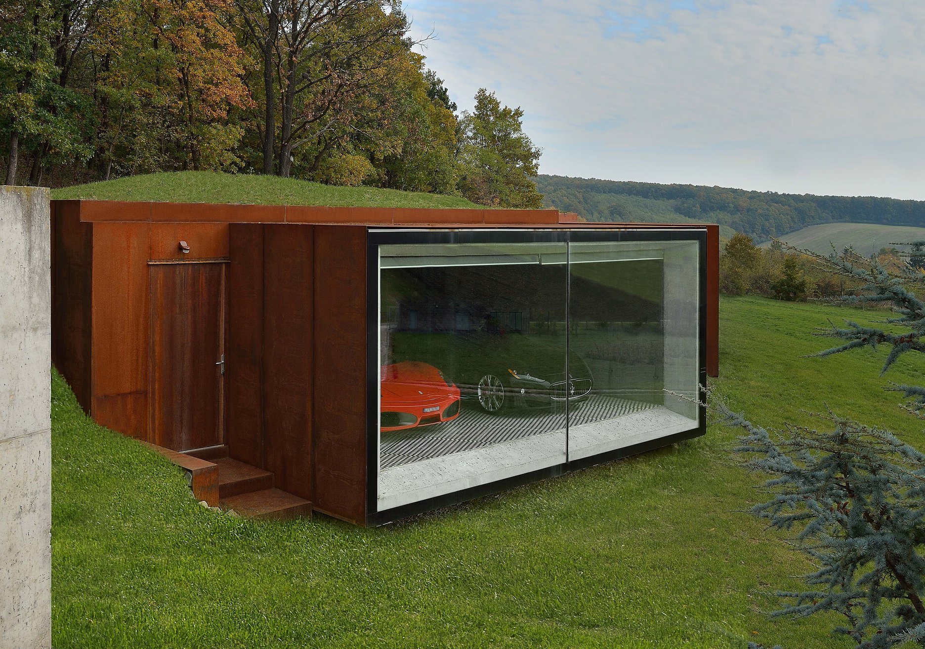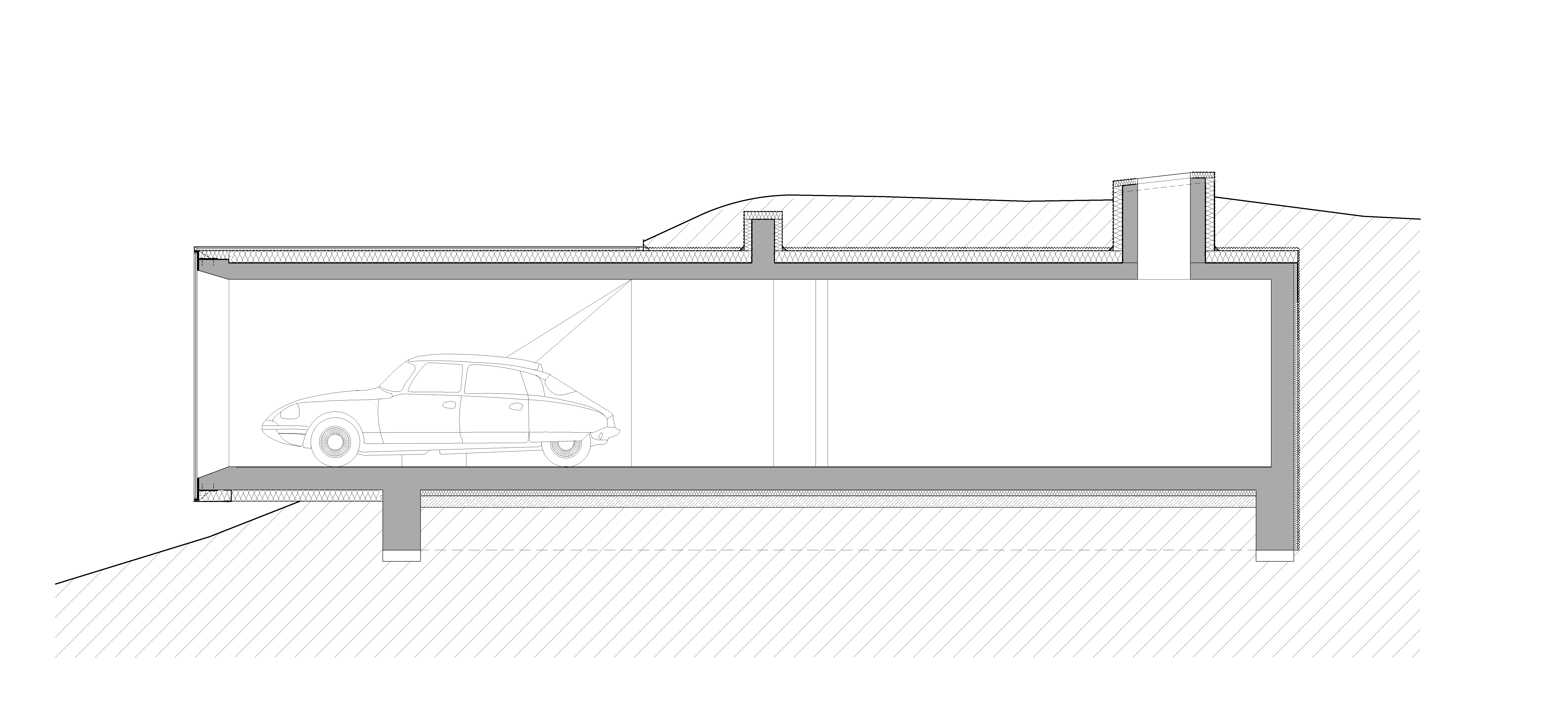 Zadanie projektu bolo vytvorenie priestoru pre uskladenie 6-8 zberatelskych áut s možnosťou príjemneho posedenia a umiestnenia umeleckých diel v tomto priestore. Keďže sa pozemok nachádza pod horou v blízkom kontakte s rodinnými domami, náš návrh sa snažil zachovať svoju nenápadnosť a podľa možnosti väčšinu obostavaného priestoru zasadiť do svahovitého terénu. Na druhej strane sme chceli investorovi dopriať zážitok z výhľadu na jemne svahovitý terén v okolí a možnosť pokochať sa pohľadom na jeho autopark pri príchode.