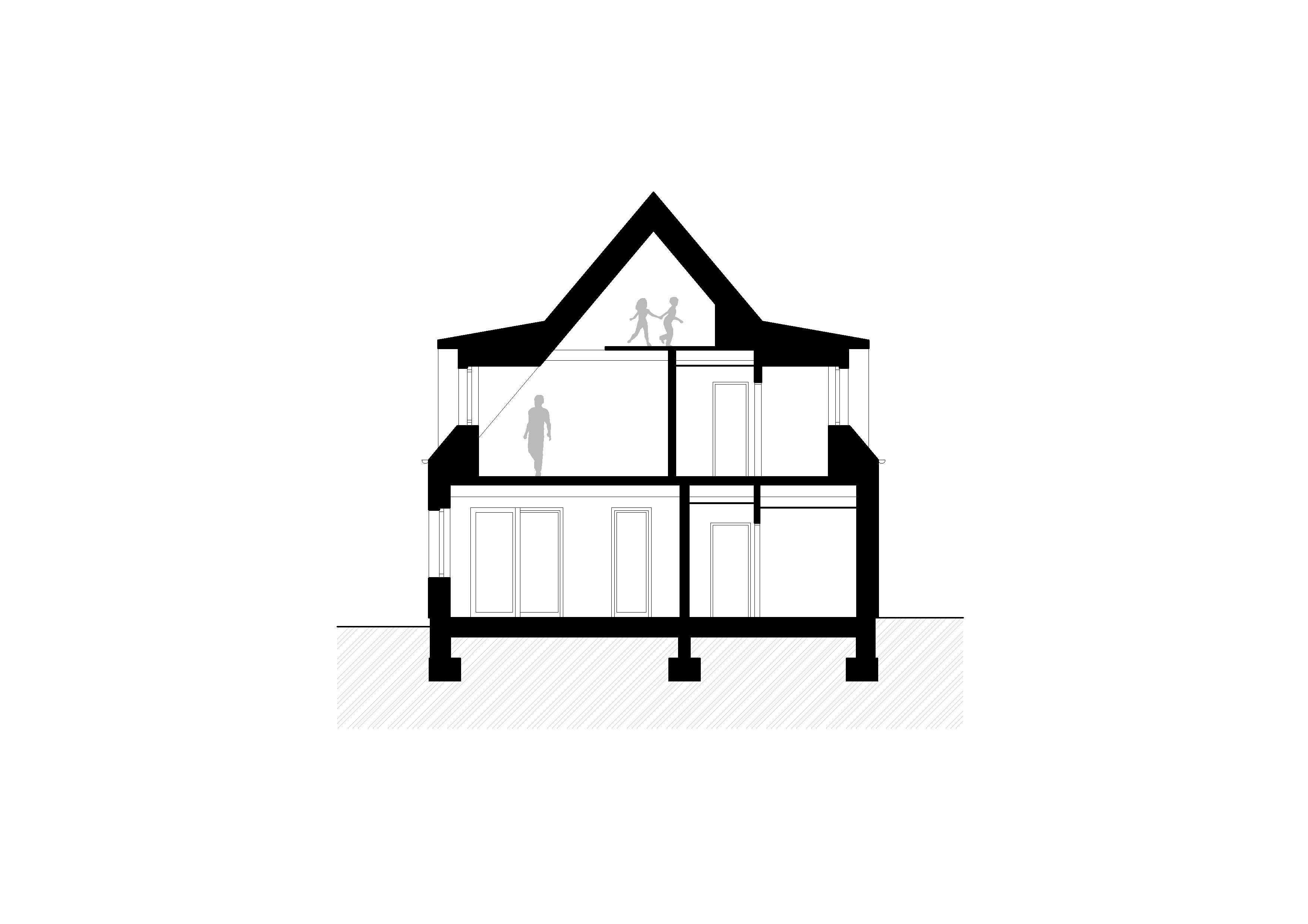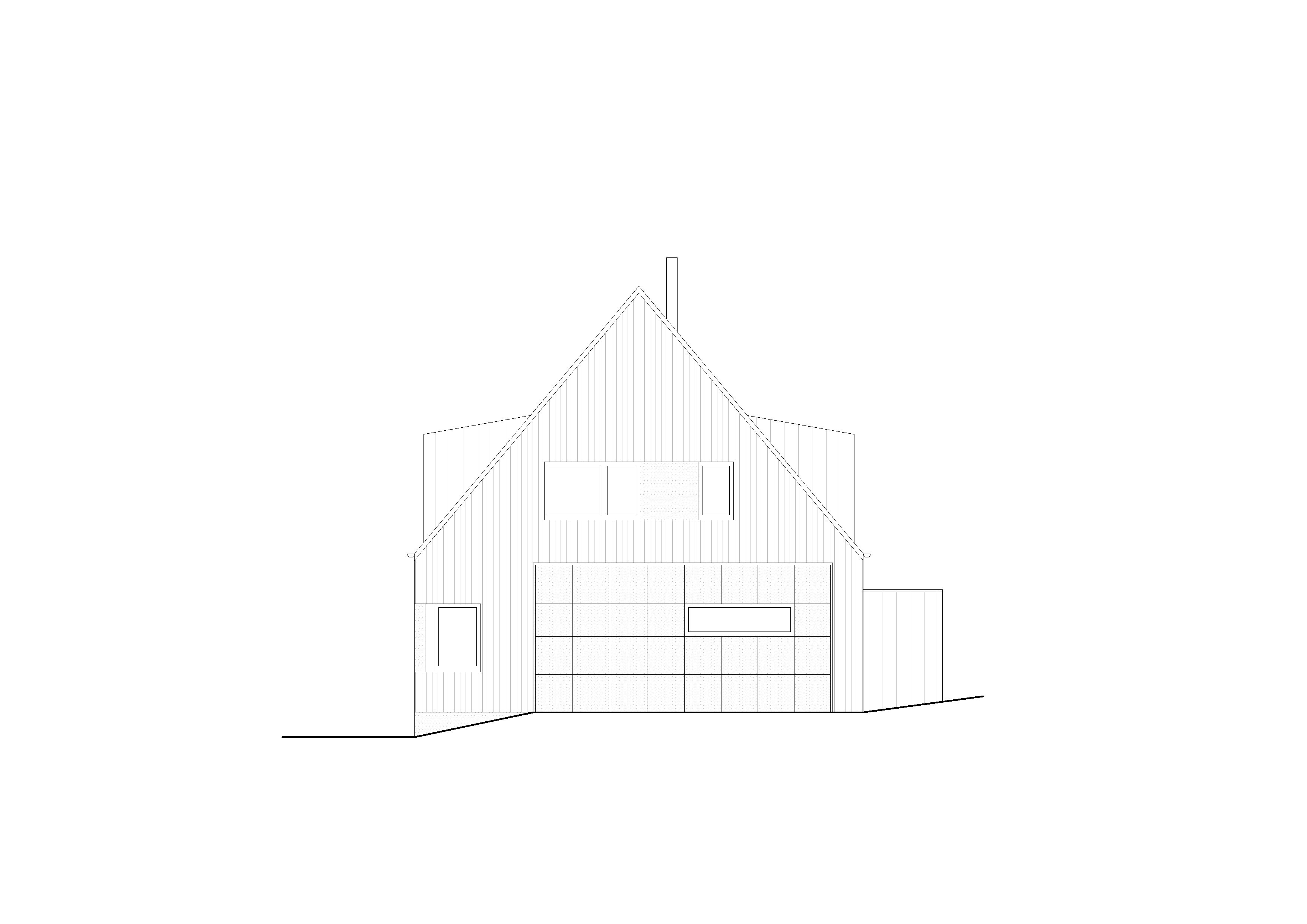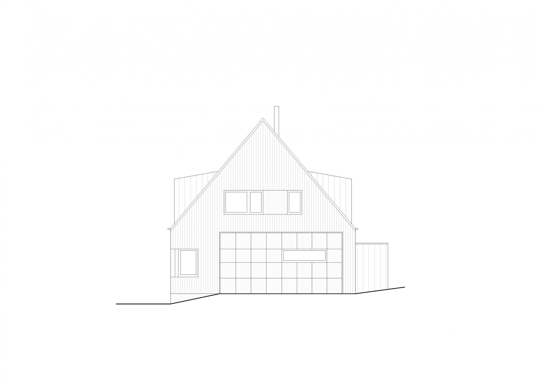 Hlavný objem domu s obdĺžnikovým pôdorysom 15 x 10 m zastrešuje klasická sedlová strecha. K nej prilieha jednopodlažný obslužný a technický trakt s plochou strechou.