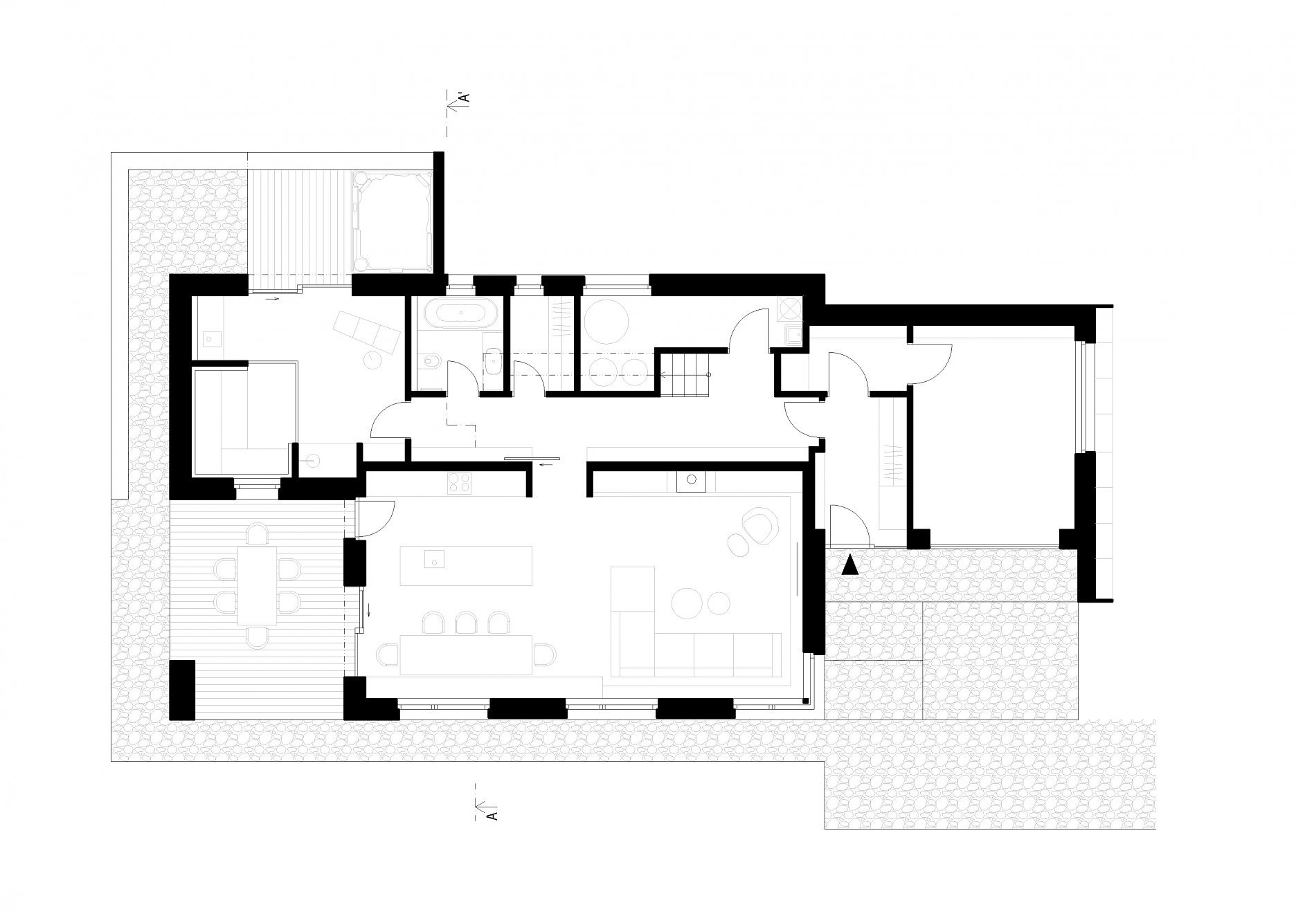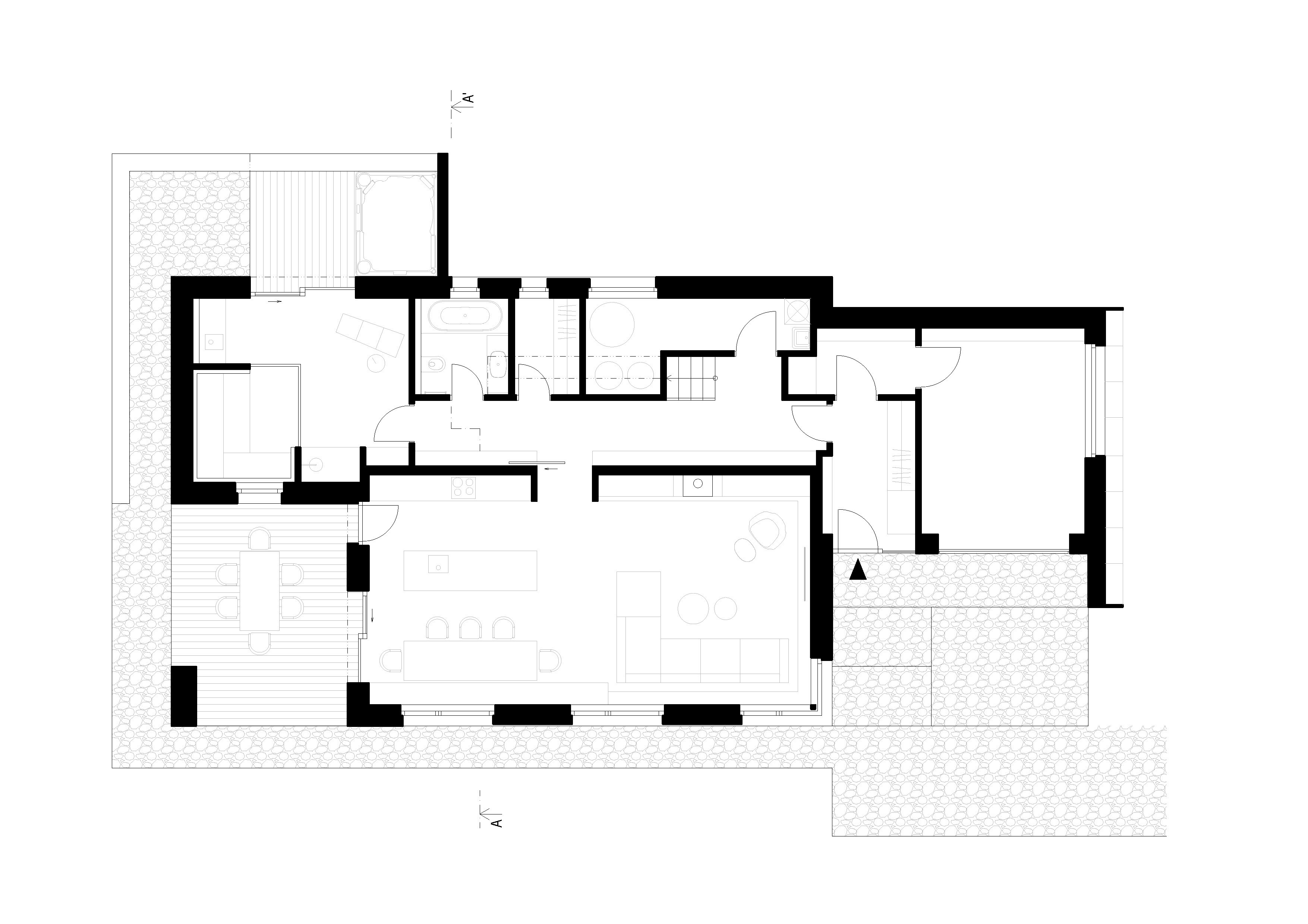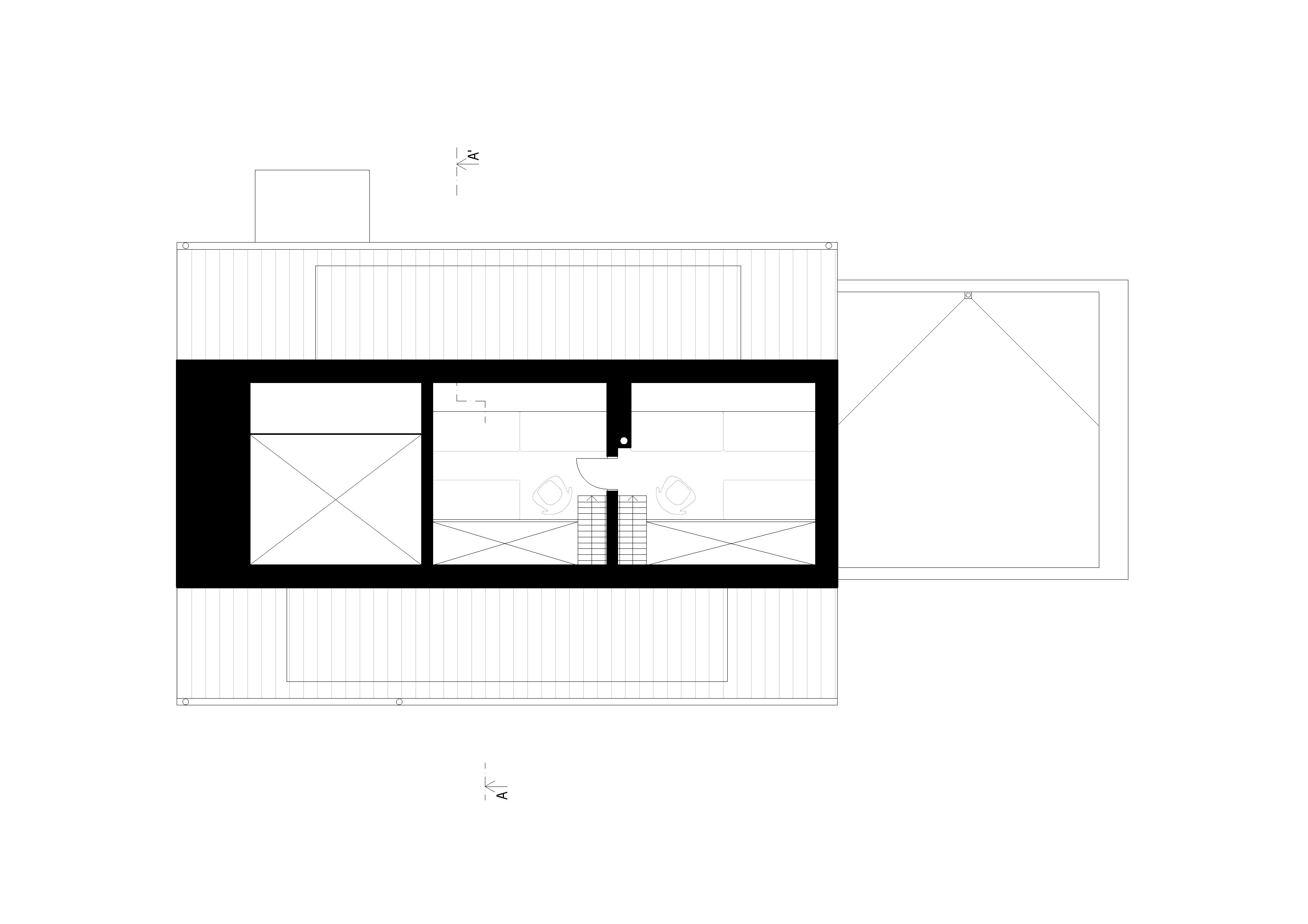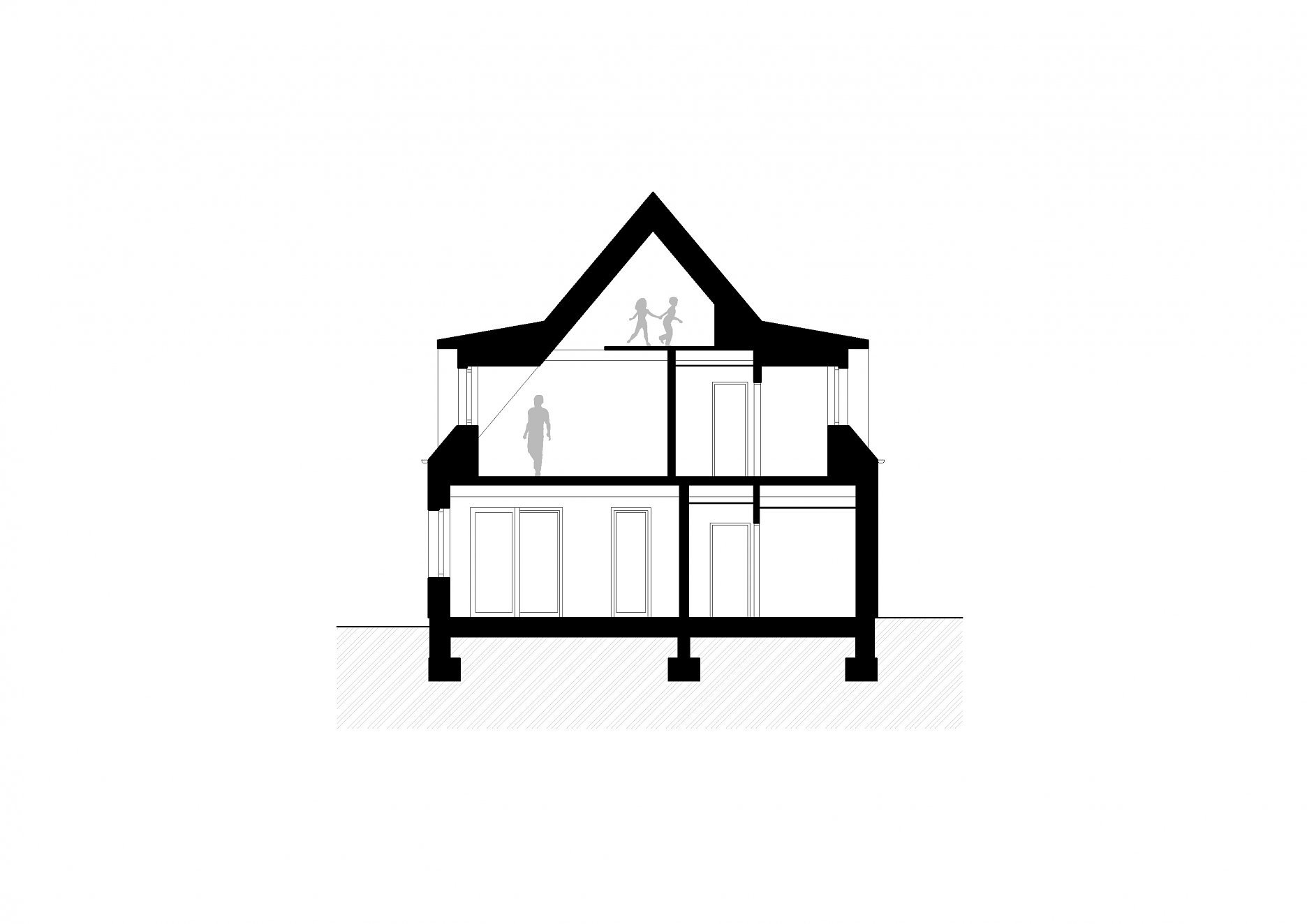 Hlavný objem domu s obdĺžnikovým pôdorysom 15 x 10 m zastrešuje klasická sedlová strecha. K nej prilieha jednopodlažný obslužný a technický trakt s plochou strechou.