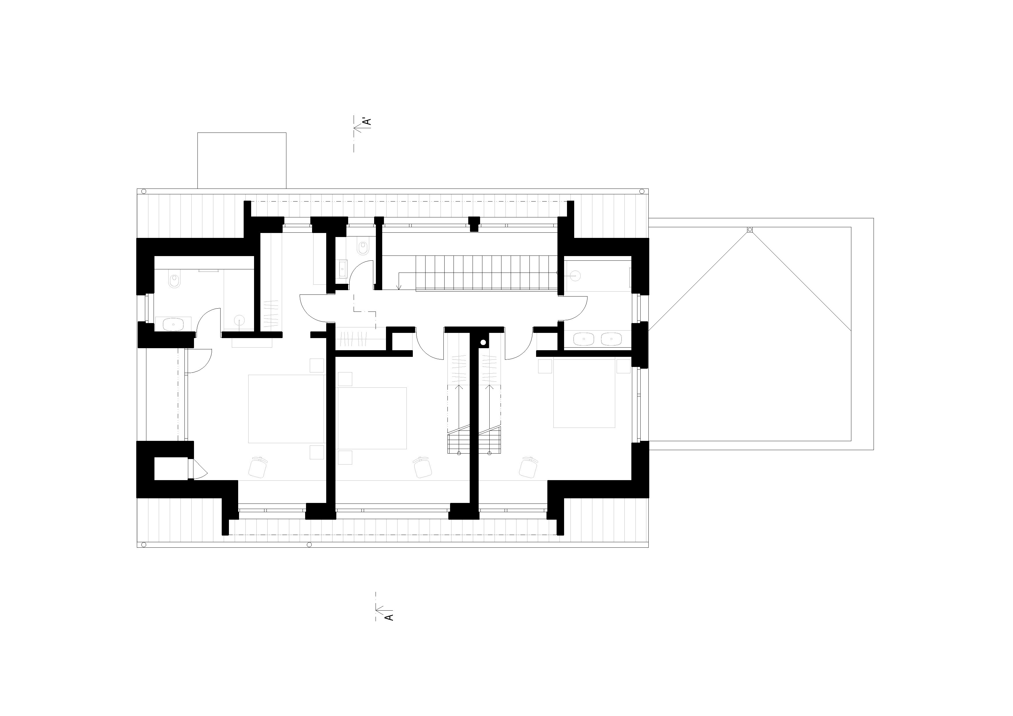Z chodby vedie jednoramenné schodisko do nočnej časti s tromi spálňami, dvojicou kúpeľní a samostatným WC. Hlavnú spálňu rozširuje lodžia na severnej fasáde. Zvyšné dve spálne, kde príležitostne prespávajú hostia, nájdeme ešte o poschodie vyššie v štíte strechy.