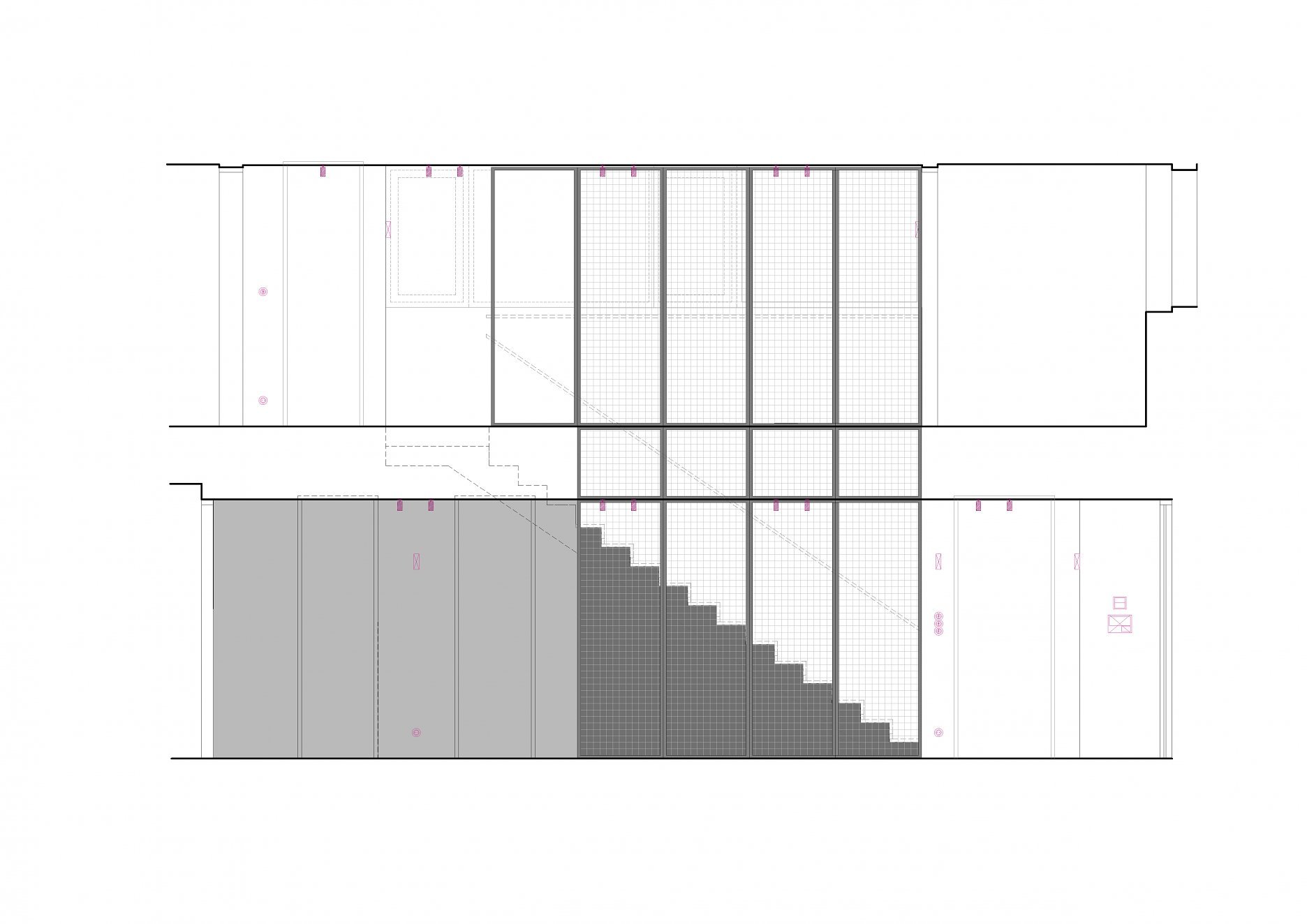 Hutné kovové prvky prepájajú blok knižnice s krbom a priestorom kuchynskej linky. Dúhová kresba plechu vynikne na obložení telesa krbu, hrúbka masívnych kovových plátov v detailoch knižnice. Tmavá ferebnosť prepája obývací priestor s chodbou a schodiskom.