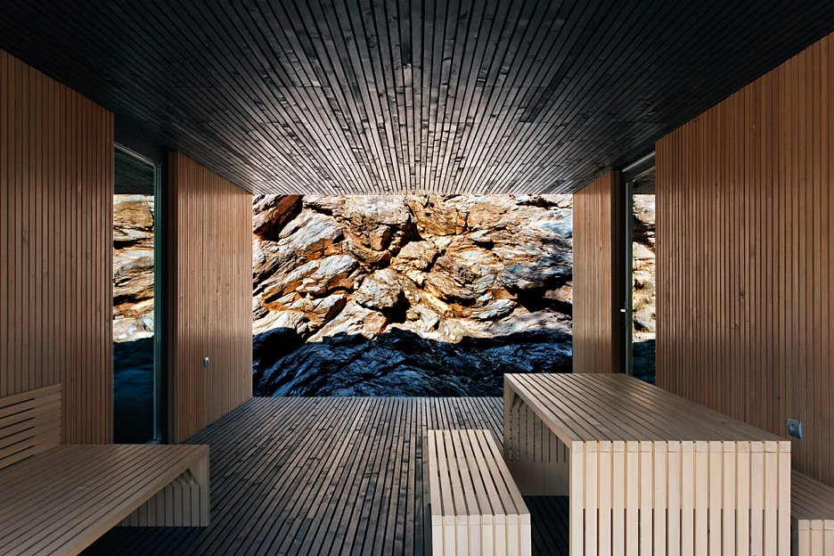 Kontrast medzi naturálnym povrchom smrekovcového obkladu fasády, napusteného tmavou impregnáciou a minimalistickým dizajnom interiéru, ktorý sa vyznačuje častým použitím bielych prvkov, vytvára vzrušujúce napätie medzi materiálmi a formami. Je to umocnené ešte optickým kontaktom medzi interiérom a surovými kamennými prvkami v exteriéri.