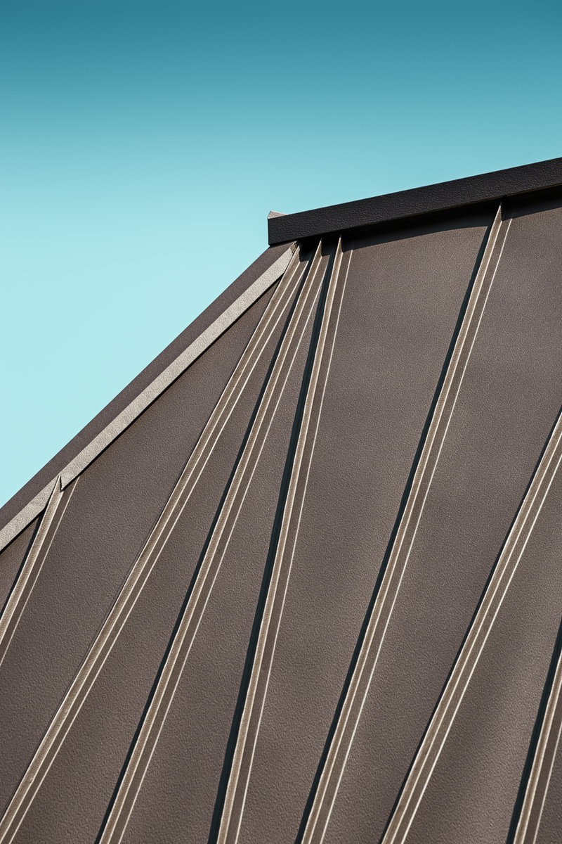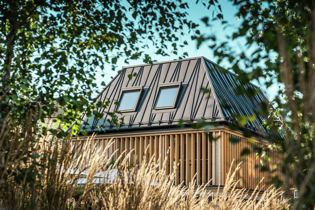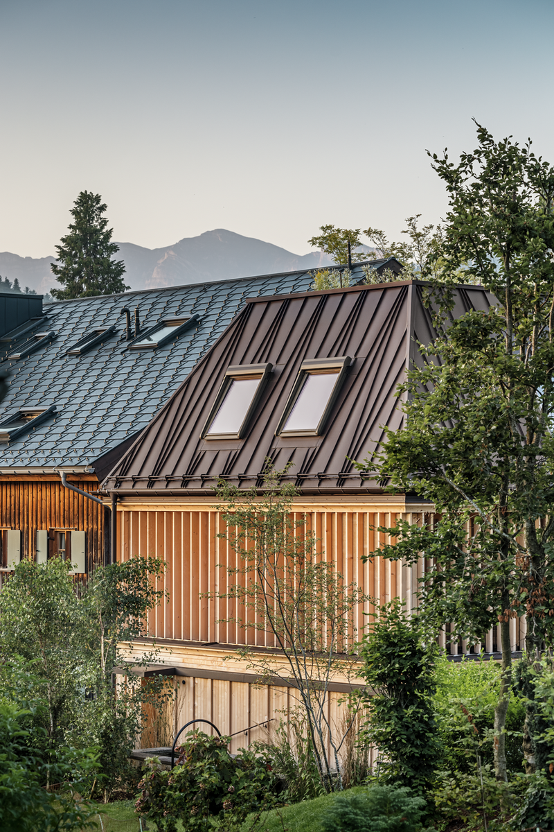 Použité materiály a riešenia: strešný systém PREFALZ vo farbe P.10 - orieškovohnedá.