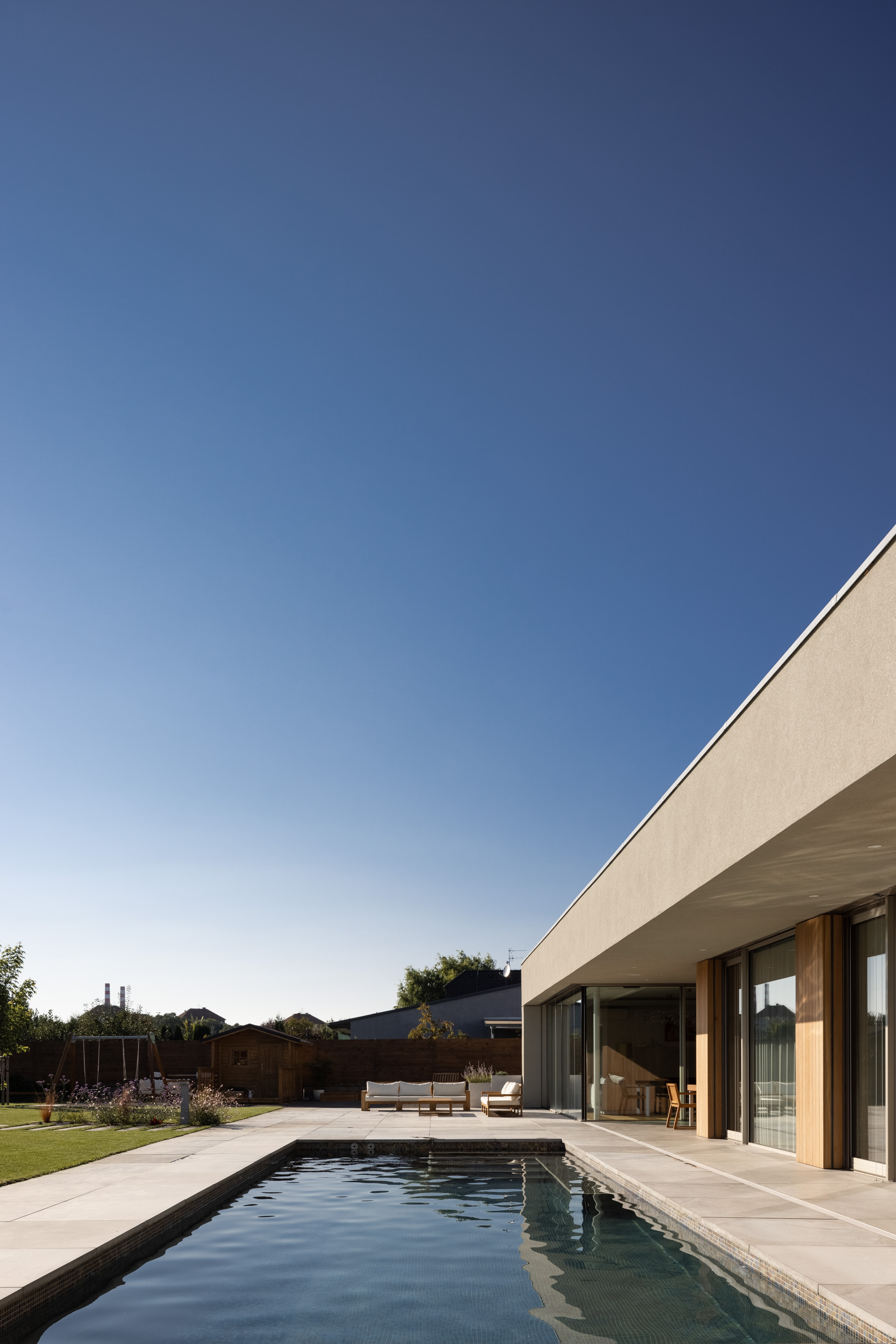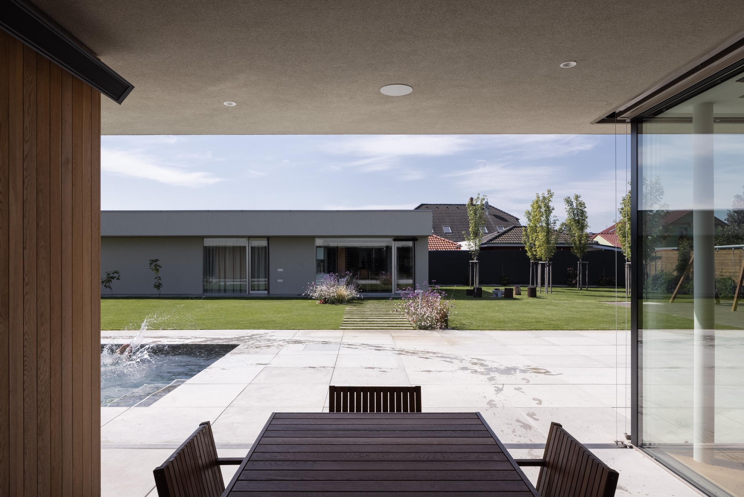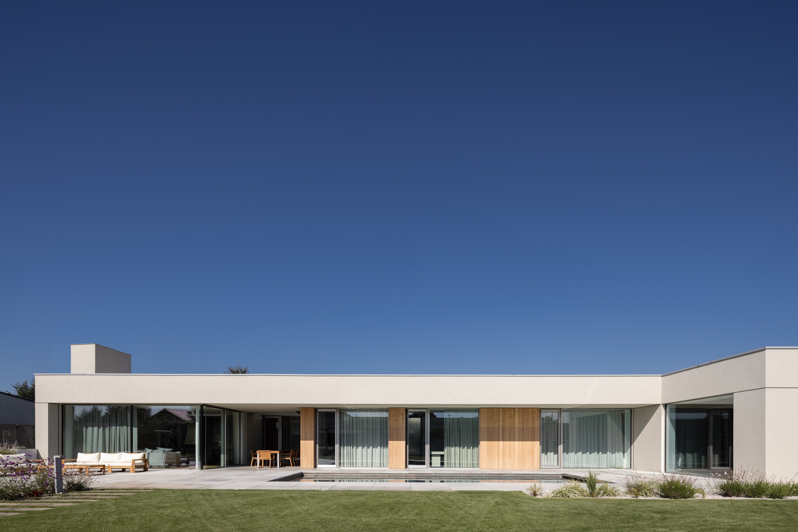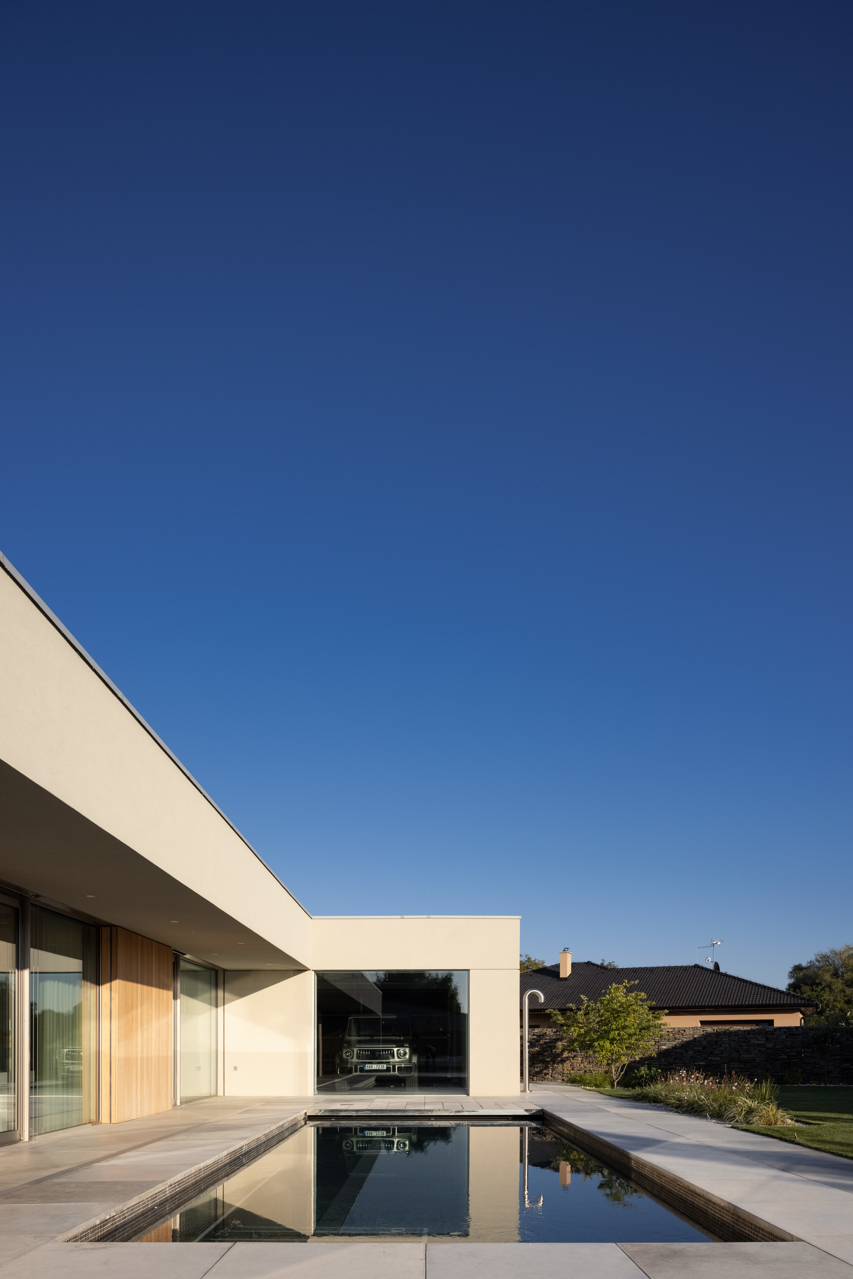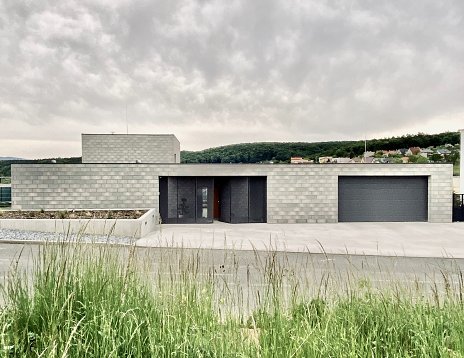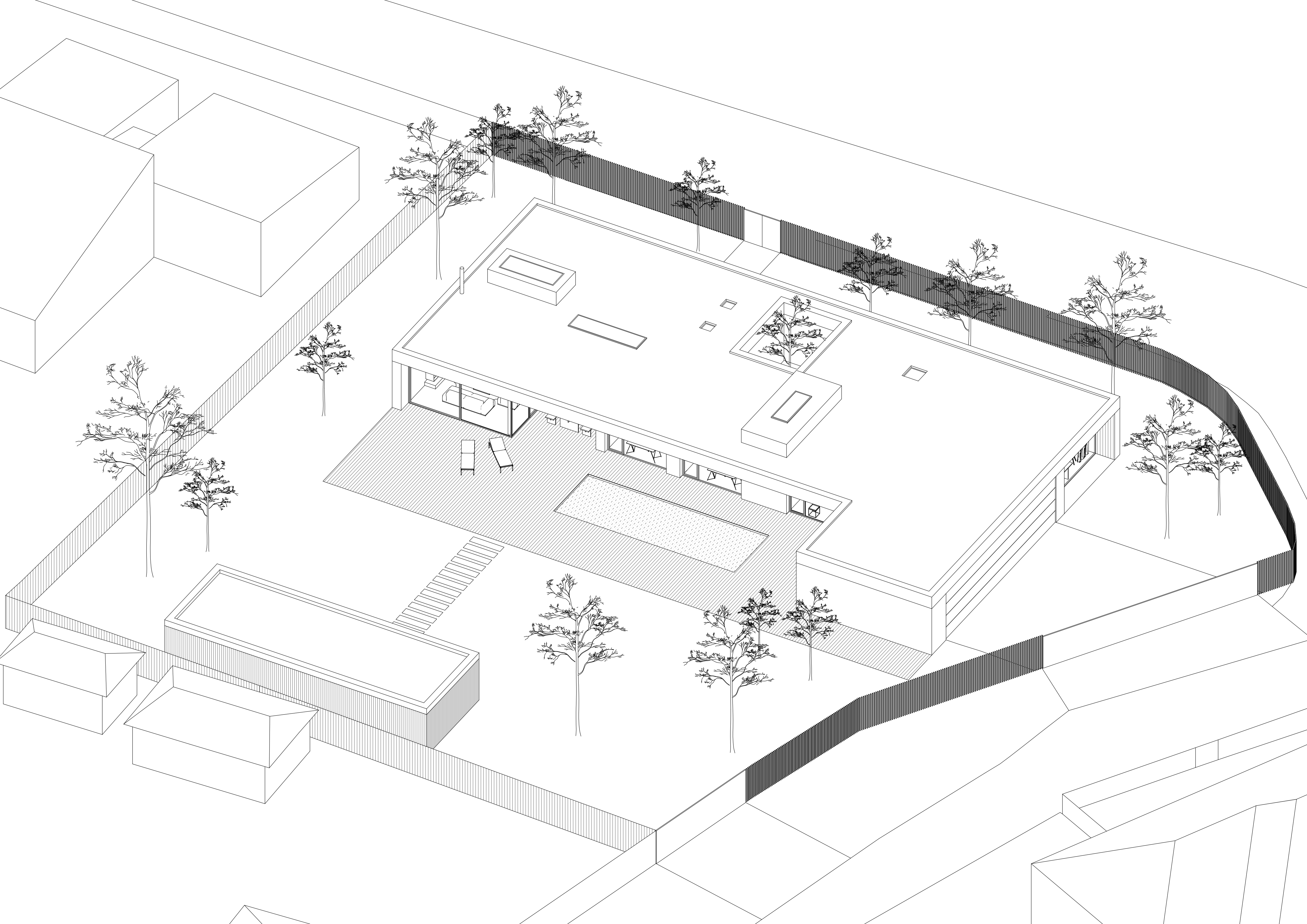 Vytvárame členitý dom, pričom strecha zámerne zostáva kompaktná. V rôznej miere prekrýva átria no zároveň ju niekde zámerne vypúšťame. Použitím svetlíkov vpúšťame do domu svetlo a vytvárame tak ďalší dynamicky meniaci sa element. Dom má rôzne zákutia a atmosféry, niekde sa viac otvára, na druhej strane zase introvertne uzatvára. Zádverie sa stáva hlavným komunikačným priestorom domu a rozdeľuje priestor na spoločenský a obytný trakt. Obývací priestor spolu s izbami je otočný do záhrady, otvára sa na terasu s bazénom. V osi domu je situovaný záhradný domček, ktorý slúži ako spoločenská miestnosť a hosťovská izba či sklad. Pracujeme s jednoduchou materialitou, nechávame vyznieť samotnú štruktúru domu a hru svetla na čistých plochách.