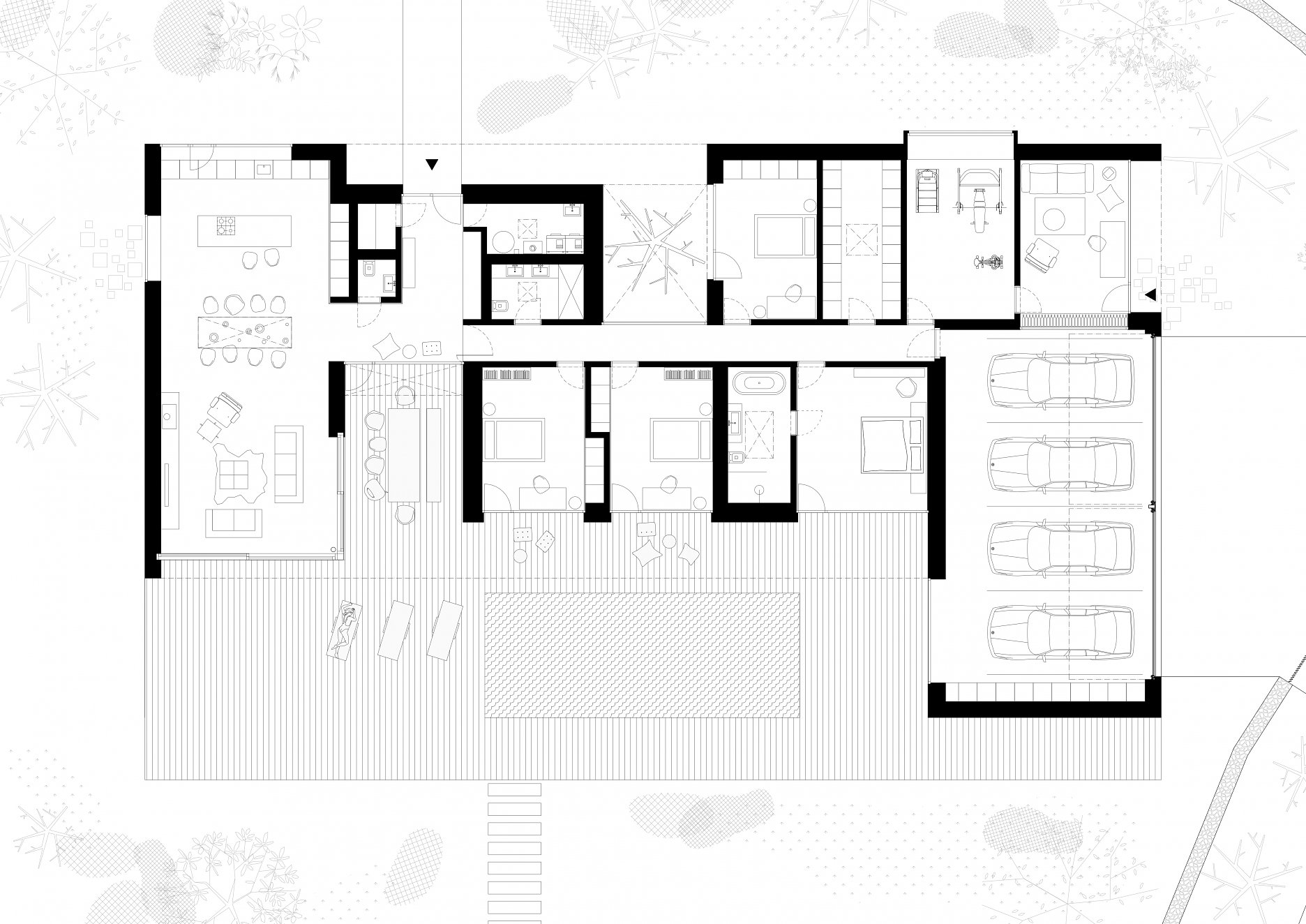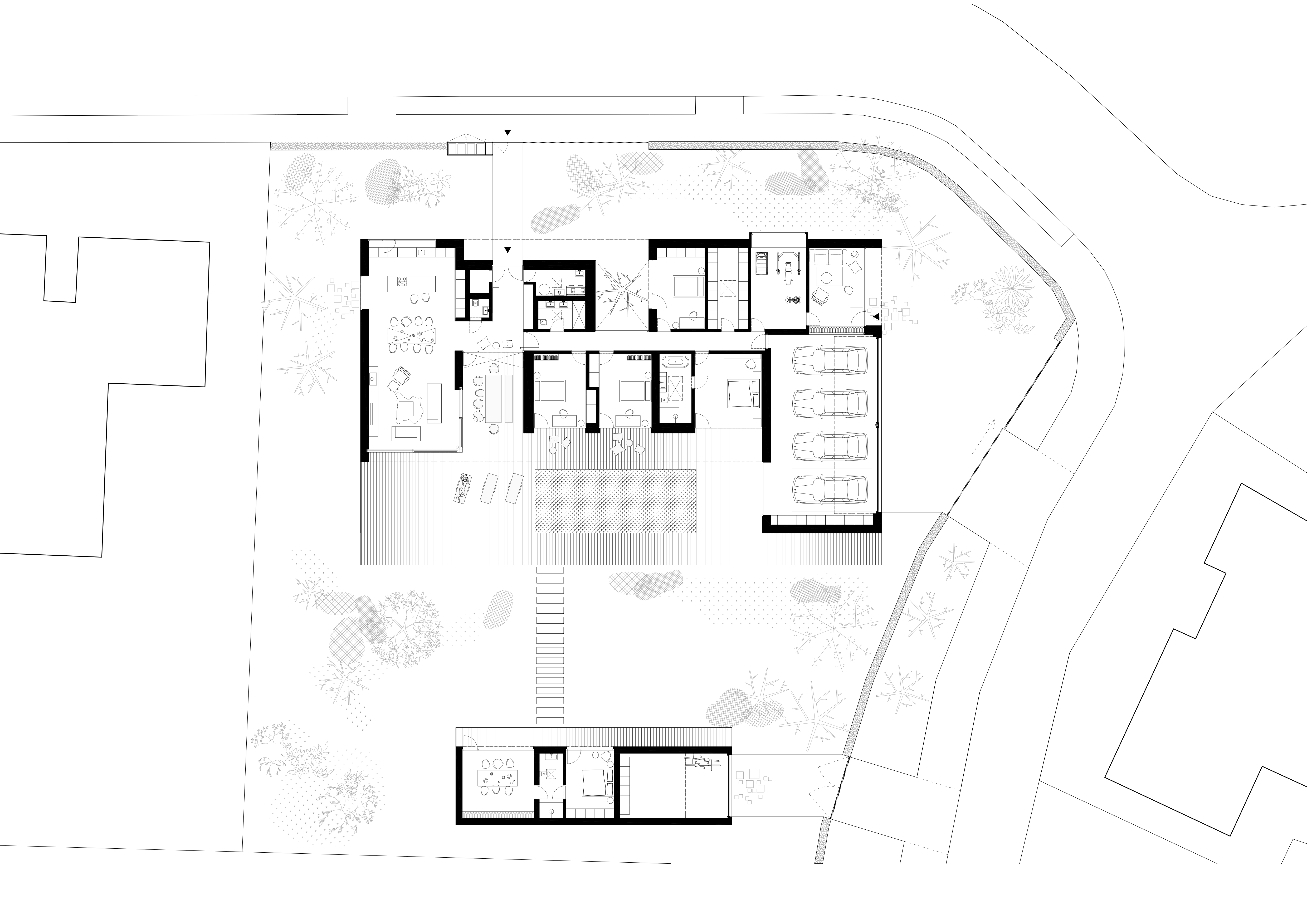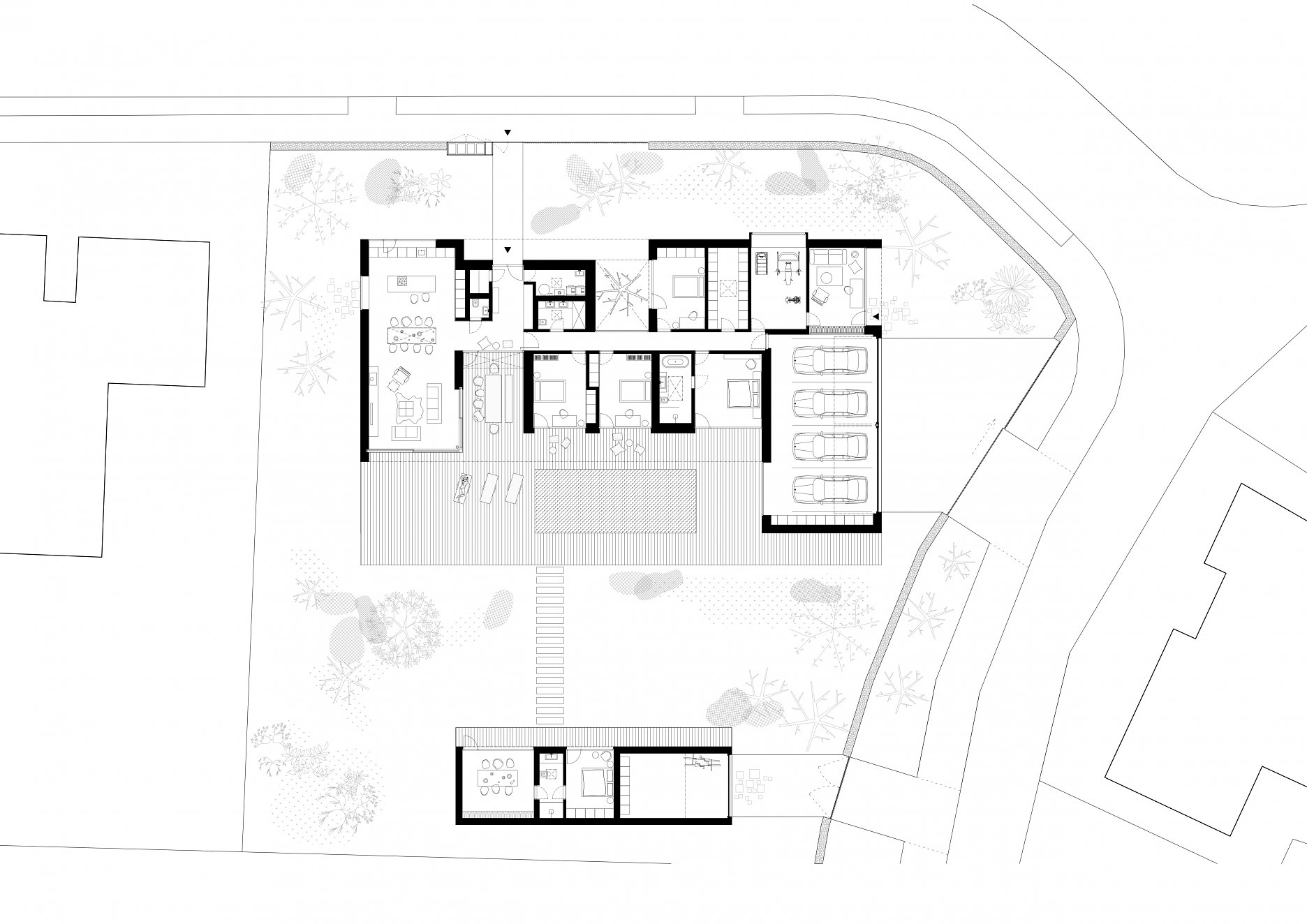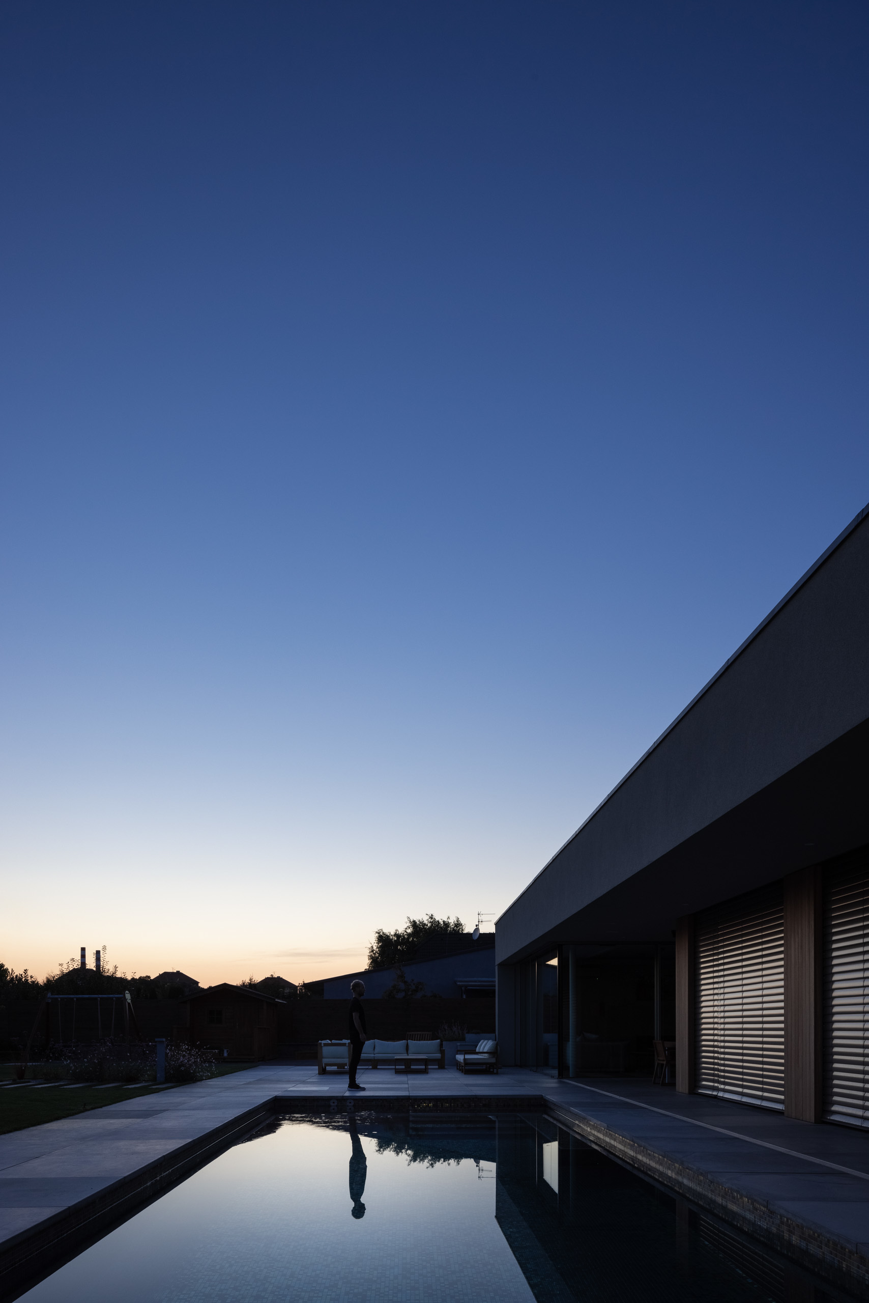 Vytvárame členitý dom, pričom strecha zámerne zostáva kompaktná. V rôznej miere prekrýva átria no zároveň ju niekde zámerne vypúšťame. Použitím svetlíkov vpúšťame do domu svetlo a vytvárame tak ďalší dynamicky meniaci sa element. Dom má rôzne zákutia a atmosféry, niekde sa viac otvára, na druhej strane zase introvertne uzatvára. Zádverie sa stáva hlavným komunikačným priestorom domu a rozdeľuje priestor na spoločenský a obytný trakt. Obývací priestor spolu s izbami je otočný do záhrady, otvára sa na terasu s bazénom. V osi domu je situovaný záhradný domček, ktorý slúži ako spoločenská miestnosť a hosťovská izba či sklad. Pracujeme s jednoduchou materialitou, nechávame vyznieť samotnú štruktúru domu a hru svetla na čistých plochách.