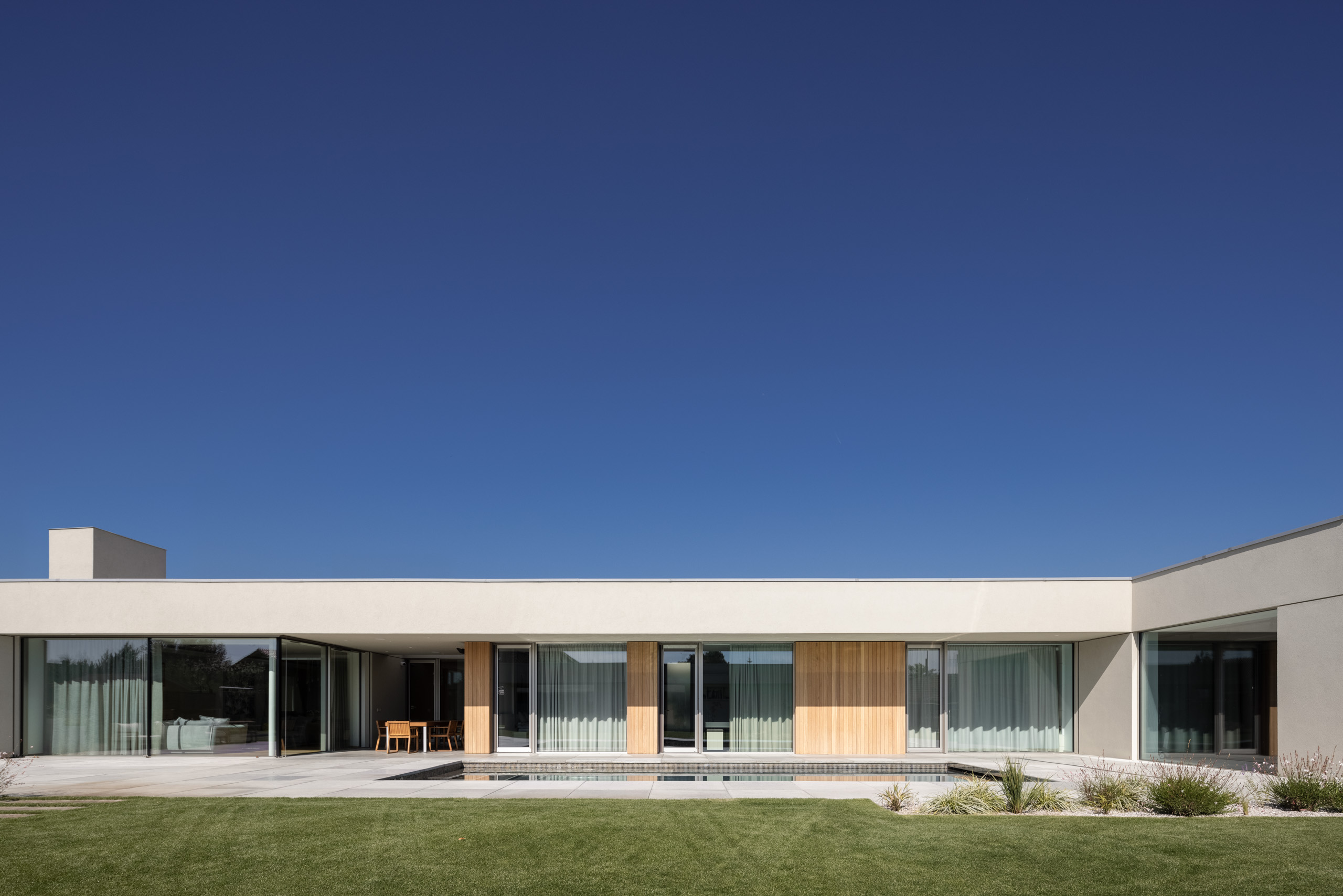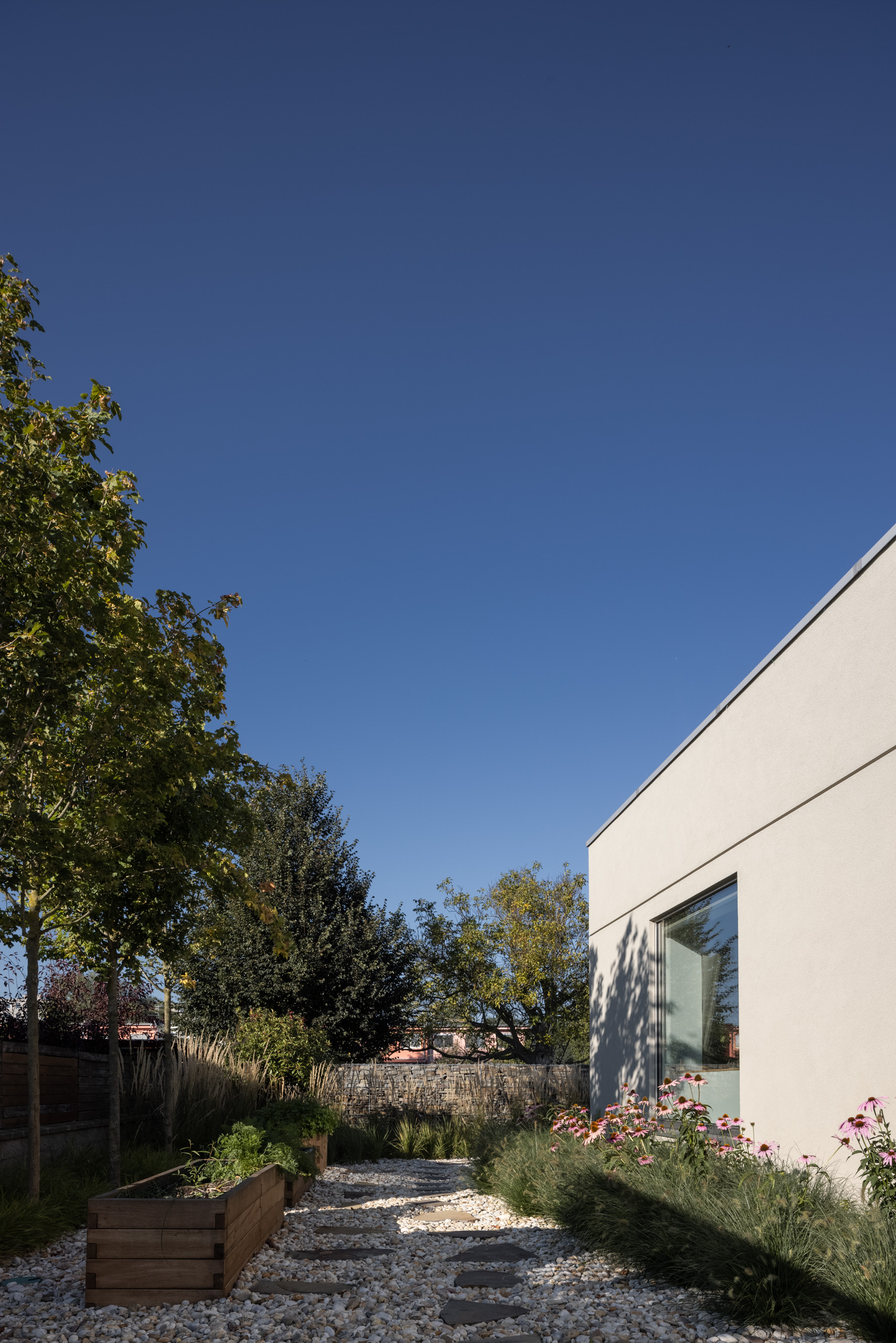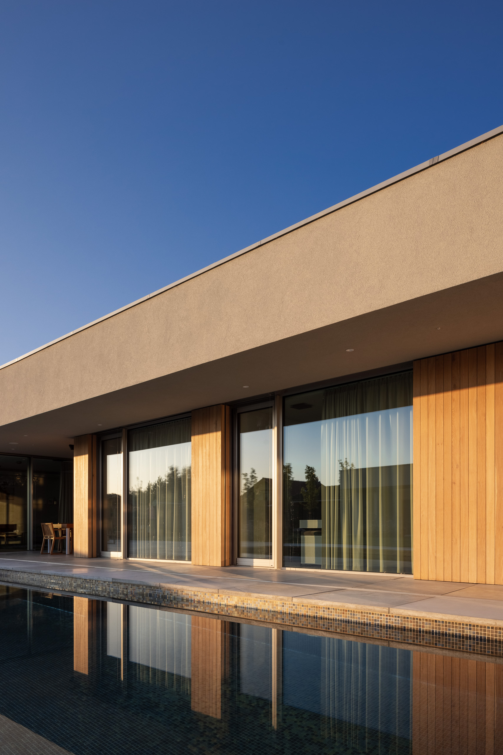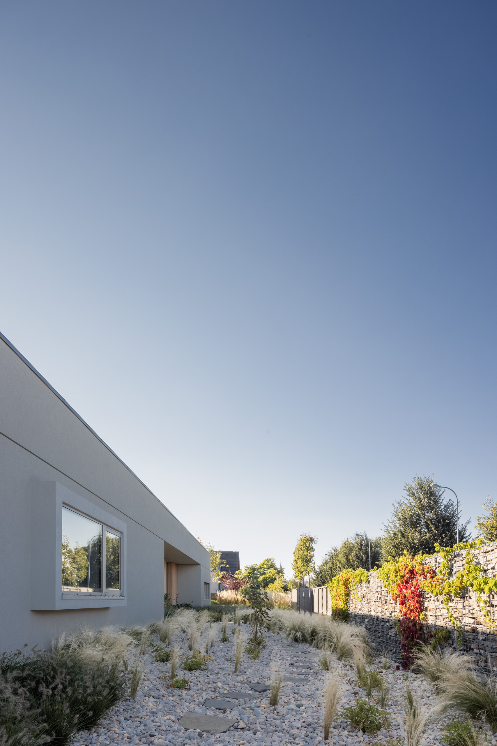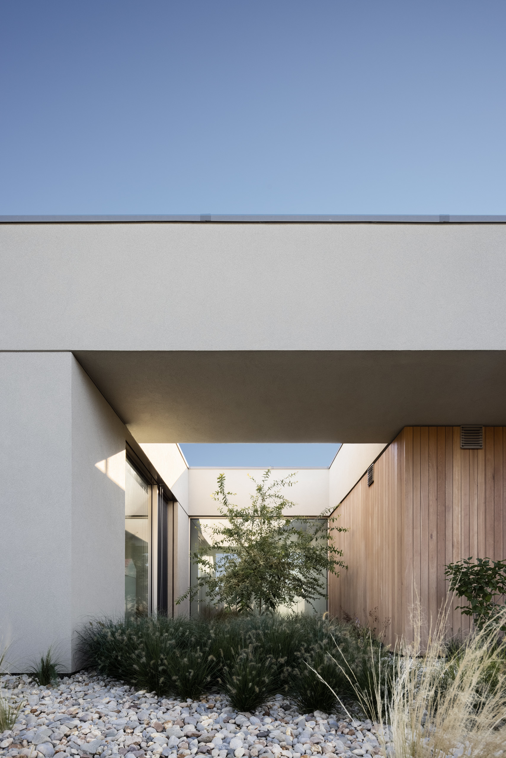 Vytvárame členitý dom, pričom strecha zámerne zostáva kompaktná. V rôznej miere prekrýva átria no zároveň ju niekde zámerne vypúšťame. Použitím svetlíkov vpúšťame do domu svetlo a vytvárame tak ďalší dynamicky meniaci sa element. Dom má rôzne zákutia a atmosféry, niekde sa viac otvára, na druhej strane zase introvertne uzatvára. Zádverie sa stáva hlavným komunikačným priestorom domu a rozdeľuje priestor na spoločenský a obytný trakt. Obývací priestor spolu s izbami je otočný do záhrady, otvára sa na terasu s bazénom. V osi domu je situovaný záhradný domček, ktorý slúži ako spoločenská miestnosť a hosťovská izba či sklad. Pracujeme s jednoduchou materialitou, nechávame vyznieť samotnú štruktúru domu a hru svetla na čistých plochách.